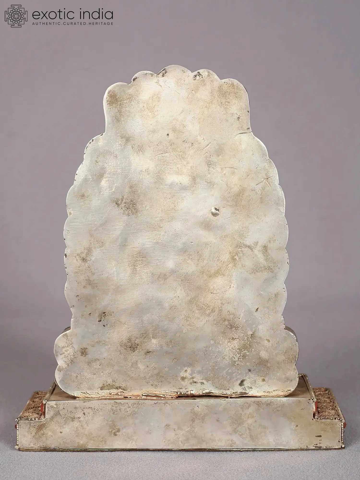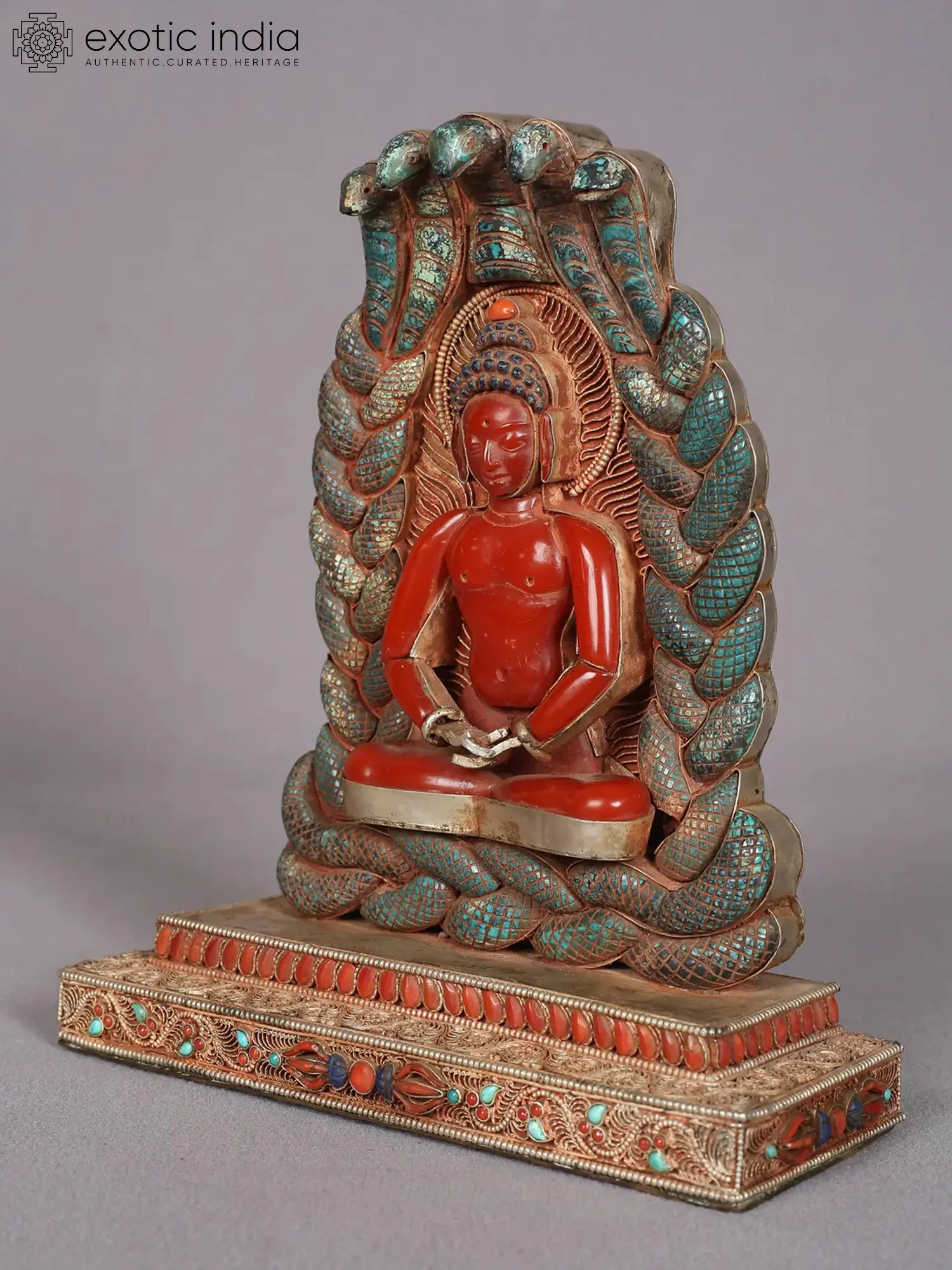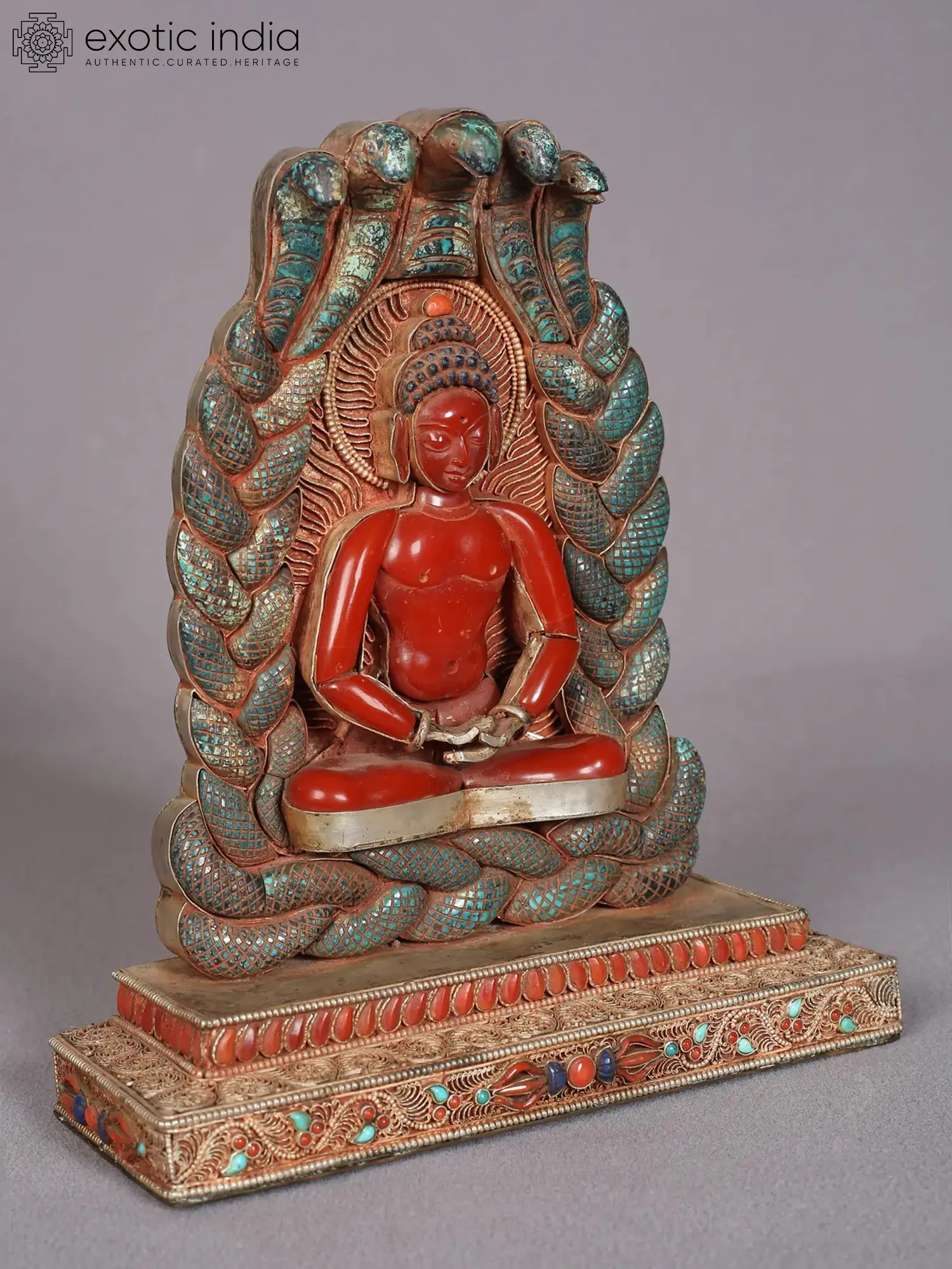 Enriched with the ideas and symbolism of Vajrayana Buddhism, this silver statue of Buddha from Nepal is an artwork worthy of deeper levels of appreciation, both as an aesthetically rich and spiritually charged icon. The intertwined tails of serpents behind Buddha represent the linked energy that lies in different spots within the human form. Inscribed marvelously, the facial expressions of Buddha in meditation are captured in the coral gemstone used to delineate his heavenliness. Coral in Nepalese Buddhism is a stone associated with life, eternity, and the power of Buddha, whose use in the statue makes it a potentially ritually rich device.