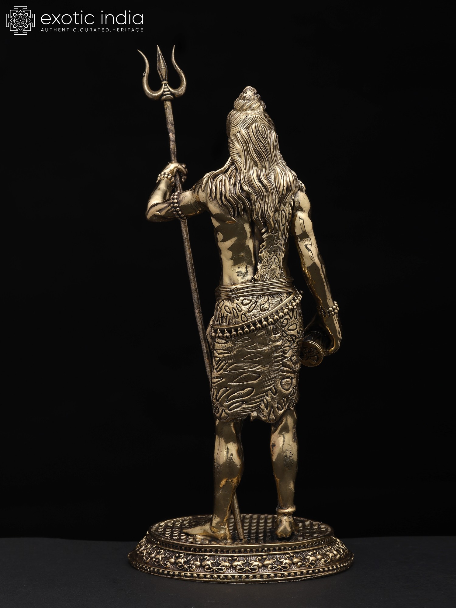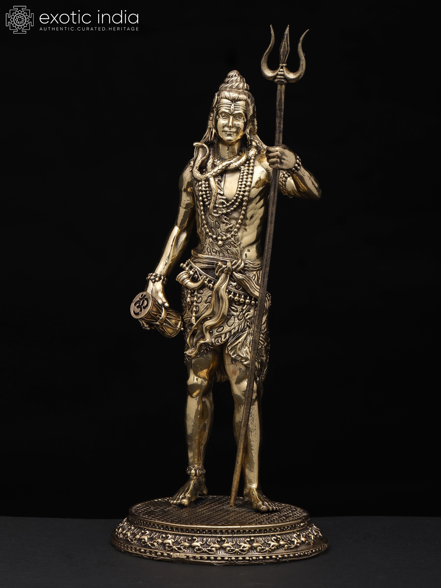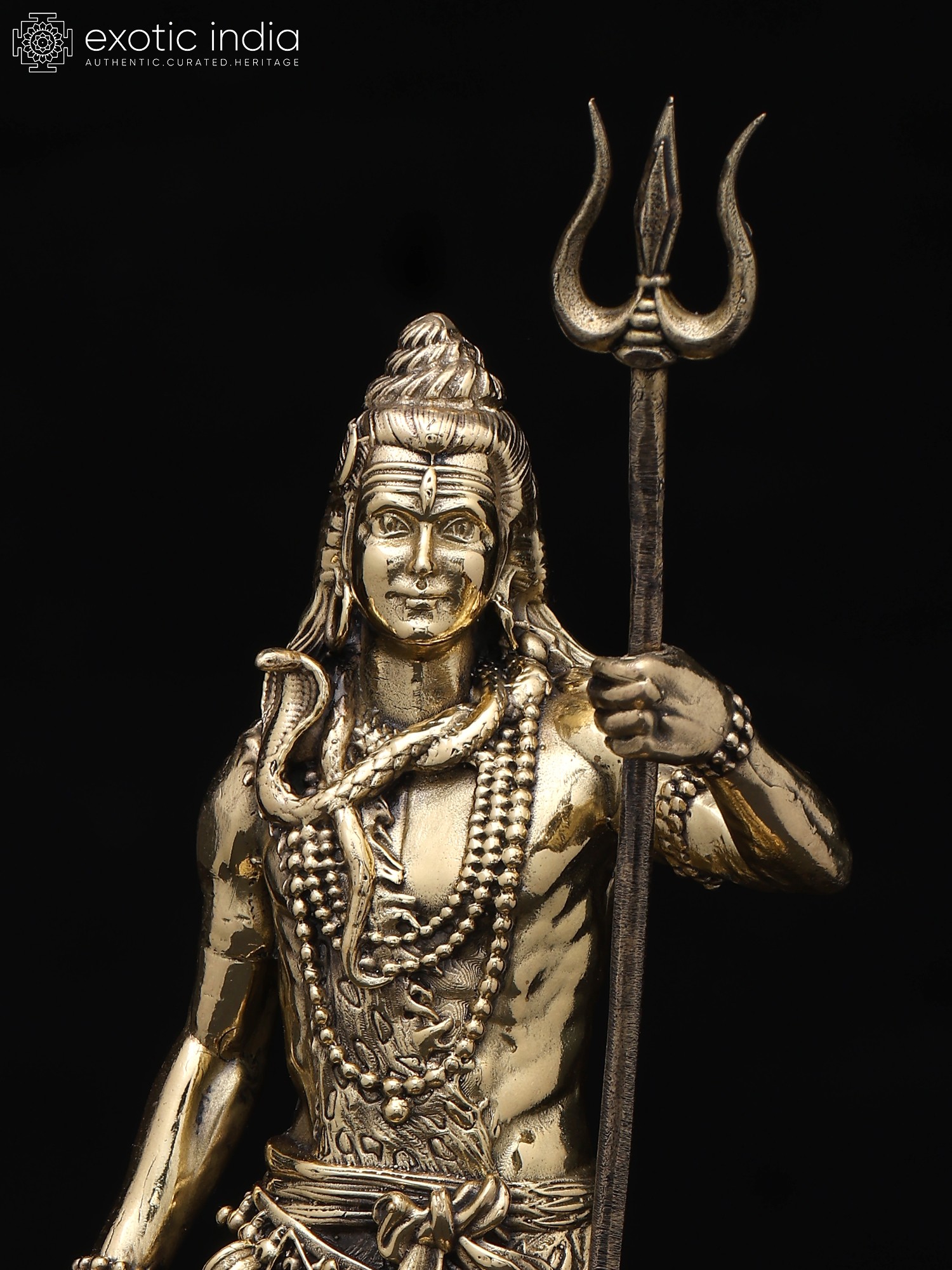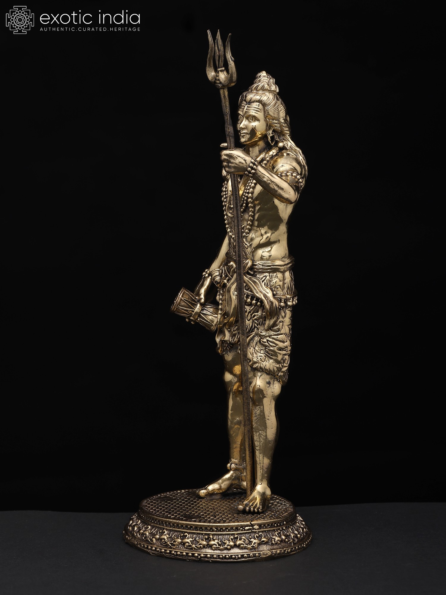This exquisite 11-inch brass statue of Lord Shiva is a testament to the artistry and spiritual depth of Hindu iconography. Crafted with meticulous detail, this standing figure captures the essence of the Destroyer, one of the principal deities of Hinduism, representing transformation and cyclical renewal. Shiva, often depicted as a yogi, is a complex god, embodying both destructive and benevolent powers. He is the lord of both asceticism and abundance, representing the constant interplay of creation and destruction in the universe. This statue is more than just a decorative piece; it is a gateway to understanding a pivotal figure in one of the world's oldest living religions. The rich golden hue of the brass enhances the statue's inherent majesty, reflecting the light and adding a sense of sacredness. His serene yet powerful presence will add a touch of spiritual elegance to any space.