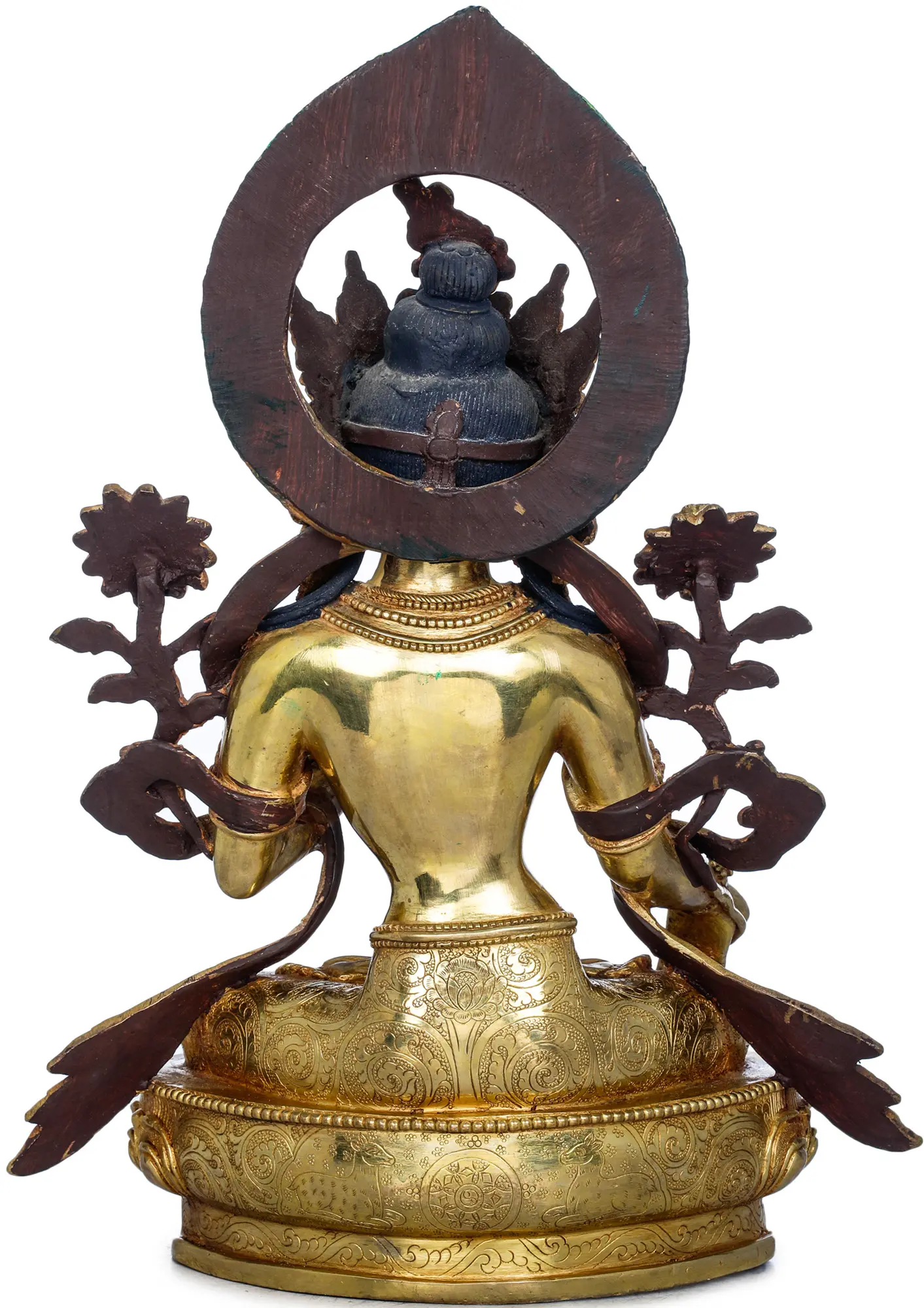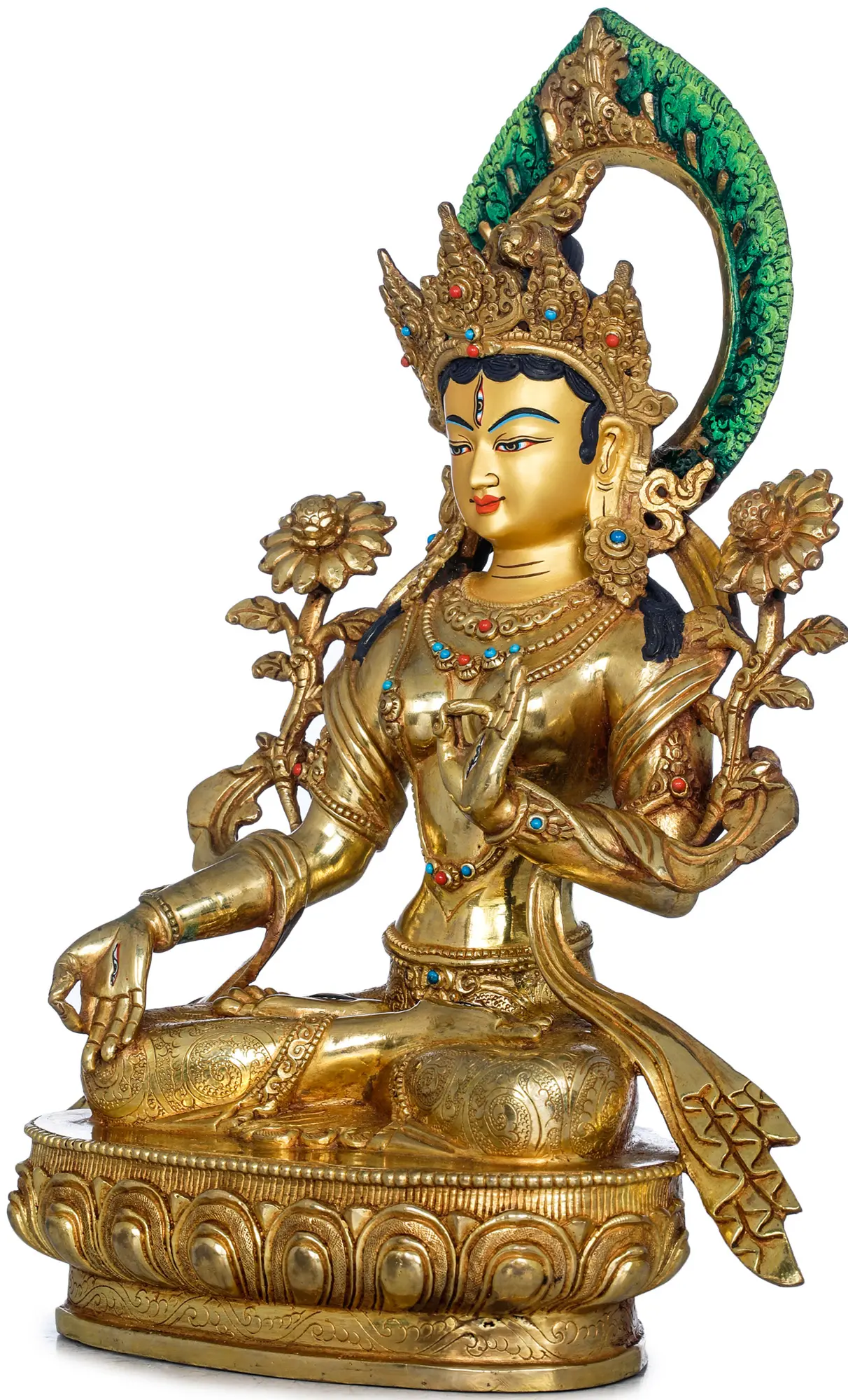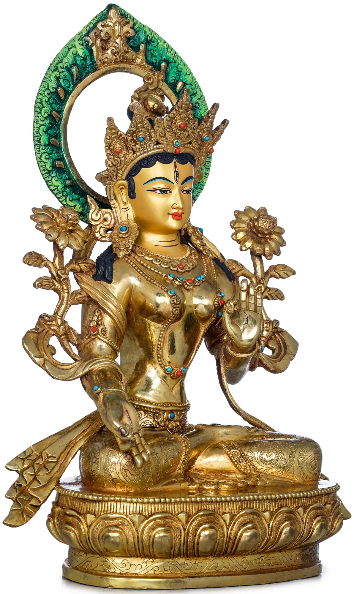 The statue is rendered in high-quality copper, a traditional material for sacred art, chosen for its durability and its ability to be worked with intricate detail. The entire sculpture is gilded with lustrous 24-karat gold, enhancing its spiritual significance and bestowing a breathtaking luminosity. The rich gold surface gleams, reflecting the divine light and emphasizing the sacred nature of the deity. The skillful application of pigments to the halo and decorative elements adds depth and vibrancy, showcasing the mastery of Nepalese artisans who have honed their craft through generations. This piece is not merely an object of beauty but a conduit for spiritual connection and a testament to enduring artistic tradition.
