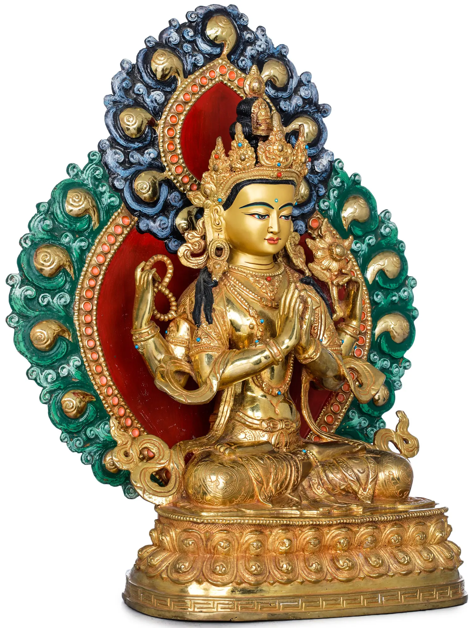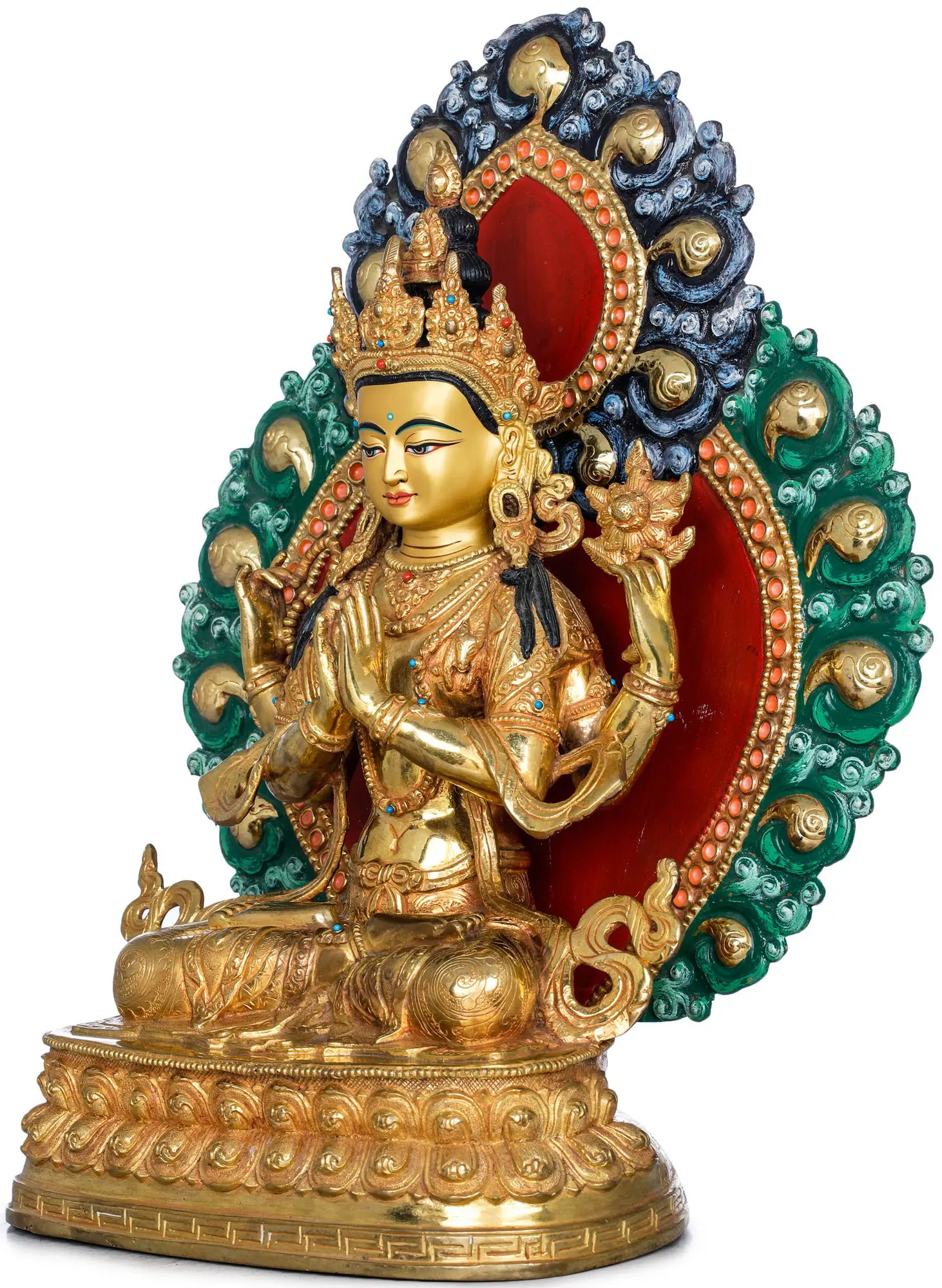 Now comes the most important part of Nepalese art which is gold gilding. This is done by the traditional fire gilding method. A mixture of mercury and 18K gold is applied on the surface of the statue and heat is applied using a flame torch. The result is that mercury evaporates along with impurities, leaving a pure 24K gold finish.
