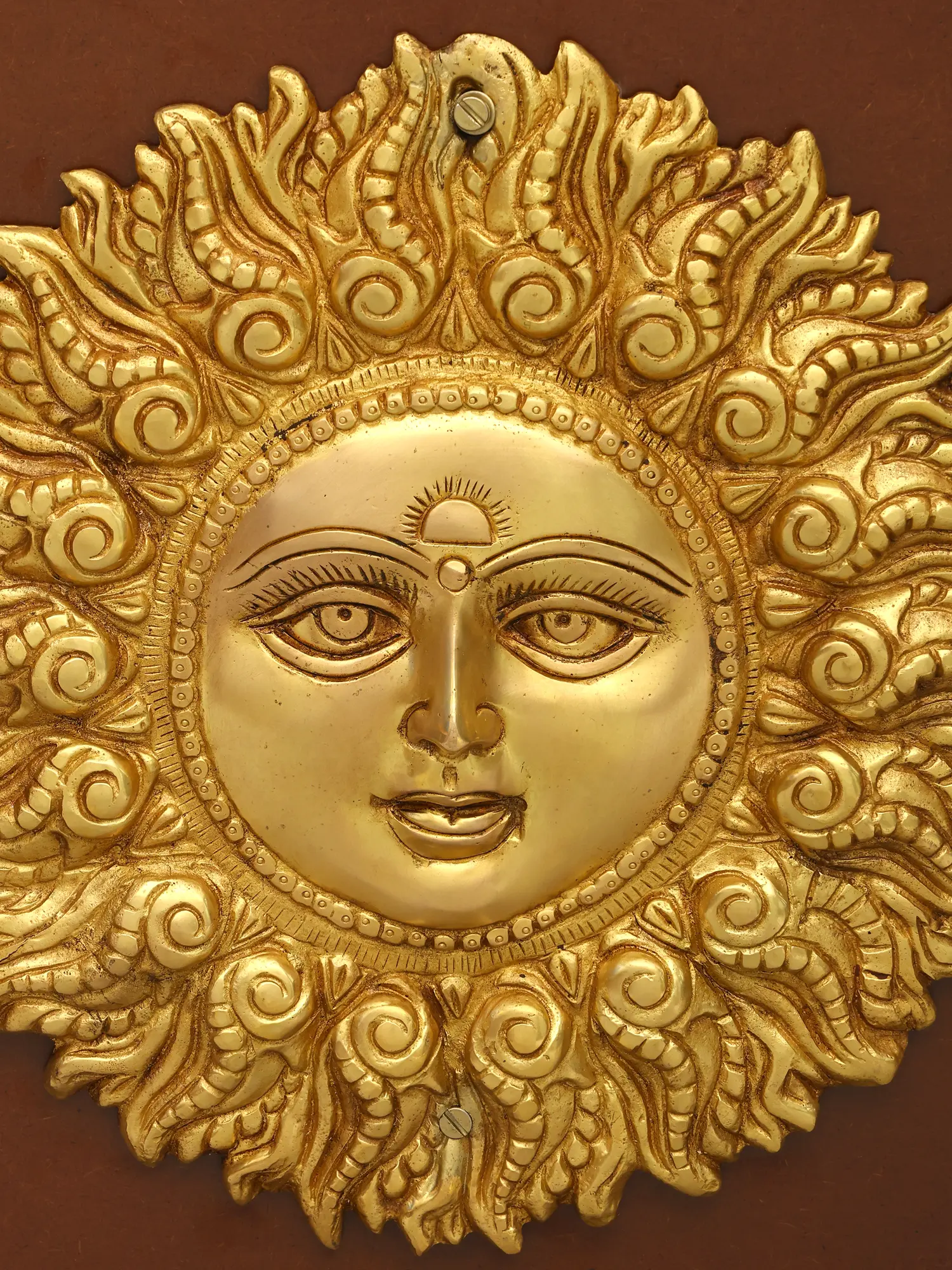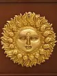Intricately cast brass sculpture with detailed facial features and sun rays.
