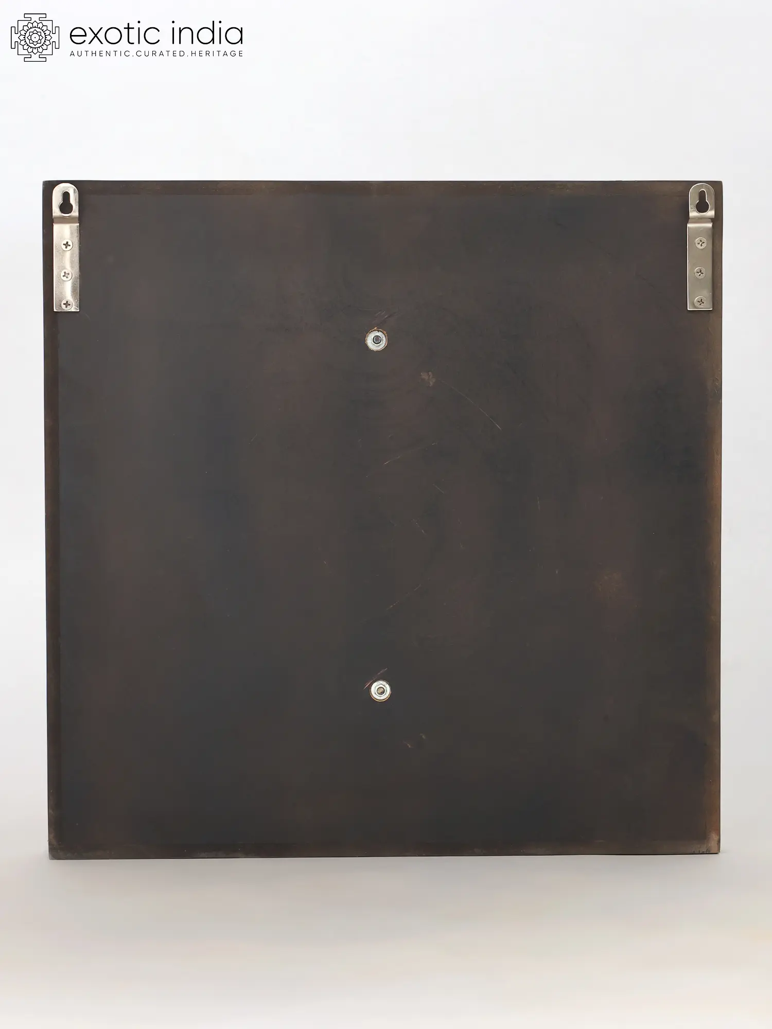 The central brass motif depicts a serene yet powerful countenance, encircled by a cascade of flame-like rays that seem to emanate an inner light. The contrast between the polished brass and the warm, deep tones of the wood creates a visually captivating interplay. Measuring eighteen inches square, it possesses a substantial yet balanced presence, designed to command attention without overwhelming your decor.