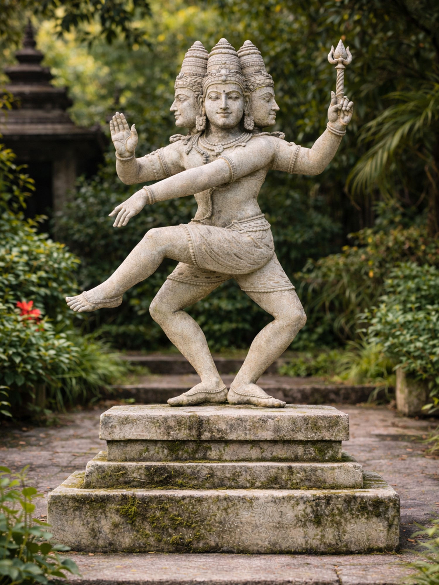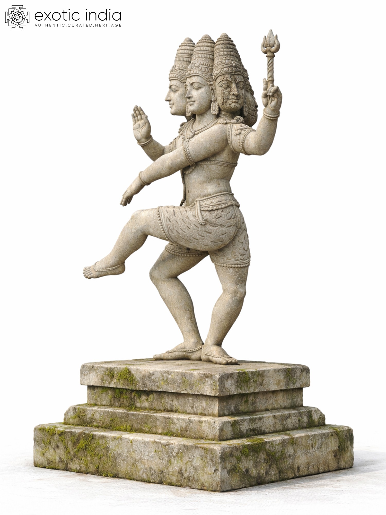 Observe the triple visage, each face emanating a distinct yet harmonious presence. The powerful stance, with one leg raised in mid-stride, speaks volumes of controlled energy. The raised hand, holding a symbolic trident, signifies divine authority, while the other gracefully extends, conveying balance. The textured fabric of the attire and the subtle yet precise adornments further enhance its visual richness, contributing to an imposing presence.