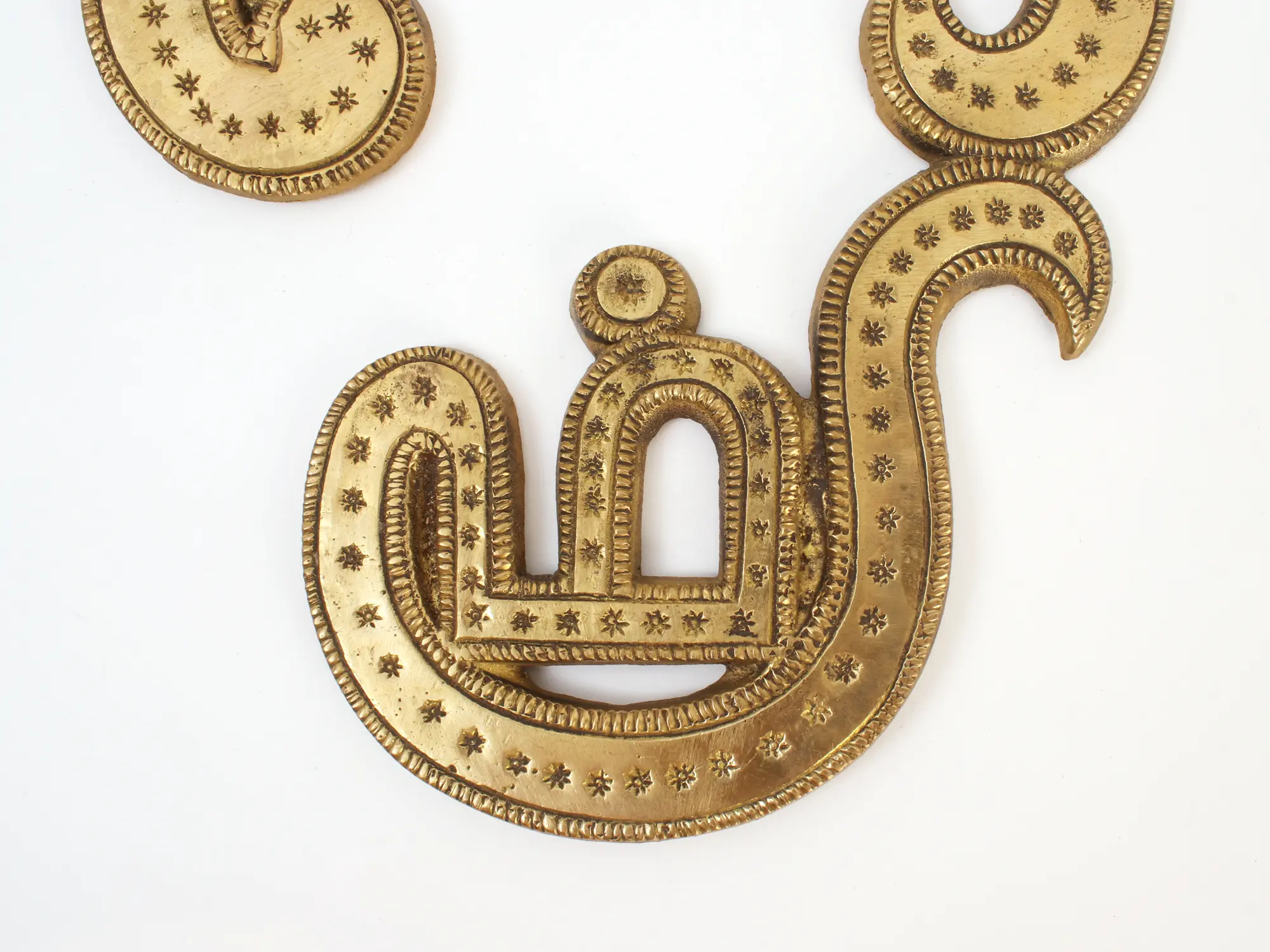 OM is a religious idea prevalent in all three major Indian religions: Hinduism, Jainism, and Buddhism. In the physical cosmos, the vibration created by chanting Om corresponds to the initial vibration originating at the time of creation. Om is also known as Pranava, which supports life and flows through Prana, or breath. This Tamil Om wall hanging made in brass is a tribute to the ability to create the Om symbol. Following the traditional patterns, the wall hanging consists of dotted lines around the corners of the symbol running throughout the structure. There are also small flowers engraved in the blank space between two lines. This wall hanging not only promotes the power of meditation but also looks elegant on a wall, thus increasing the beauty of the home decor.