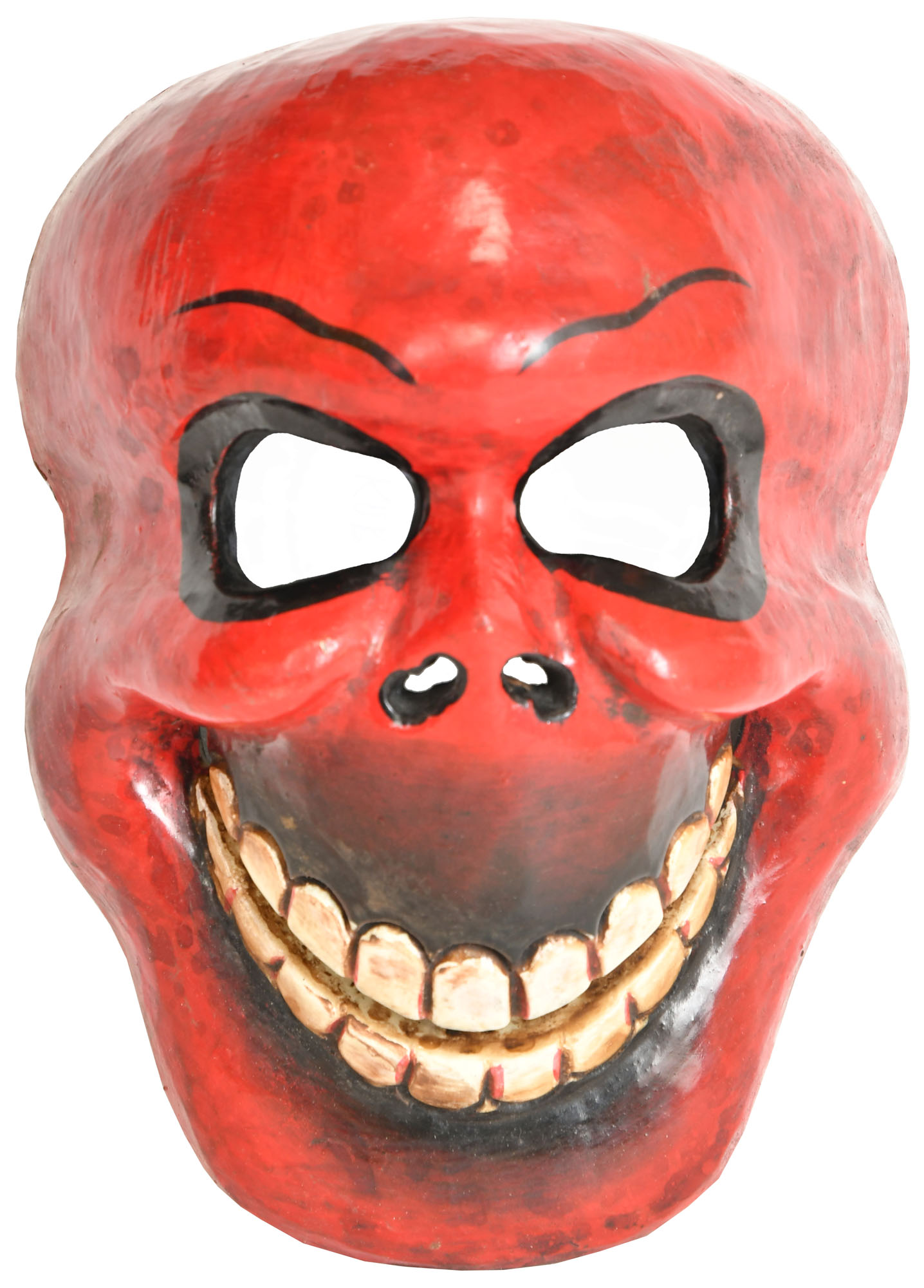 In Tantric philosophy, the skull is not merely a symbol of death but a profound representation of impermanence, liberation, and the ultimate reality beyond form. It serves as a reminder that all phenomena are subject to change and decay, encouraging practitioners to cultivate detachment and seek spiritual freedom. Masks bearing such visages are often used in rituals and meditations to help devotees confront their fears, embrace the shadow aspects of the psyche, and tap into transformative energies. The striking features of this mask, with its wide, piercing eyes and intense expression, can be interpreted as representing deities or spirits that embody both fierce protection and the power to destroy ignorance. Think of deities like Kali, the goddess of time, change, and destruction, who is often depicted with fearsome aspects to annihilate ego and illusion.