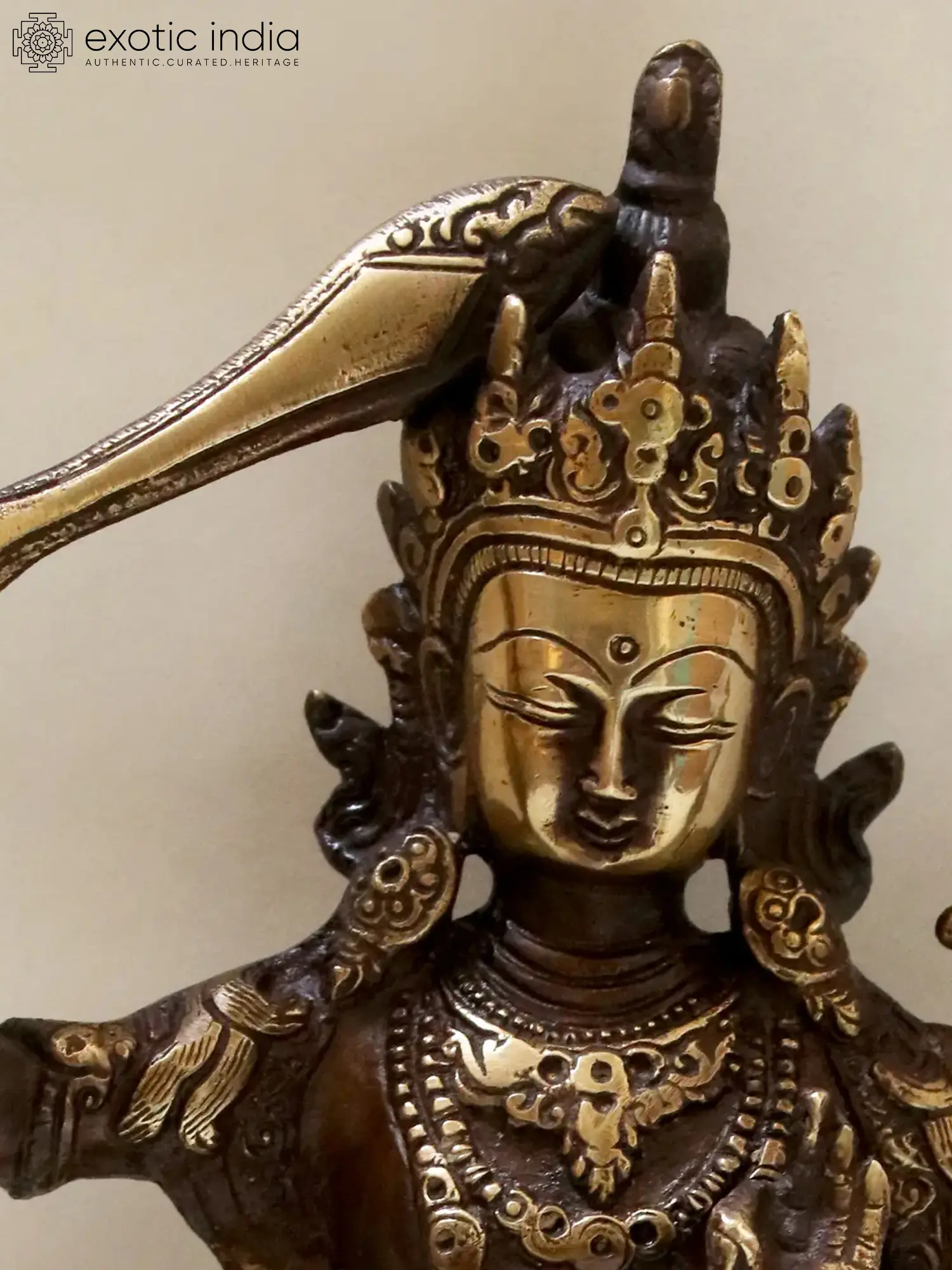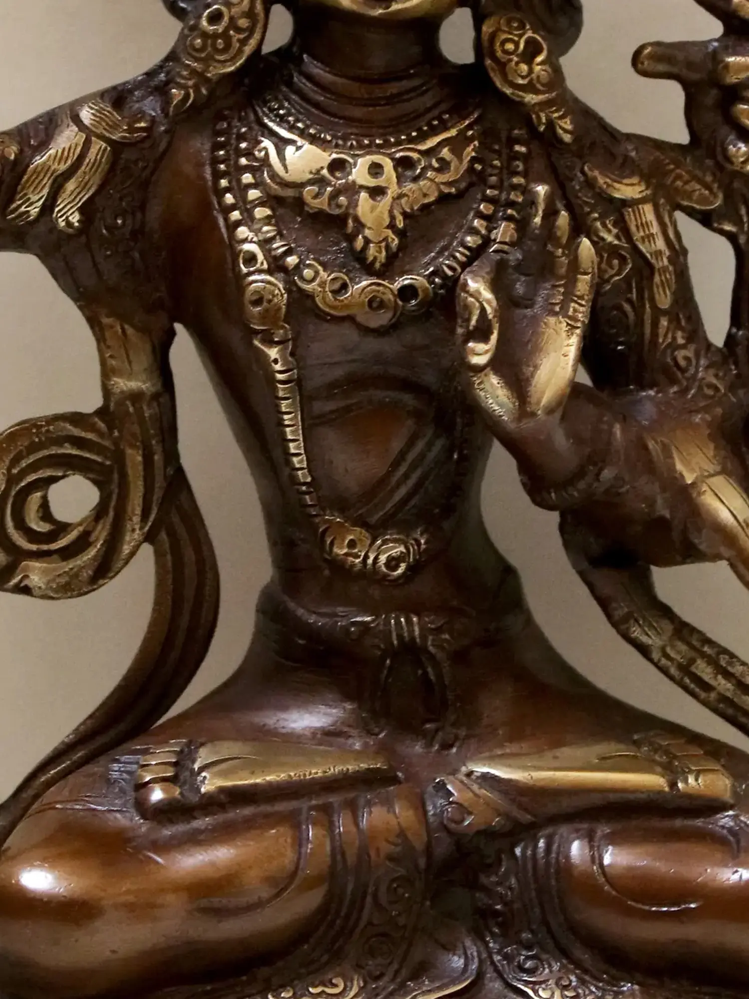 This exquisite brass statue depicts Tara, a central figure in Mahayana Buddhism, revered as the mother of liberation and the embodiment of compassionate activity. She is an enlightened being who has attained Buddhahood but has vowed to be reborn in the female form to guide all sentient beings to enlightenment. Tara is particularly known for her swift intervention in times of danger and her ability to overcome obstacles, making her a beloved deity for devotees seeking protection, courage, and spiritual guidance.