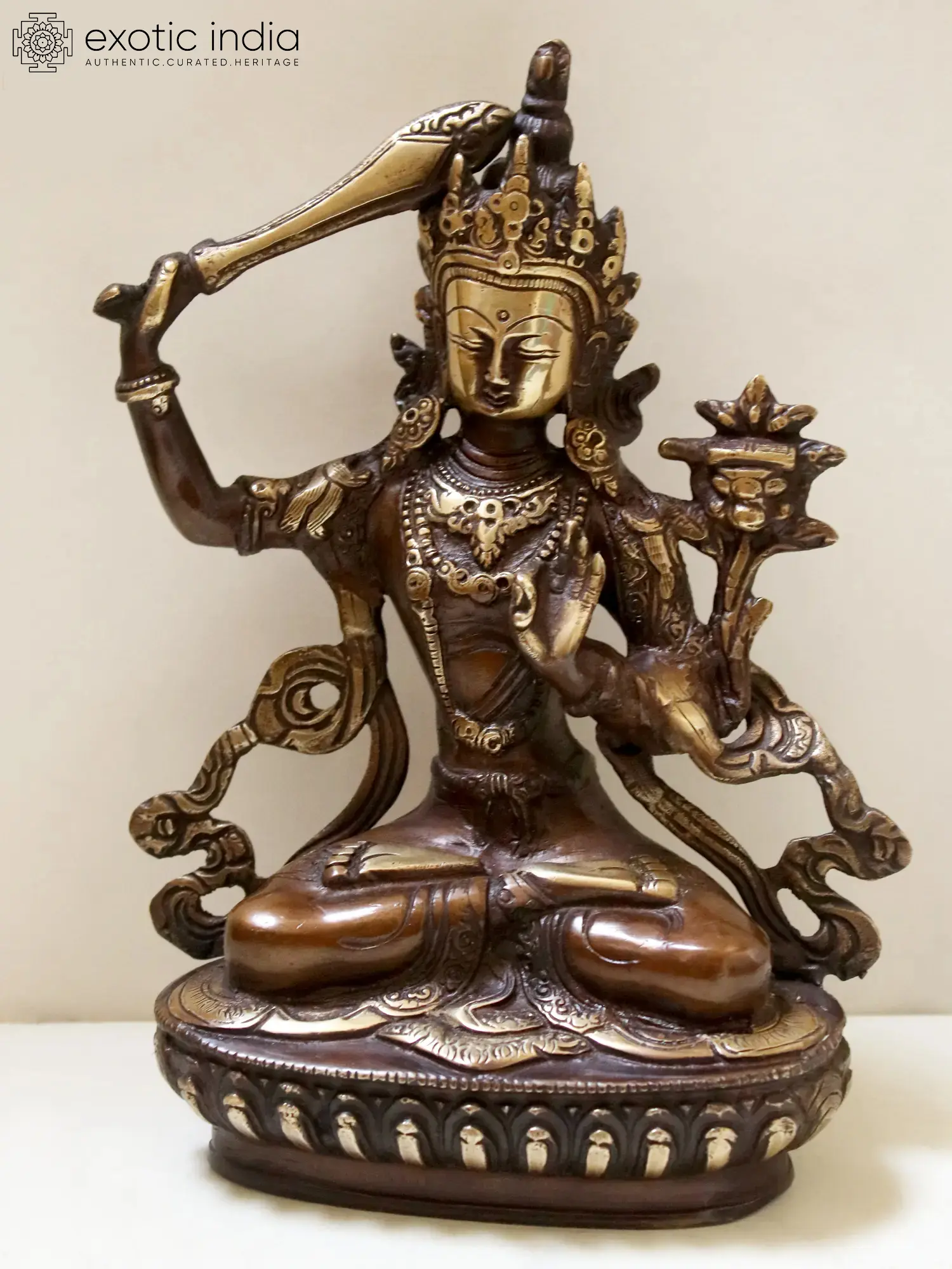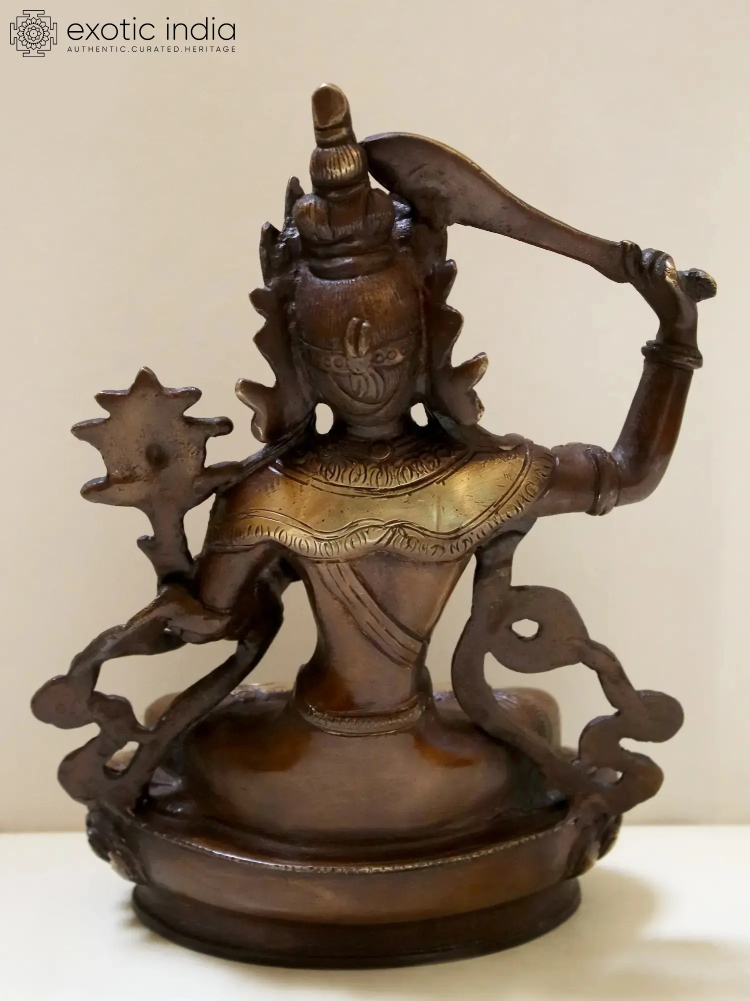 The statue beautifully captures Tara's dynamic presence. She is depicted in a graceful seated posture, with her right leg extended, symbolizing her readiness to descend and aid those in need. Her left hand is held in the gesture of protection, while her right hand is raised, brandishing a sword. This sword represents the wisdom that cuts through ignorance and delusion, dispelling fear and confusion. In her left hand, she holds a lotus flower, a symbol of purity, enlightenment, and the unfolding of spiritual potential. The intricate crown and ornate jewelry adorning her suggest her royal status as a celestial queen, a benevolent ruler who watches over her followers with unwavering compassion.