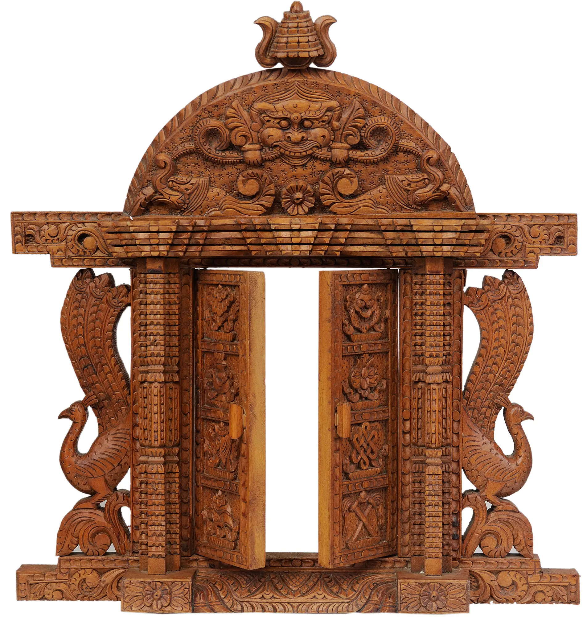 Flanking the double doors, a pair of gracefully rendered peacocks preside. In many Eastern traditions, the peacock is revered as a symbol of beauty, royalty, and immortality. The shimmering iridescence of their plumage is said to represent the manifestation of light and wisdom, while their ability to consume poisonous plants without harm is seen as a metaphor for spiritual transcendence. In Buddhist lore, the peacock is associated with Kwan Yin, the Bodhisattva of Compassion, further elevating its symbolic significance. Above the main doorway, a fearsome Garuda is depicted. This mythological bird, often depicted as a powerful raptor-like creature, is known as the enemy of snakes and represents strength, courage, and protection. It is frequently associated with Vishnu in Hindu mythology, where it serves as his mount. The inclusion of the Garuda underscores the piece's protective qualities, acting as a barrier against negative energies and influences. The temple doors themselves are adorned with the Eight Auspicious Symbols, also known as Ashtamangala. These are a group of sacred emblems that appear across various Eastern traditions, each representing a different aspect of enlightenment and good fortune. Common symbols found on such pieces include the lotus flower (purity), the conch shell (the spreading of dharma), the endless knot (interconnectedness), and the victory banner (triumph over ignorance). These symbols work in harmony to invoke a feeling of well-being and spiritual prosperity.
