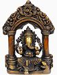 This meticulously crafted statue portrays Ganesha seated gracefully beneath an ornate archway, resembling a temple entrance. The arch is intricately decorated with floral motifs and swirling patterns, evoking the sacred atmosphere of a Hindu temple. Ganesha's posture exudes serenity and wisdom. His large ears are said to listen to the prayers of devotees, and his trunk, often holding a sweet treat, represents his discerning ability to distinguish between truth and illusion. One hand is raised in the Abhaya Mudra, a gesture of fearlessness and protection, while the other holds a sweet delicacy, perhaps a laddoo, symbolizing the rewards of spiritual pursuits.
