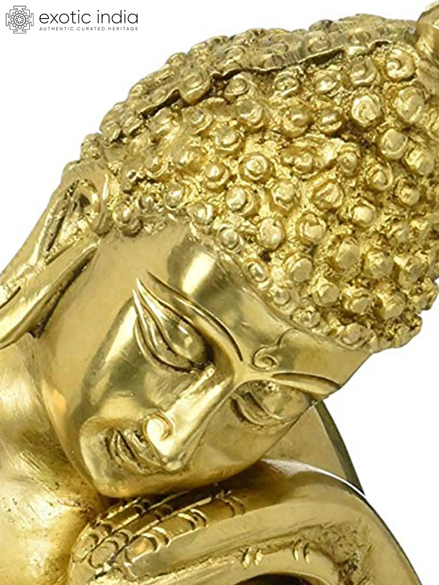 This exquisite brass statue captures a moment of profound introspection, depicting the Buddha in a pensive posture that invites quiet reflection. The gentle curve of his form, with his head resting on his knees, conveys a deep sense of serenity and inner peace. This iconic pose is not merely an artistic representation; it symbolizes the Buddha's deep contemplation during his quest for enlightenment, a period of intense meditation and philosophical inquiry that led to the understanding of suffering and the path to liberation. The meticulous craftsmanship, evident in every detail from the coiled hair representing his wisdom to the intricate folds of his monastic robe, speaks to the rich heritage of Indian artistry. Each curve and contour has been shaped by skilled hands, imbuing the brass with a lifelike quality and a radiant warmth that suggests the enduring glow of spiritual insight.