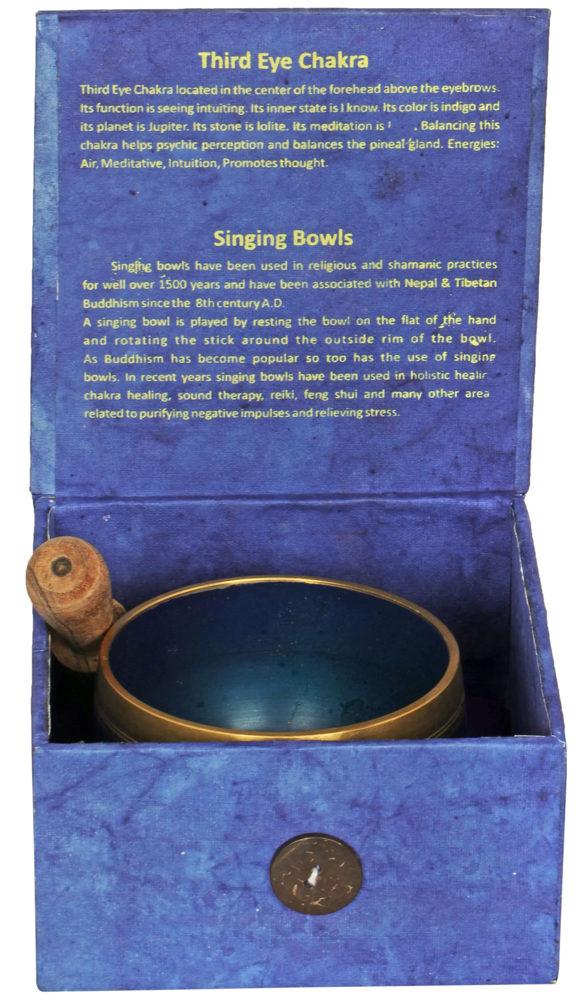 This exquisite Tibetan singing bowl is more than just a beautiful artifact; it is a tool designed to awaken your inner perceptions and connect you with a deeper state of consciousness. Crafted from a harmonious blend of brass and wood, this bowl is intended to resonate with the Ajna chakra, commonly known as the third eye. In various spiritual traditions, the third eye is considered the seat of intuition, perception, and psychic awareness. Ancient yogis and mystics sought to open this inner gateway to gain profound insights and spiritual understanding. This bowl, with its deep, resonant sound, is believed to aid in this very process. The deep, enigmatic blue of the bowl evokes the vastness of the night sky, a canvas for stars and celestial wisdom, mirroring the boundless potential of the third eye. The gleaming brass rim serves as a halo of enlightenment, drawing the eye and symbolizing the radiant nature of awakened consciousness. When gently struck or circled with the accompanying wooden mallet, the bowl emits a pure, sustained tone. This sound is thought to vibrate at frequencies that harmonize with the Ajna chakra, clearing energetic blockages and promoting a state of mental clarity.
