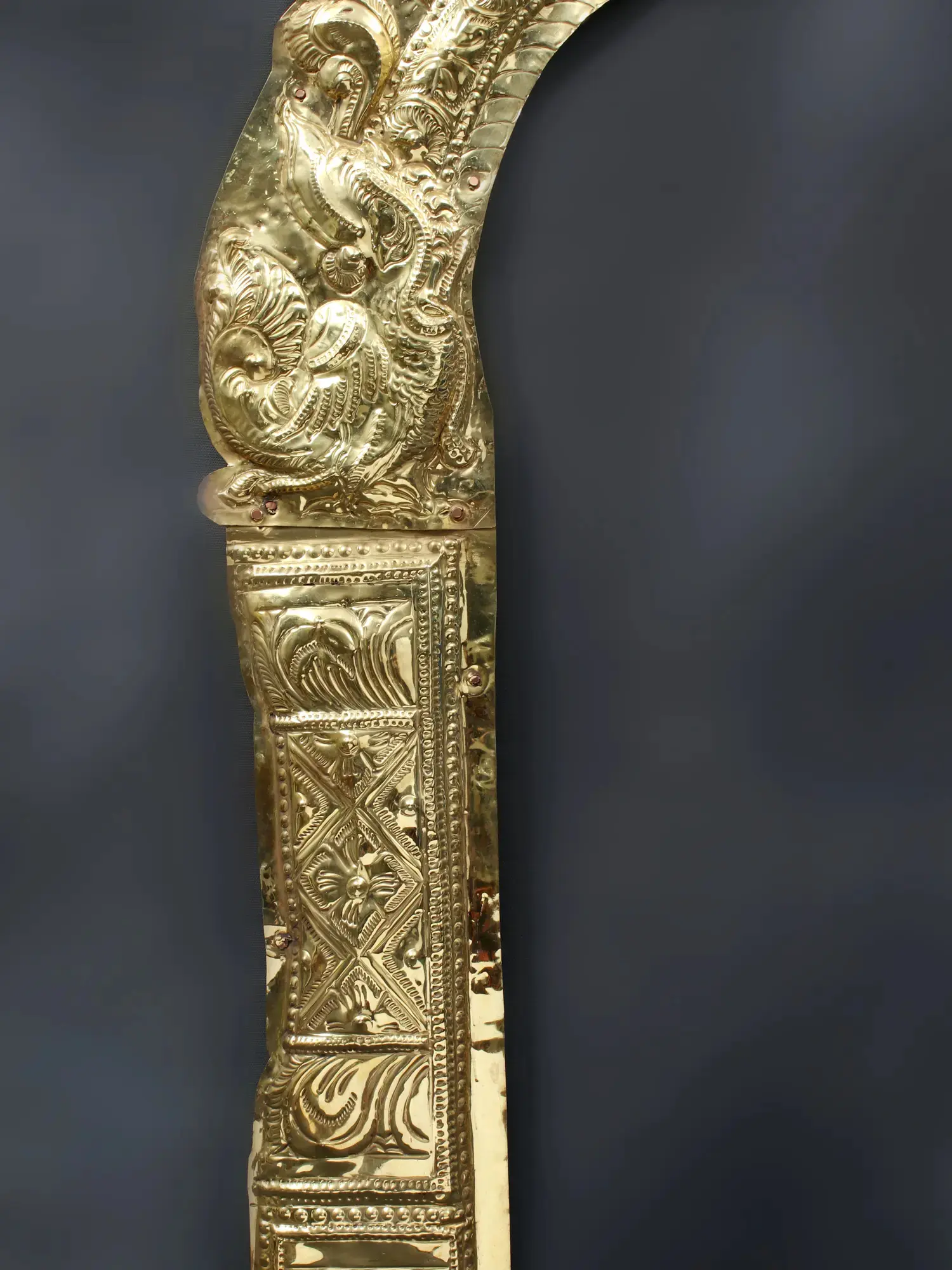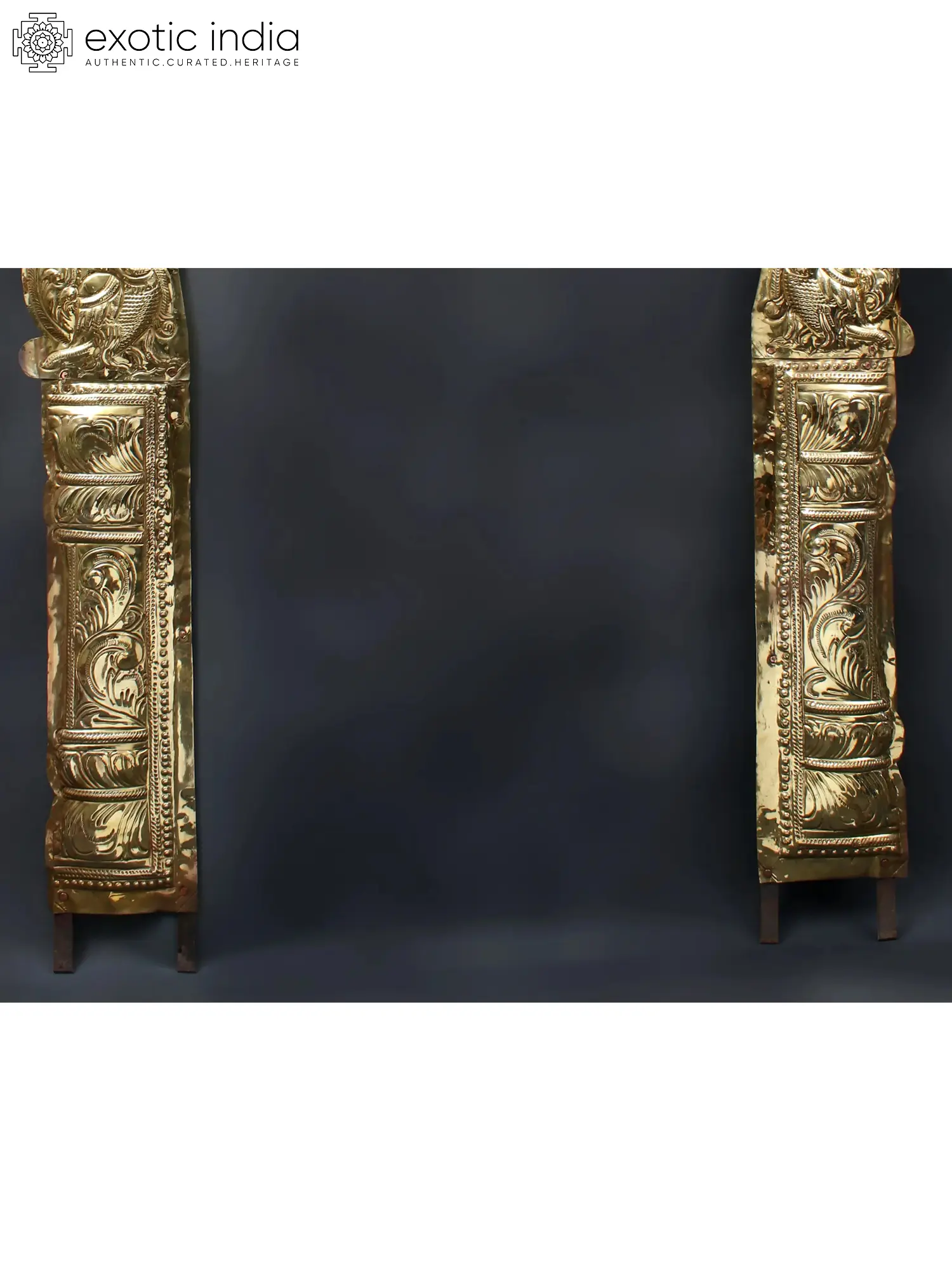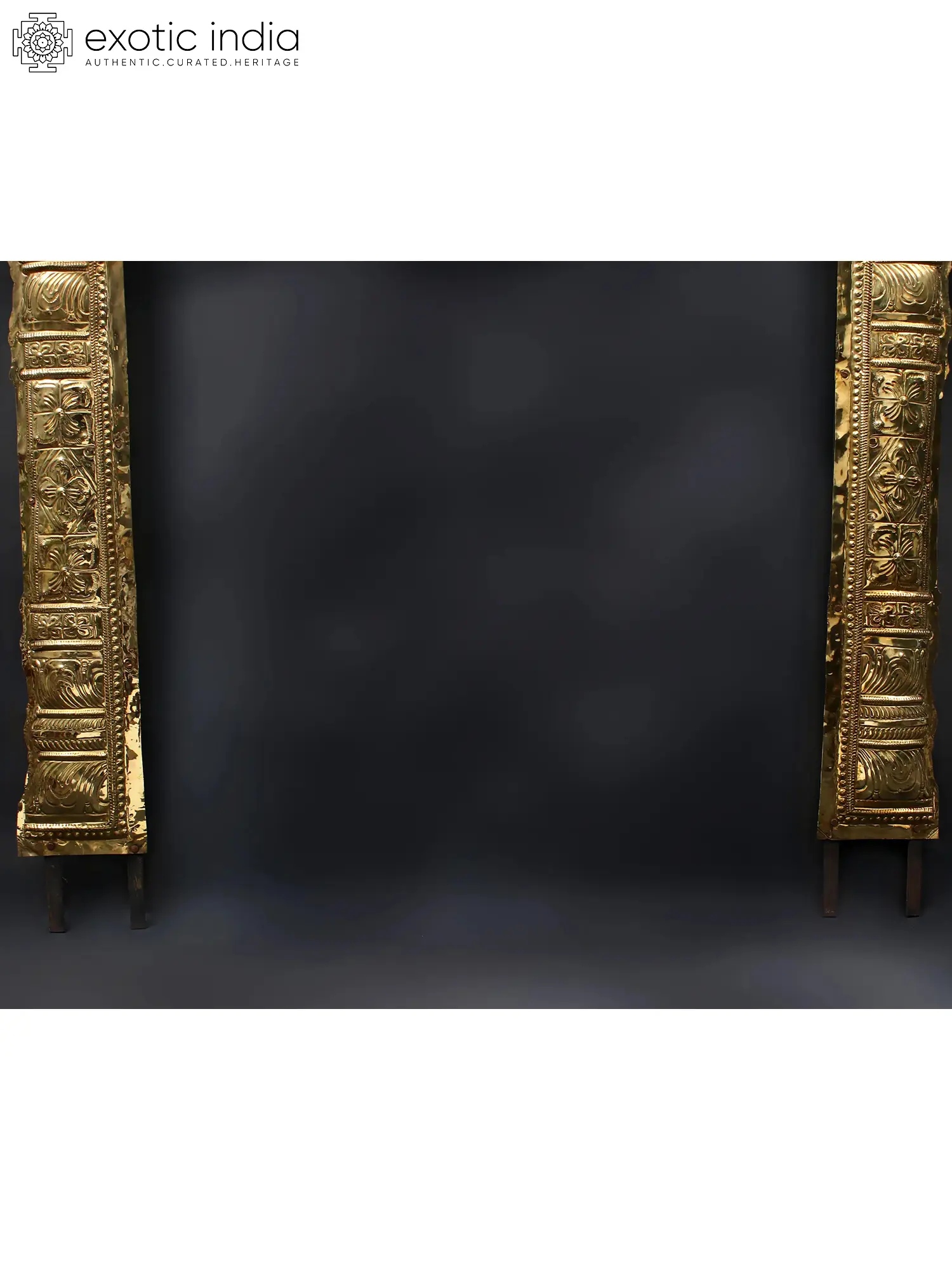 Marking the sacred aura of divinity in the sanctum sanctorum, a Prabhavali or aureole is a majestic element in the architecture of ancient Hindu shrines. Bringing the grandeur of Indian temples to your Puja ghar, this brass Thiruvachi arch is adorned with exquisite motifs and images of Kirtimukha and Makara. Crafted with the technique of repousse, that lends the composition an aesthetic richness, this Prabhavali is the perfect devoted offering to the throne of your deity.