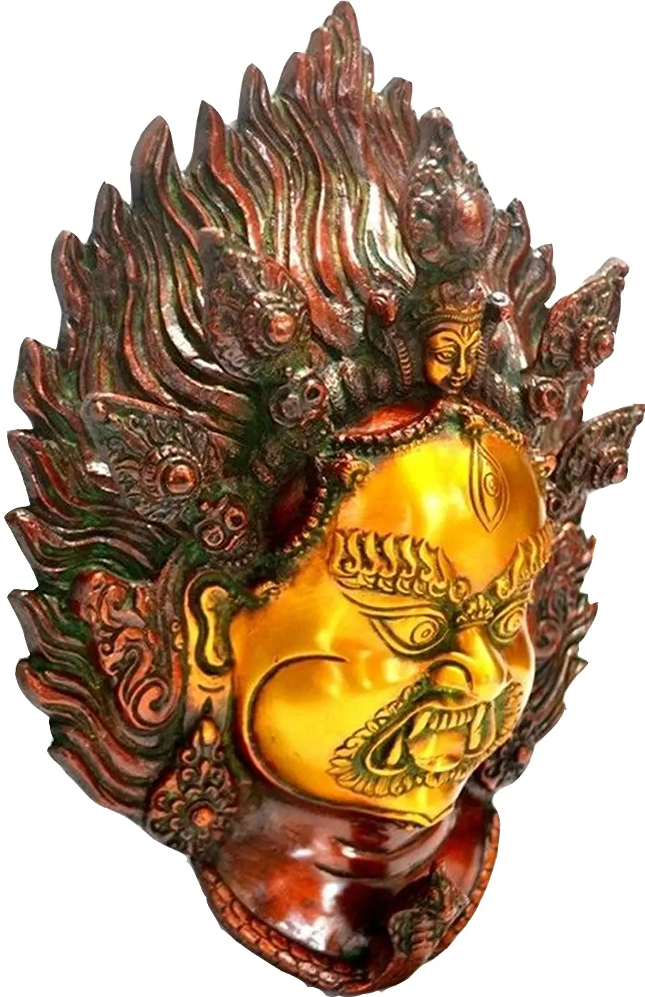 This striking wall-hanging mask captures the potent energy of Mahakala Bhairava, a formidable deity revered in Tantric Buddhism and Hinduism. Crafted from gleaming brass, the mask radiates a powerful aura, intended to ward off negativity and protect its surroundings. The central face is dominated by three piercing eyes, symbolizing all-seeing wisdom and vigilance, capable of perceiving the past, present, and future. ––––––––––––––––––