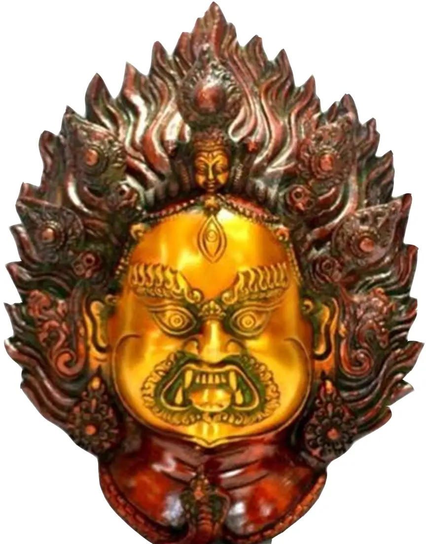 The mask’s fierce expression, with its bared fangs and formidable snarl, is not one of malice but of immense power to overcome obstacles and defeat malevolent forces. Mahakala, often depicted as a wrathful emanation of Avalokiteshvara or Shiva, serves as a protector of the Dharma, ensuring spiritual progress and safeguarding practitioners from inner and outer hindrances. The flames emanating from the crown and surrounding the face represent purification, the burning away of ignorance and delusion, and the ultimate dissolution of negativity. The presence of a smaller Buddha head atop the main form signifies the ultimate source of this divine wrath, a compassionate force transforming into a powerful protector. ––––––––––––––––––