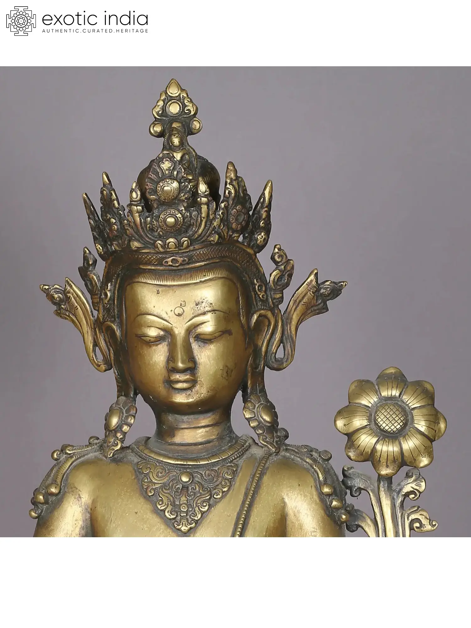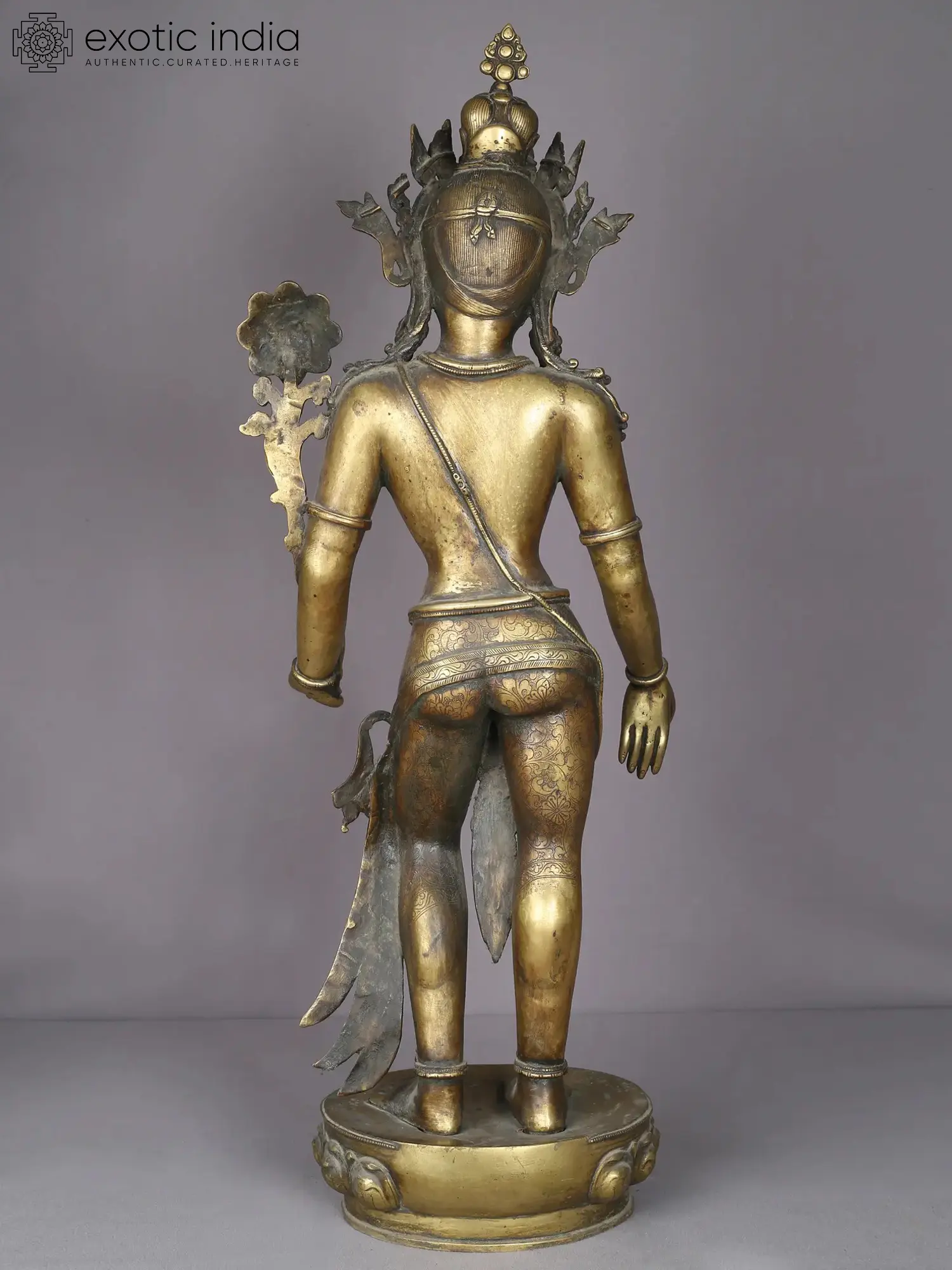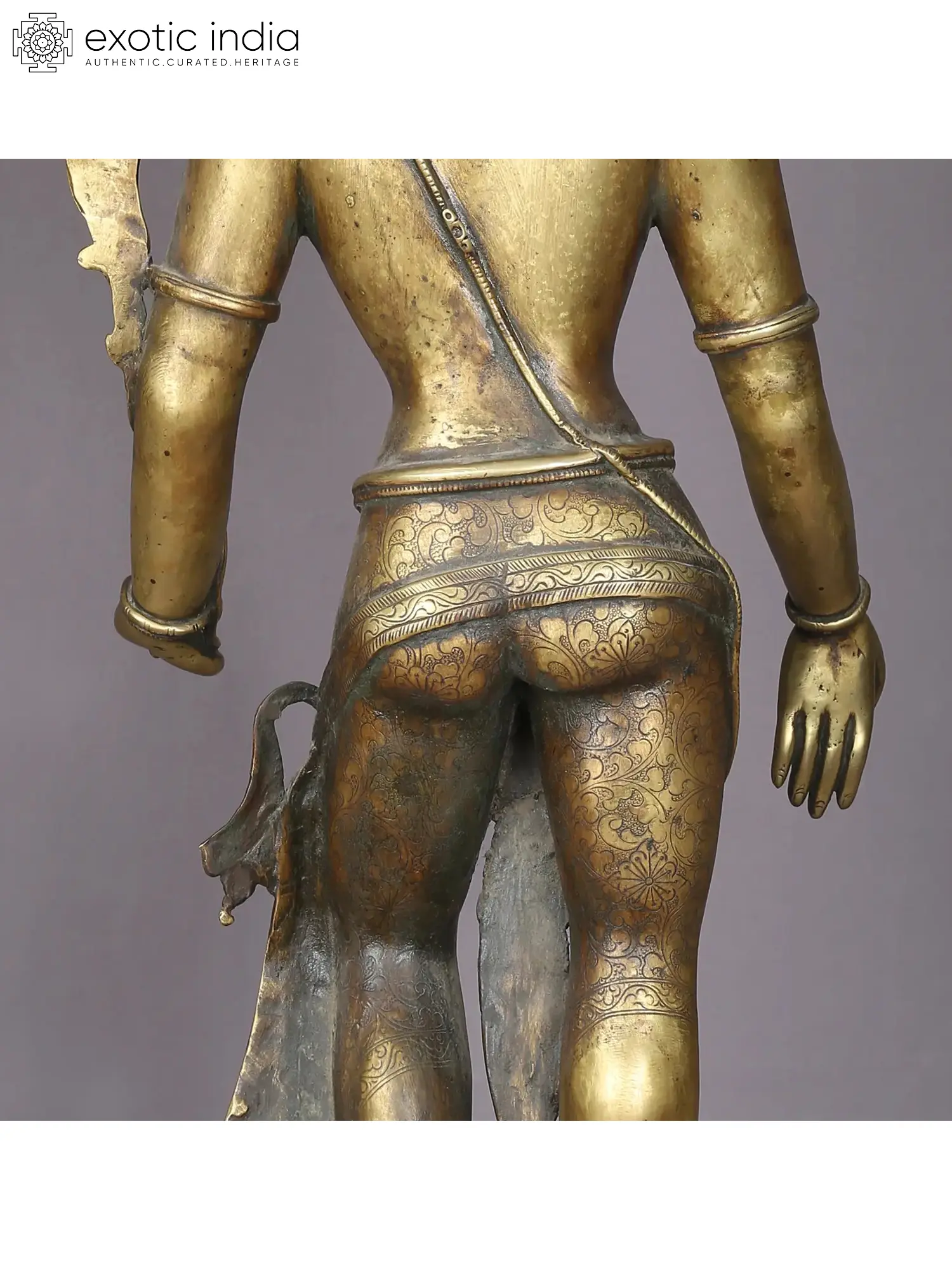 This exquisite brass statue depicts Lokeshvara, the bodhisattva of compassion, in a serene standing posture. Originating from Nepal, a land deeply steeped in Buddhist traditions, this artwork embodies the profound philosophy of Mahayana Buddhism, which emphasizes the liberation of all sentient beings from suffering. Lokeshvara, often referred to as Avalokiteshvara in Sanskrit, is a central figure in this tradition, representing infinite compassion and mercy. His presence is invoked to alleviate pain, offer protection, and guide individuals towards enlightenment. The artistry of this piece is a testament to the rich heritage of Nepalese craftsmanship. The lustrous brass has been meticulously worked to capture the divine essence of the bodhisattva. Lokeshvara is adorned with a crown, symbolizing his spiritual authority, and intricate jewelry that highlights his noble status. His serene countenance, with closed eyes, suggests a deep meditative state and an inward focus on the universal suffering he seeks to alleviate. The delicate detailing on his garments, with fine patterns and flowing drapes, adds to the overall sense of grace and divinity. ––––––––––