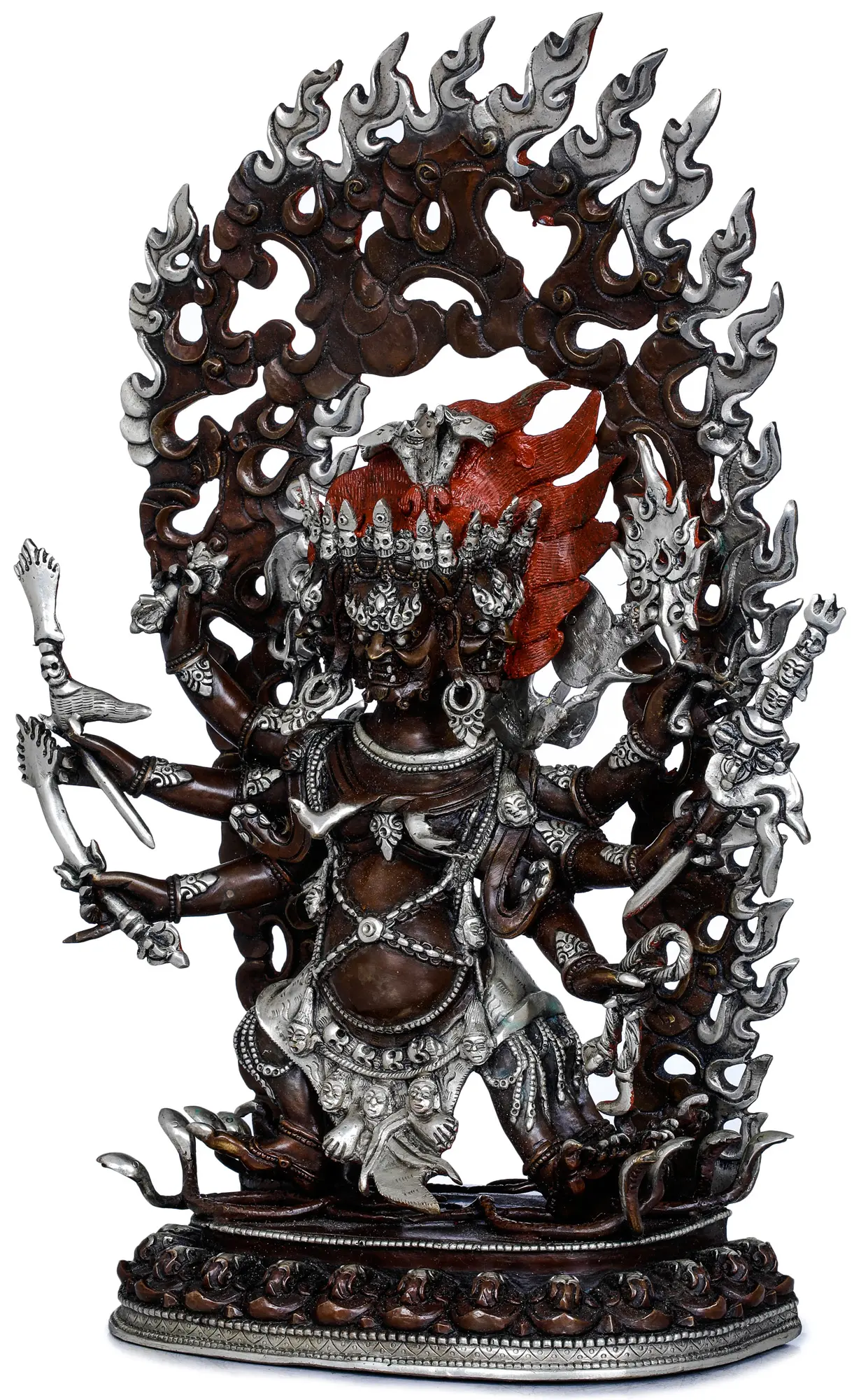The presence of three heads on this deity is highly symbolic. It is said to represent the three kayas (bodies) of a Buddha: the Dharmakaya (truth body), the Sambhogakaya (enjoyment body), and the Nirmanakaya (manifestation body), signifying his enlightened nature and his ability to manifest in various forms to benefit sentient beings. The multitude of arms, each holding a symbolic implement, further emphasizes his boundless power and active engagement in dispelling suffering. The most dramatic element is the large, fiery aureole that envelops Hayagriva. This radiant halo of flames is not indicative of anger, but rather represents the blazing wisdom and purifying energy that incinerates delusion, attachment, and all forms of spiritual impurity. It is a visual metaphor for the transformative power of enlightened understanding. —