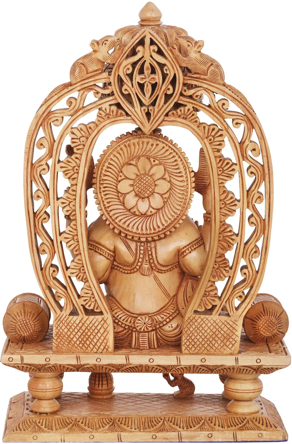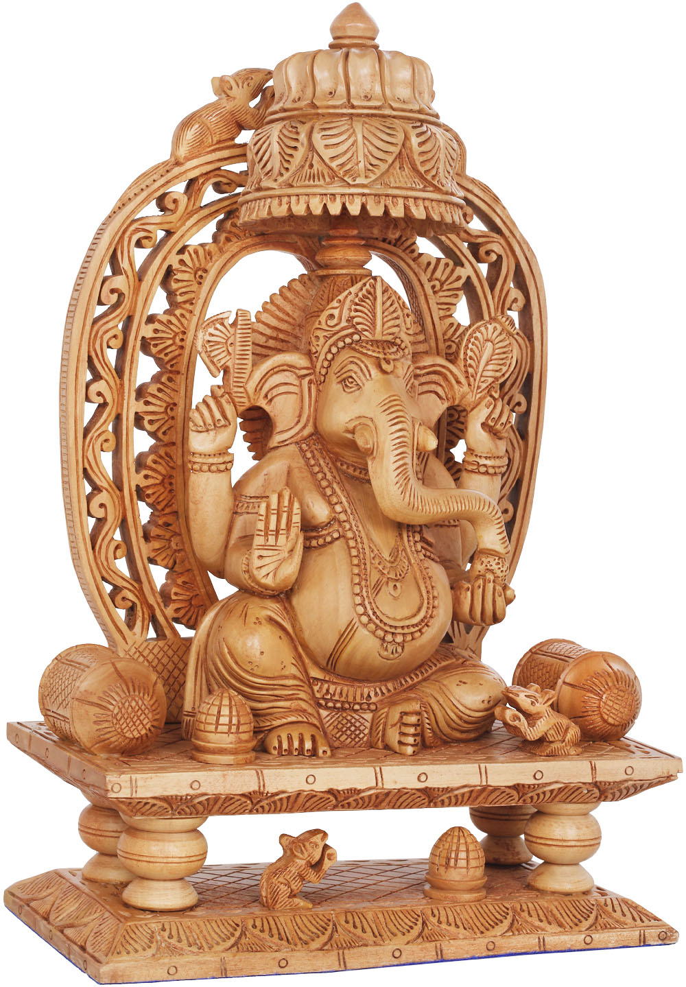 Invite the benevolent presence of Lord Ganesha into your home with this stunning and intricately carved wooden statue. This piece, crafted with immense skill and devotion, depicts the beloved deity in all his majestic glory, seated upon an ornate throne. Each curve and detail has been meticulously rendered, bringing to life the divine energy and wisdom associated with Ganesha, the Remover of Obstacles and the God of beginnings. The rich, warm tone of the wood enhances the tactile beauty of the carving, making it a focal point for any room. The artist's mastery is evident in the delicate rendering of Ganesha's iconic features – his gentle expression, the curve of his trunk, and the auspicious symbols he holds in his multiple hands, each conveying a specific blessing or power. The elaborate throne itself is a work of art, featuring intricate patterns and architectural elements that speak of royalty and divine power. The surrounding archway, adorned with finely detailed motifs, frames the deity, drawing the eye and imbuing the entire piece with a sense of sacred space.