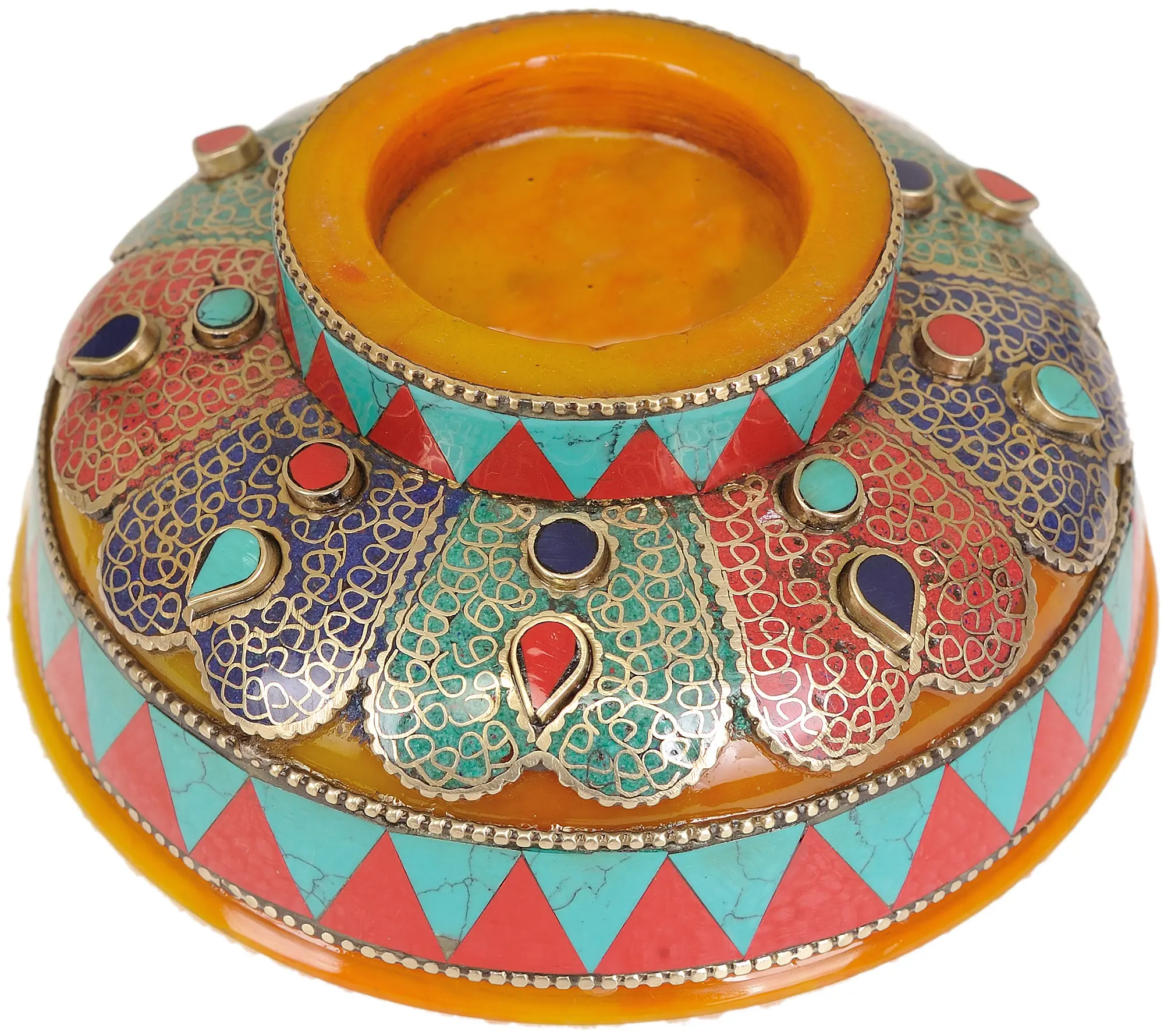 The exterior of the bowl is a testament to meticulous craftsmanship, adorned with intricate inlay work that speaks to the spiritual significance of its form. A decorative band encircles the base, featuring alternating triangles of coral and turquoise, separated by delicate, textured metalwork. Coral, revered in many cultures, is often associated with vitality, protection, and good fortune, while turquoise is a stone deeply connected to the sky, water, and spiritual wisdom in various indigenous traditions. The interplay of these colors and materials creates a visually captivating piece that invites contemplation. This bowl can serve as a focal point for meditation, a repository for offerings, or a conduit for channeling positive energies during sacred rituals. Its presence can evoke the serene atmosphere of a mountain monastery, echoing the chants and aspirations of practitioners seeking enlightenment and inner peace. The design of the bowl, with its gentle curves and stable base, suggests a vessel designed to hold precious substances, whether tangible offerings or intangible prayers. It can be imagined as a chalice from which the nectar of wisdom is poured, or a mirror reflecting the practitioner's deepest intentions. In Buddhist cosmology, bowls are often depicted in the hands of deities, used to receive offerings or to bestow blessings. This particular bowl, with its vibrant amber interior, could symbolize the transformative power of awareness, or the boundless compassion that radiates from a Bodhisattva's heart, illuminating the path for all beings. Its moderate size makes it suitable for personal altars, study spaces, or any area where one seeks to cultivate a deeper connection to their spiritual path.