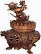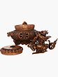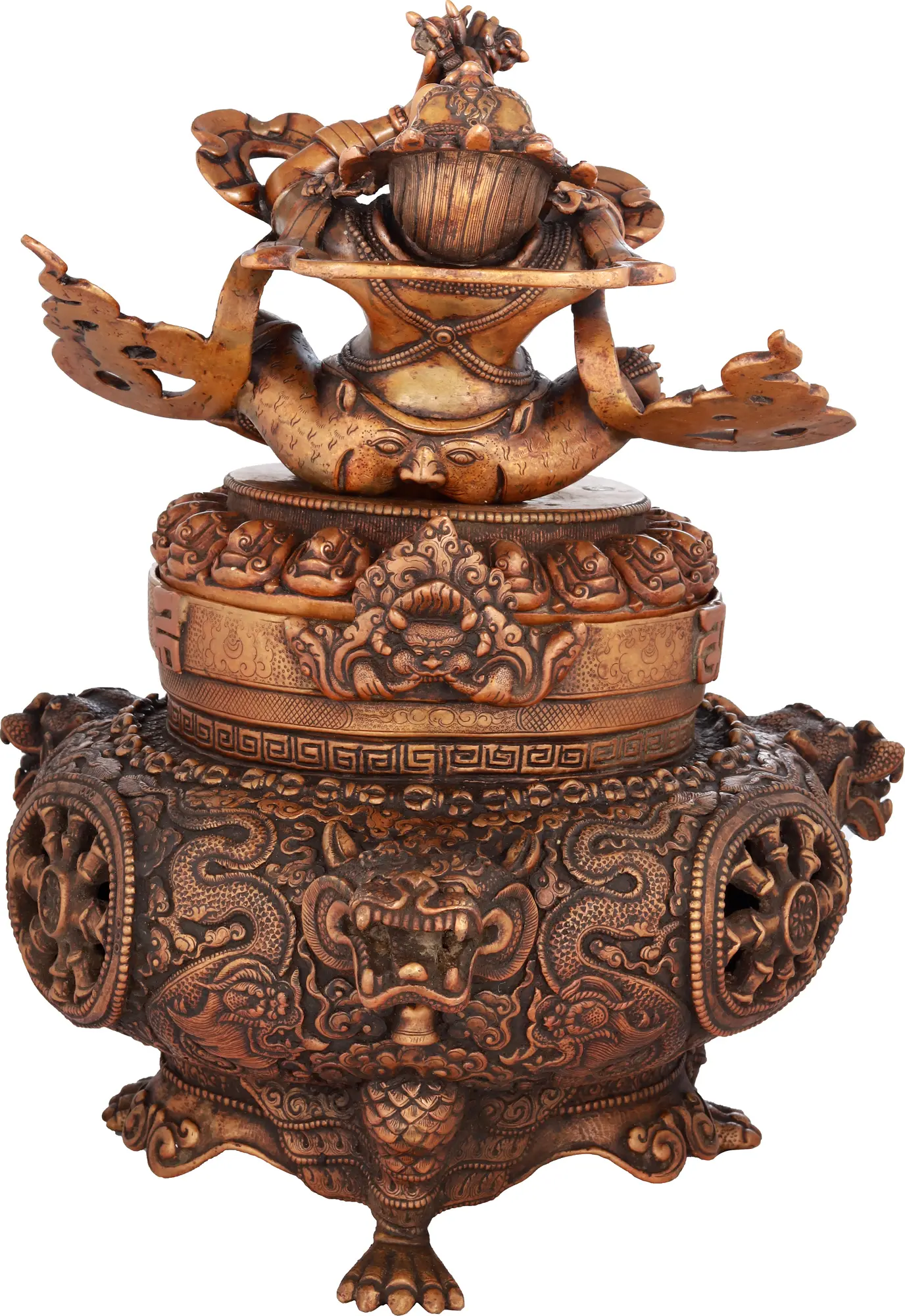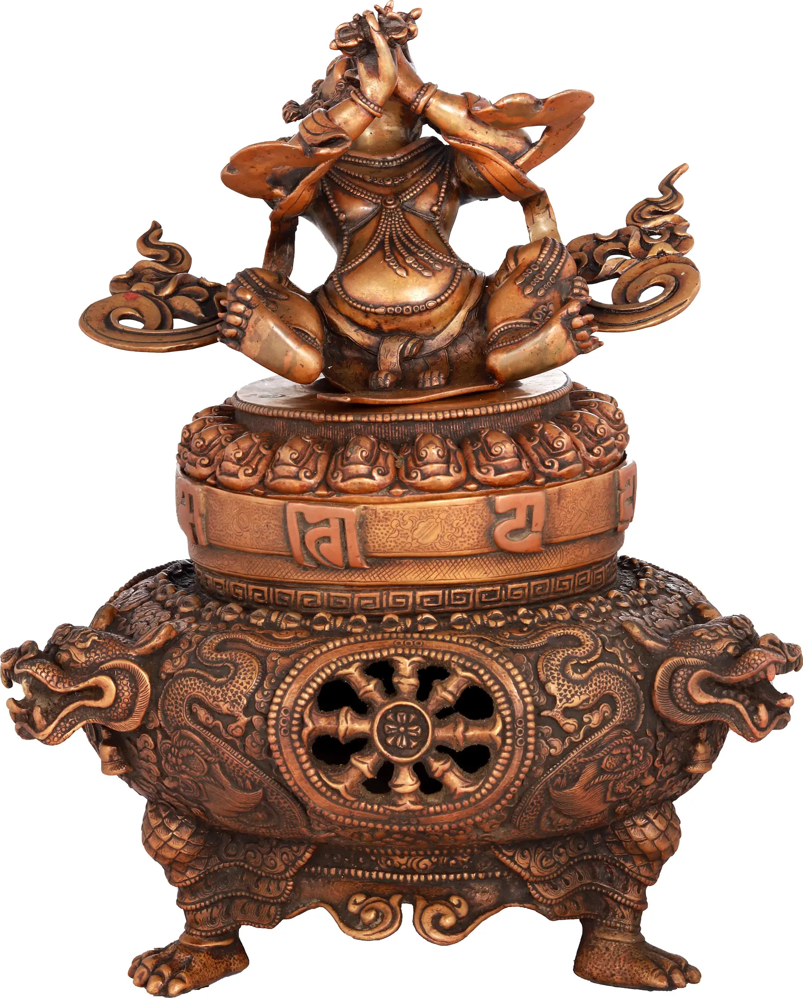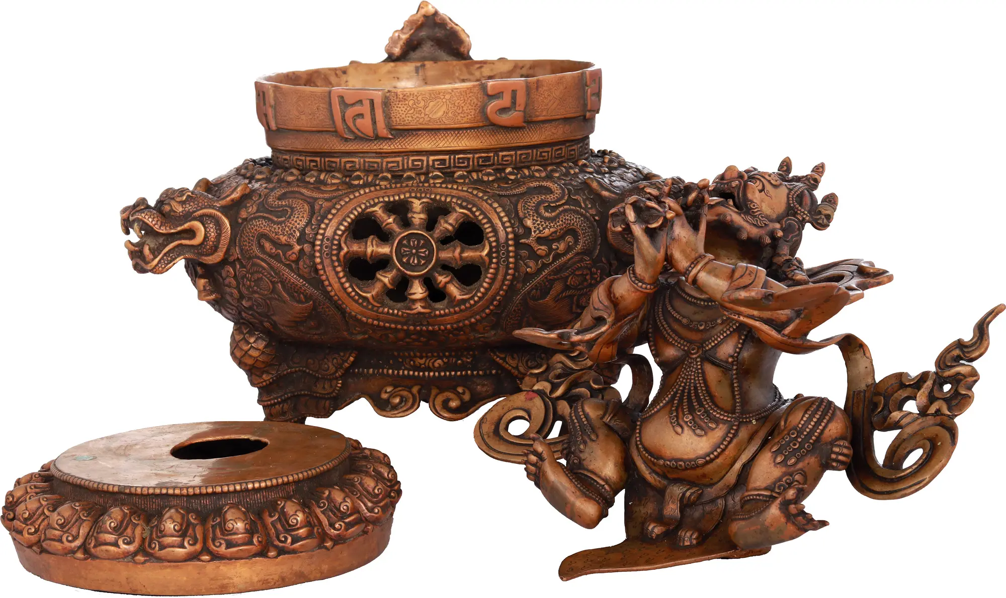 Crowning the vessel is a dynamic depiction of a Dakini, a celestial being within Tibetan Buddhism. Dakinis are often depicted as feminine figures who embody wisdom, spiritual power, and the transformative energy of consciousness. They are seen as messengers of the divine, guiding practitioners on the spiritual path and assisting in the overcoming of obstacles. The energetic pose and expressive features of the Dakini atop this burner suggest movement, vitality, and the fierce compassion that characterizes these enlightened beings. In Himalayan traditions, the Dakini can also be seen as a manifestation of pure awareness, dancing in the space between existence and non-existence, urging the practitioner toward liberation. The intricate detailing on the Dakini's form, from the flowing garments to the hand gestures, speaks to the skill of the artisans and their deep understanding of these sacred figures.