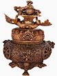 The design of this incense burner draws inspiration from powerful protective deities and symbols found throughout Buddhist cosmology. The base is adorned with fierce yet auspicious dragons, creatures of immense power and wisdom, often associated with safeguarding sacred sites and bringing good fortune. Their coiled forms and detailed scales convey a sense of primal energy and strength, symbolizing the warding off of negative influences. Within the dragon motifs, the Dharma Wheel, a central symbol of the Buddha's teachings, is prominently featured, signifying the path to enlightenment and the turning of the Wheel of Law.