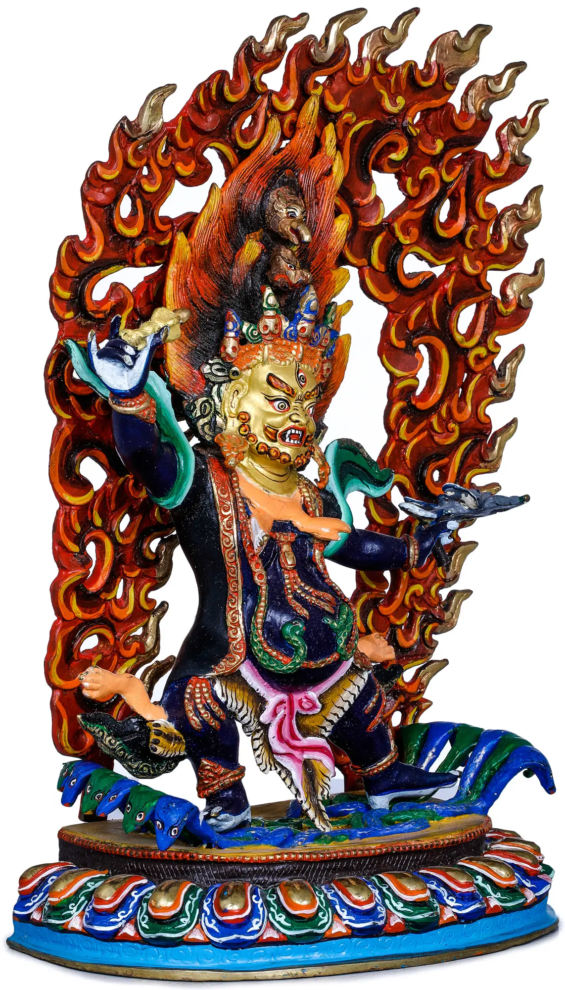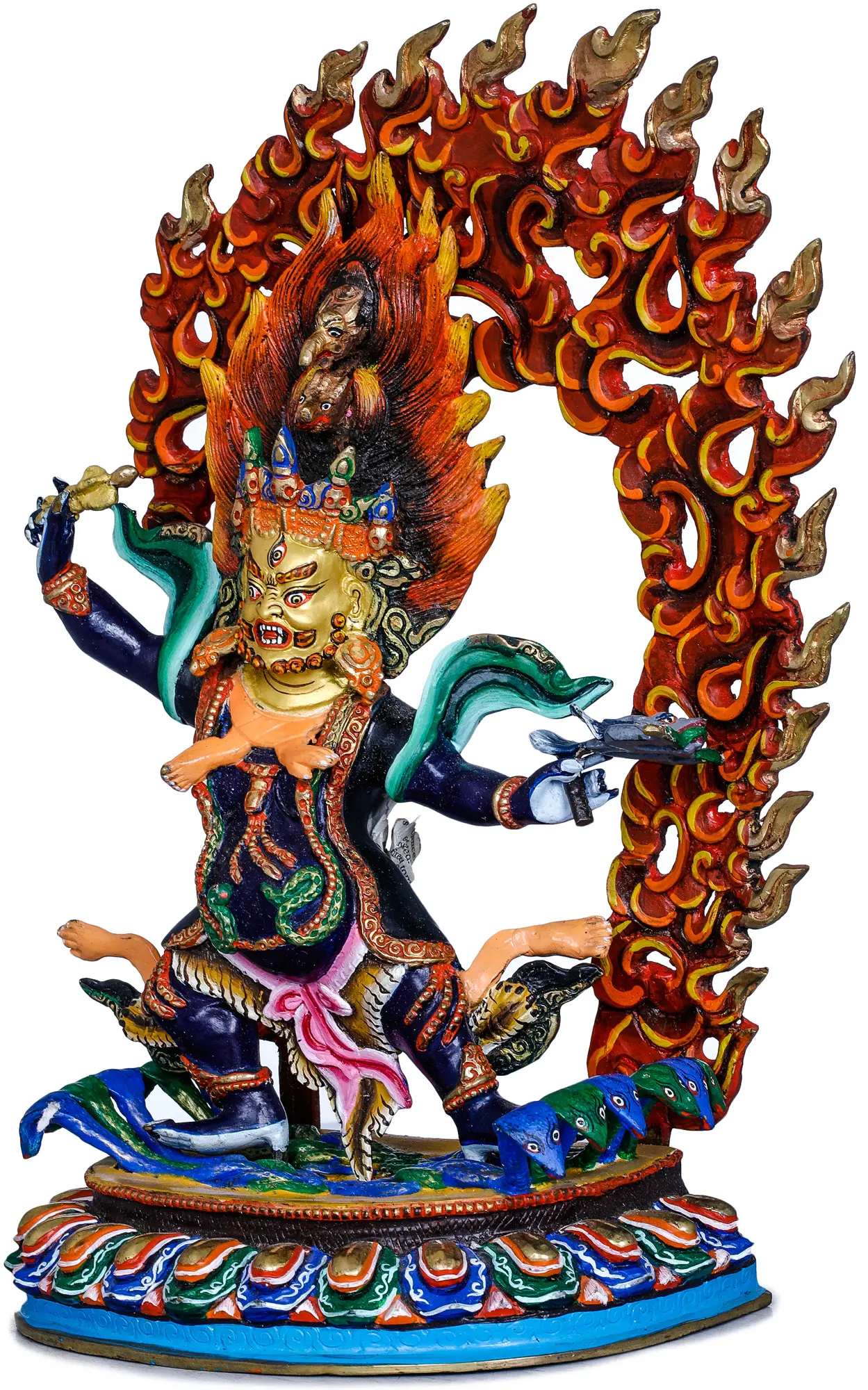 The artistry of this sculpture is evident in every detail. Hayagriva is often depicted with multiple faces, arms, and legs, symbolizing his vast wisdom and ability to act in myriad ways to protect his devotees. His fearsome expression, with bared fangs and bulging eyes, serves to strike terror into the hearts of demons and negativities. The flames that emanate from his body represent his purifying fire, capable of burning away ignorance, attachment, and all forms of suffering. The horse's head, often emerging from his crown or throat, is a key attribute, symbolizing his swiftness in conquering obstacles and his unrestrained energy. In Tibetan lore, Hayagriva is considered a manifestation of Avalokiteshvara, the bodhisattva of compassion, transforming his gentle essence into a powerful force for protection. He is invoked to overcome hindrances to spiritual practice, protect against black magic, and dispel ignorance.