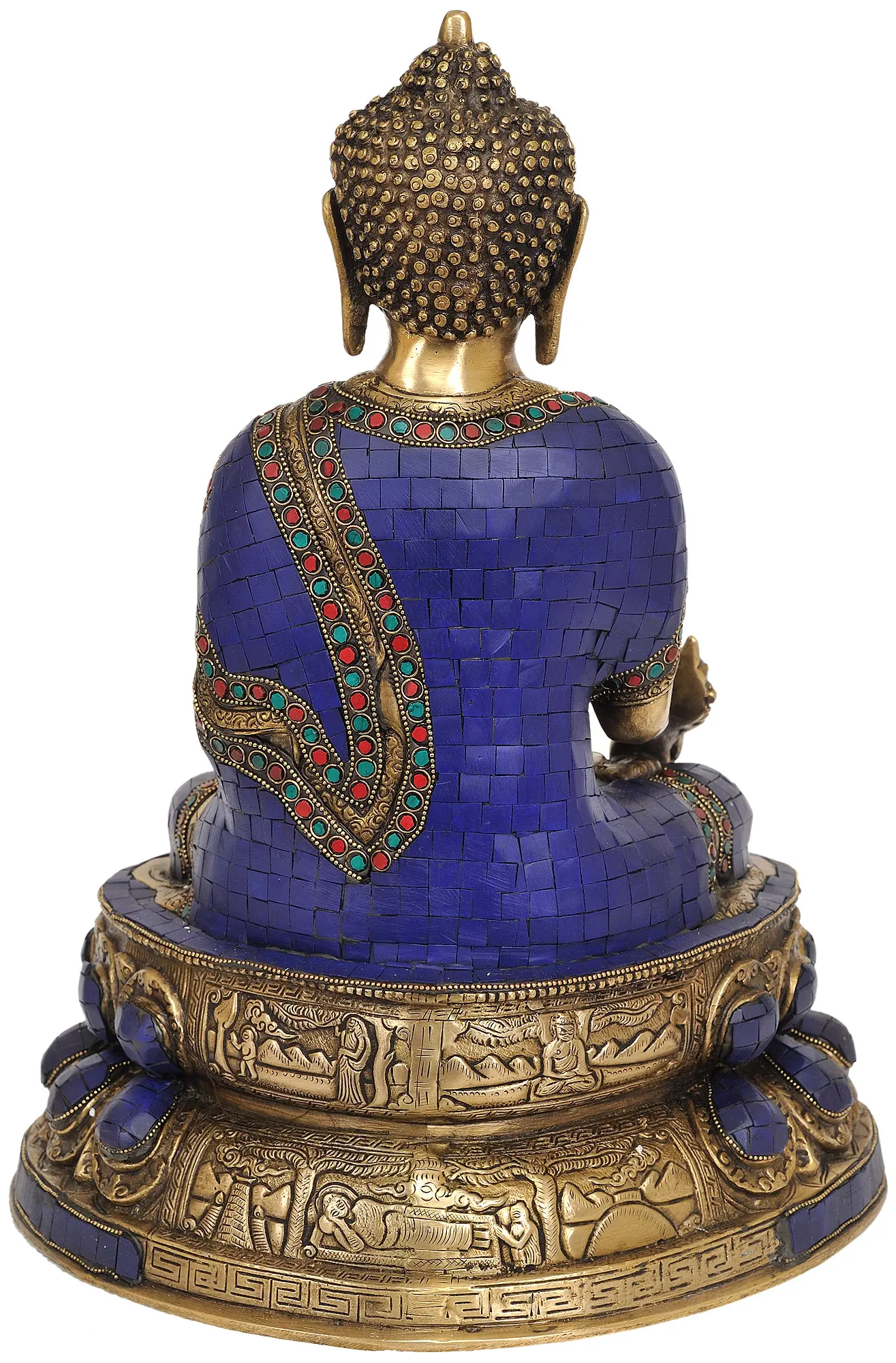 This brass statue, with its rich inlay work, is more than just a decorative object; it is a sacred icon that can inspire devotion and bring a sense of tranquility to any space. The meticulous attention to detail, from the delicate curls of the Buddha's hair to the ornate patterns on the throne, showcases the skill of the artisans. The combination of the warm glow of brass and the vibrant, precious inlays creates a visually captivating piece that is both spiritually uplifting and aesthetically pleasing. Whether placed in a home altar, a meditation room, or a place of contemplation, this Medicine Buddha statue serves as a constant reminder of the path to healing, compassion, and enlightenment. It is a treasure that carries profound spiritual significance and artistic excellence, destined to be cherished for generations.