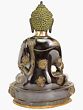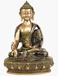 This exquisite brass statue portrays the Medicine Buddha, Bhaisajyaguru, a revered figure in Tibetan Buddhism, symbolizing healing, purification, and enlightenment. Seated in the serene lotus posture (Padmasana) atop a beautifully crafted lotus base, this deity embodies tranquility and boundless compassion. The rich copper tones of his robe are intricately adorned with silver-colored detailing, featuring auspicious symbols and patterns that speak to the depth of spiritual artistry. His face, cast in radiant gold, conveys a profound sense of peace, wisdom, and unwavering empathy, with eyes gently closed in meditation and a subtle, benevolent smile. ––––––––––
