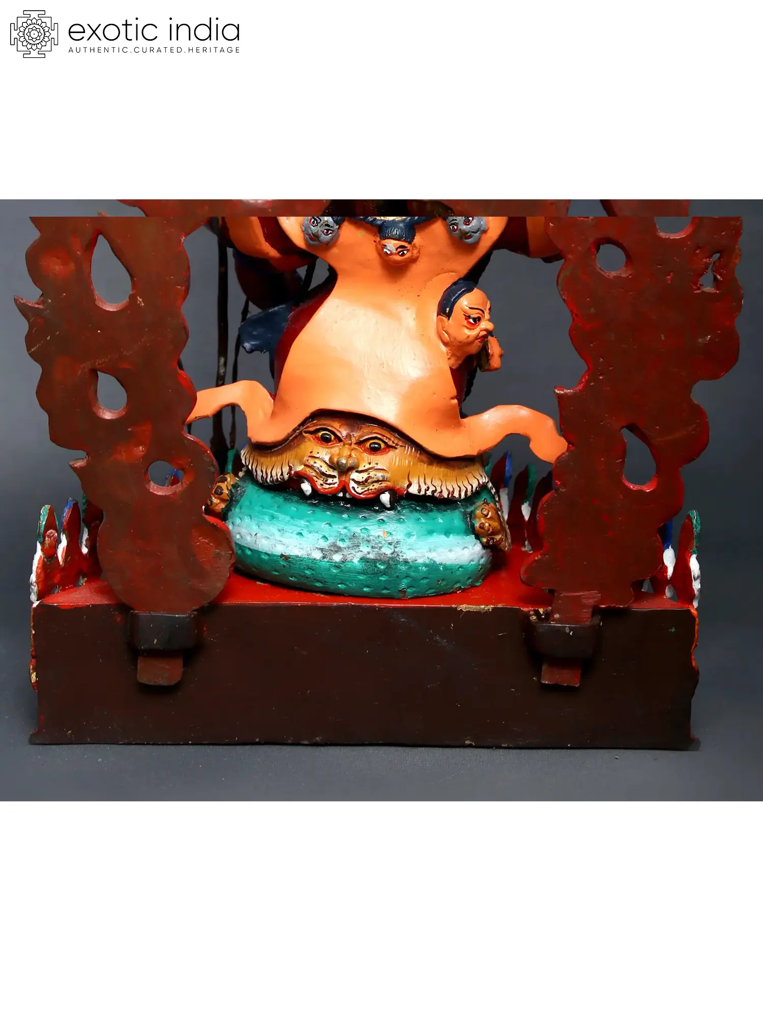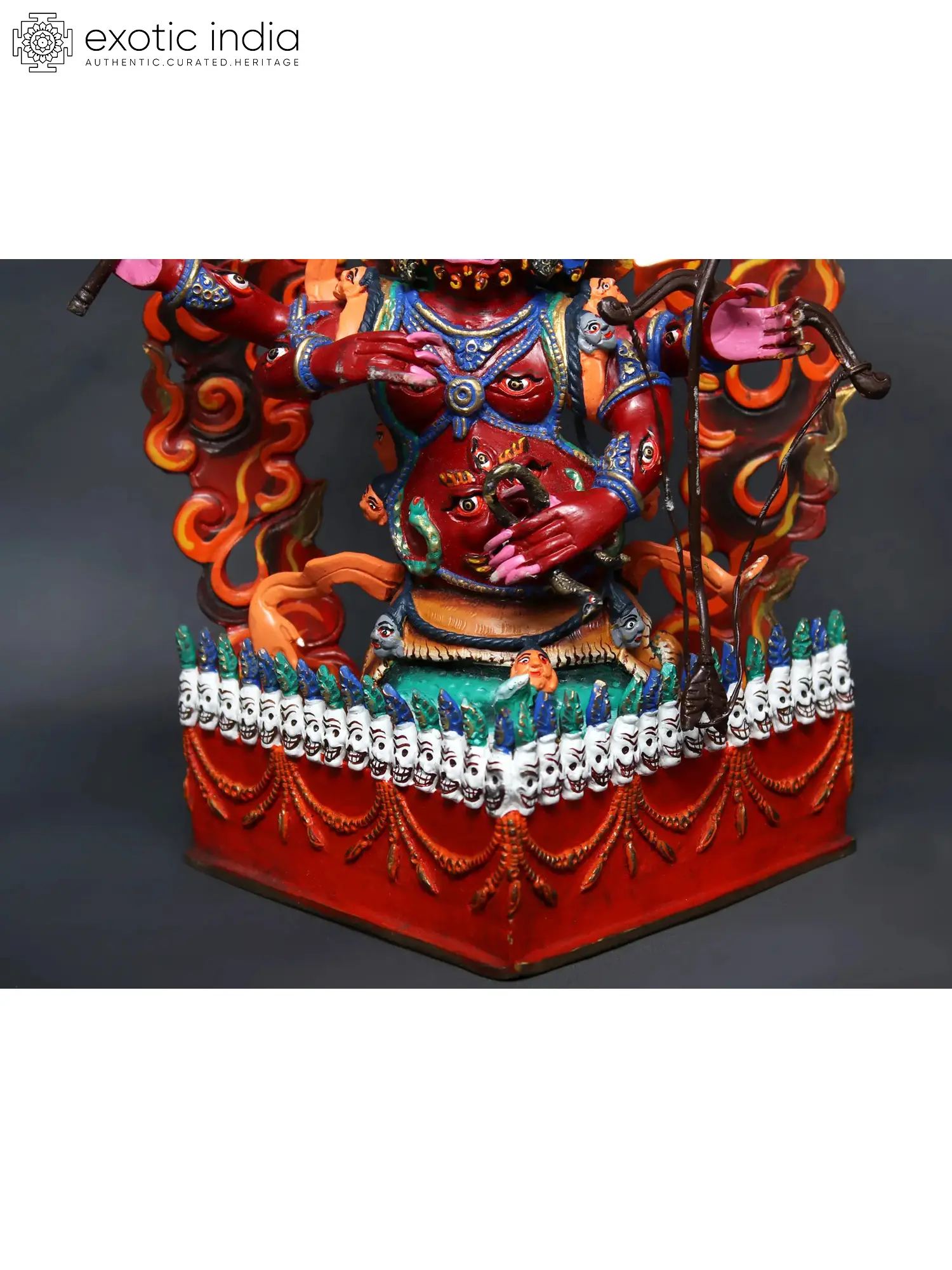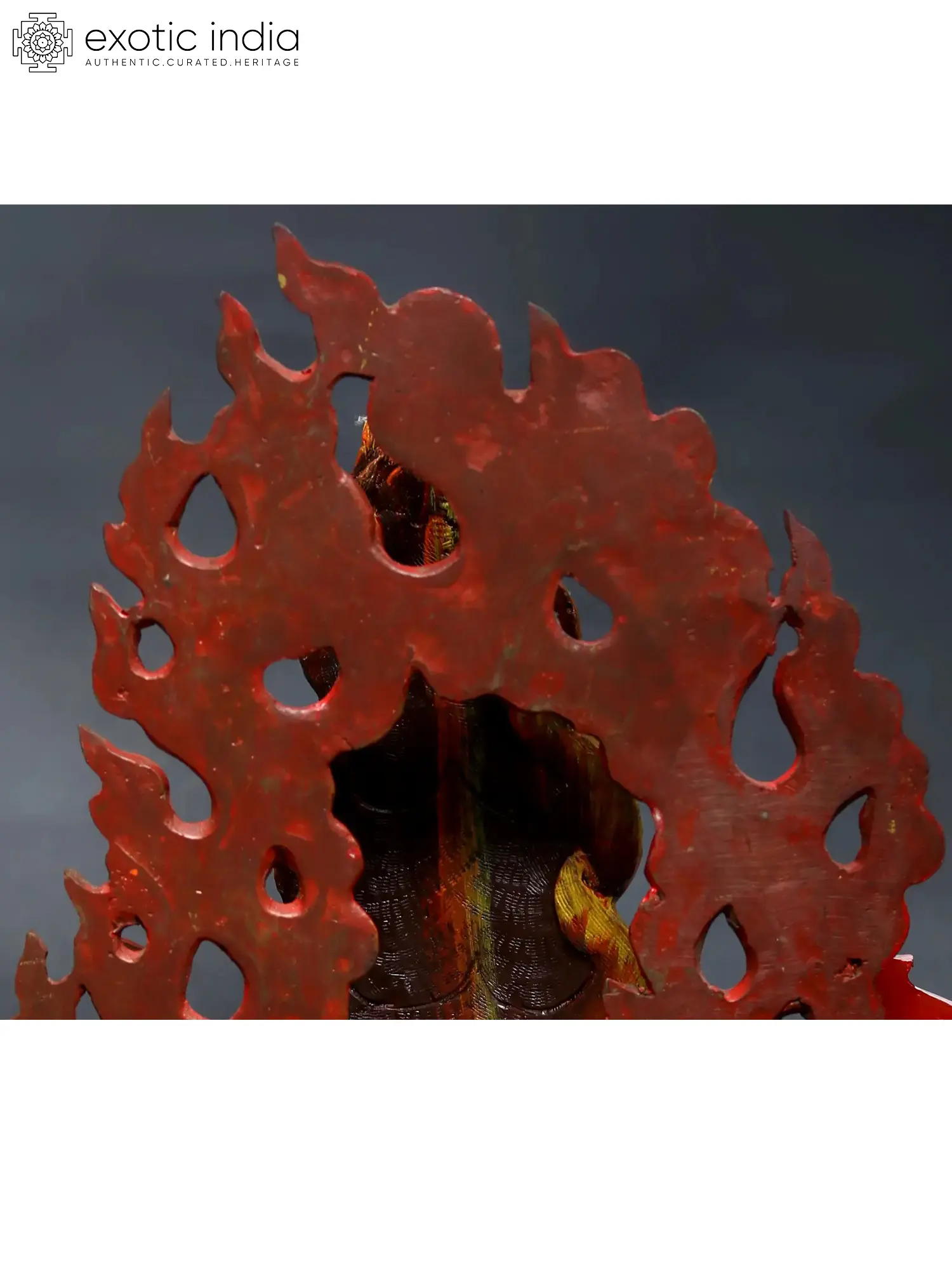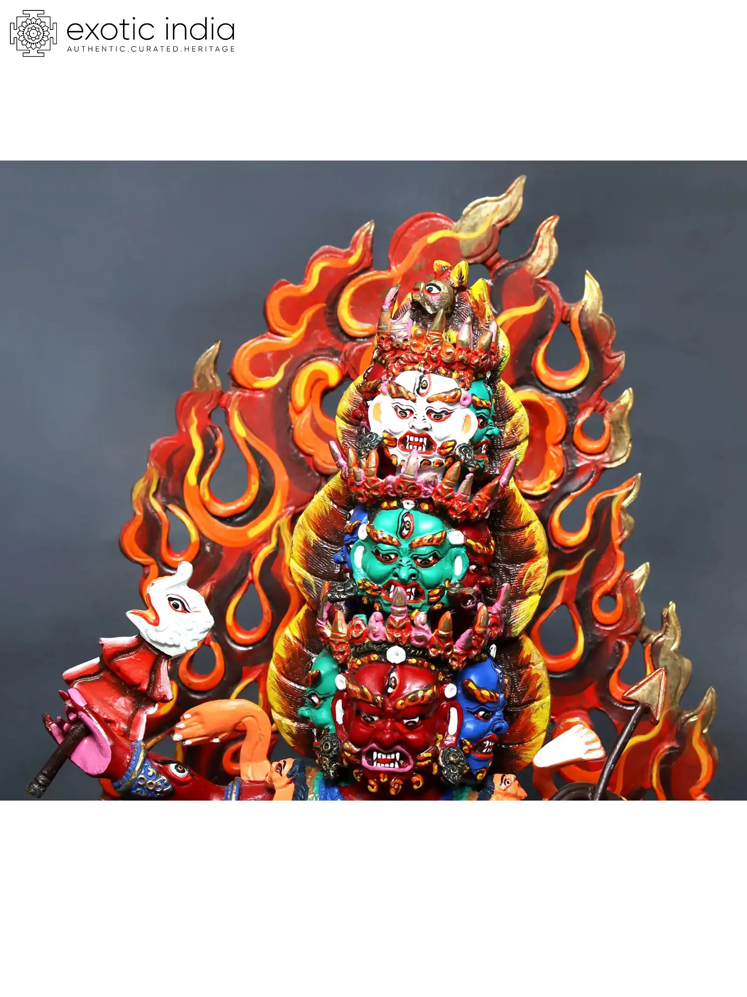 Rahula is a wrathful protector deity in the Nyingma school of Himalayan Buddhism, with nine ferocious faces layered one on top of the other and a huge gaping face on his body. Rahula is depicted in this Nepalese figure made with copper on a plinth adorned with tassels and laced with skulls. His dynamically positioned torso is surrounded by a blazing aureole, which further adds to the icon's ethereal aspect. Rahula in this statue calms and astonishes the viewer with his skills while carrying many weapons that quell the forces of evil.