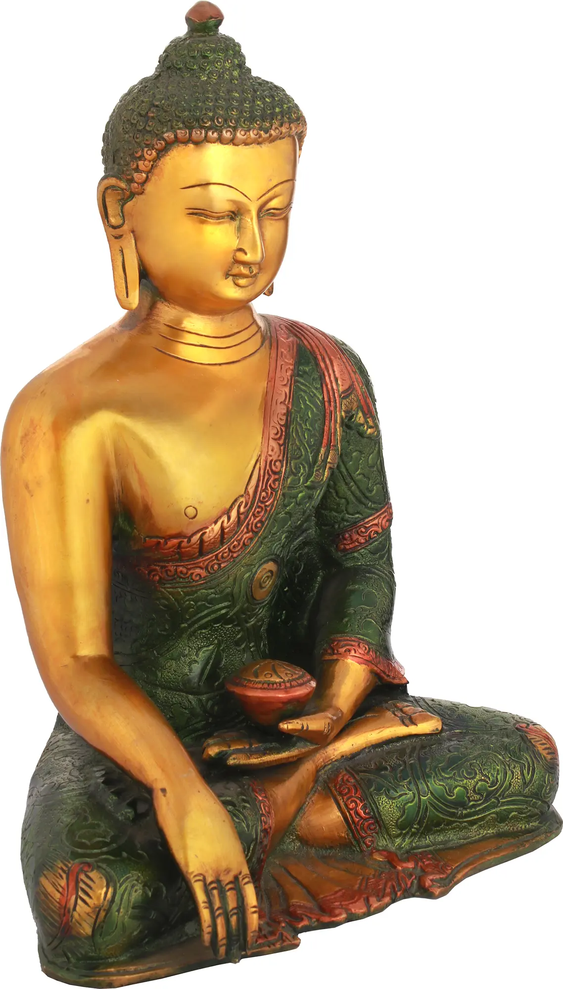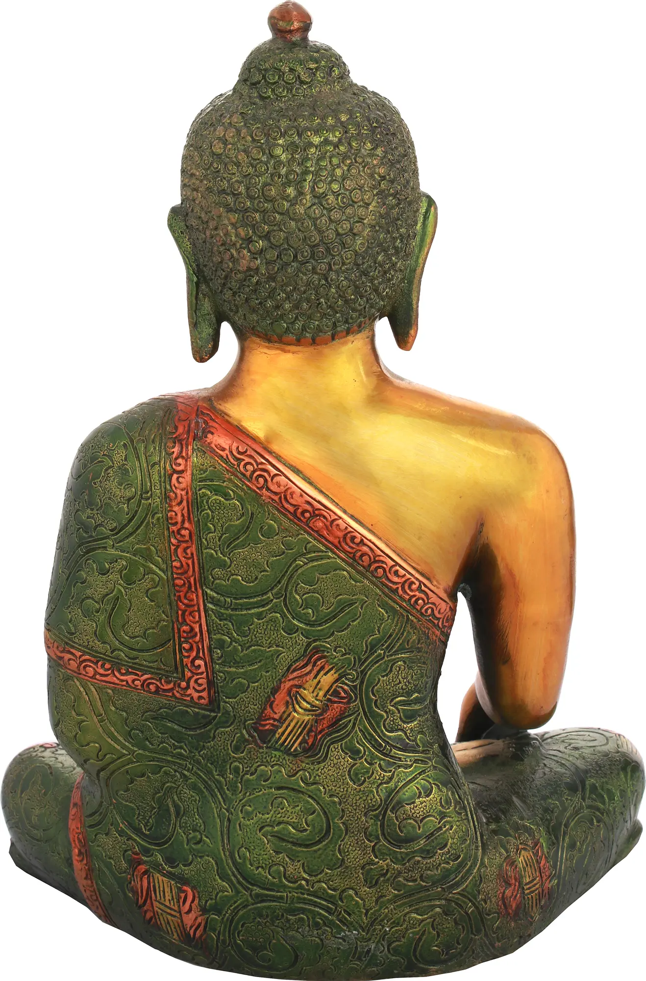 Embodying serenity and profound wisdom, this exquisite brass statue depicts Shakyamuni Buddha in a contemplative posture. Crafted with meticulous attention to detail, the figure radiates a sense of peace and spiritual grace that will undoubtedly enhance any sacred space or meditation corner. The warm gleam of the brass, accented by the rich green and subtle red hues of his monastic robes, invites a feeling of tranquility and introspection. This representation captures the essence of Siddhartha Gautama, the prince who renounced his worldly possessions to seek enlightenment and share his transformative teachings with the world. ––––––––––
