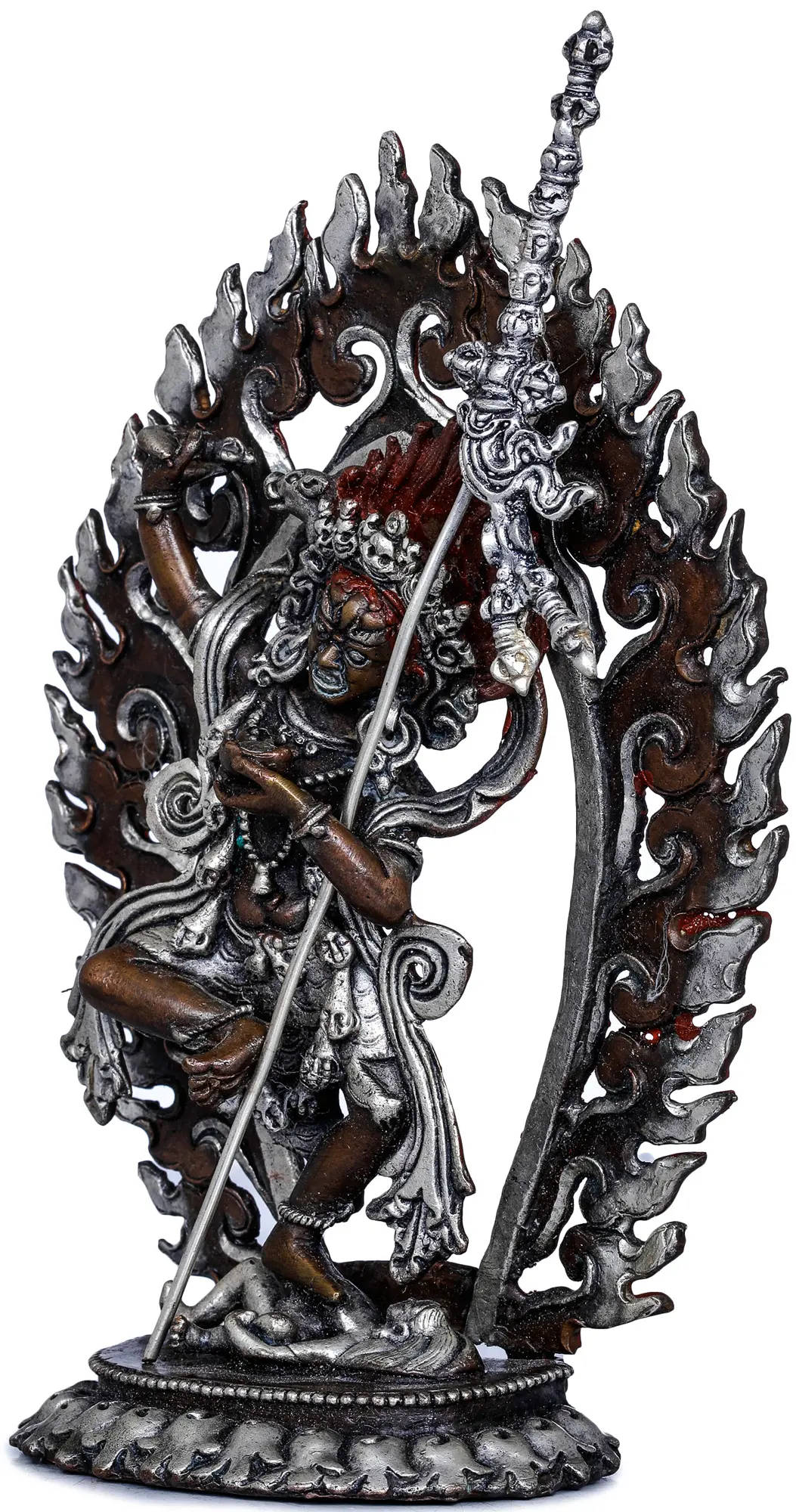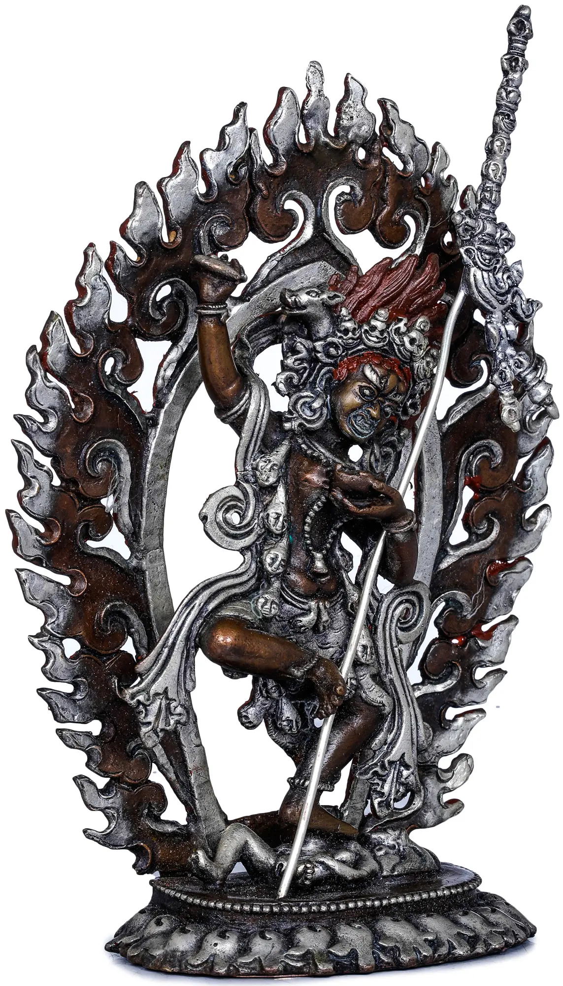 The most powerful Vajrayana goddess is Vajrayogini or Vajravarahi, a female yogi who has the potent abilities of Vajra (a Buddhist symbol for supreme wisdom), and whose awe-inspiring form is a representation of her unfathomable potential. This Nepalese statue of Vajrayogini is made of copper and surrounded by a fiery aureole that complements her raised hair. The Vajrayogini's fanged mouth, flaring nostrils, and furrowing brows give the icon a powerful theatrical value. The Tantric goddess, adorned with heavenly decorations and skulls, dances over a body representing people who cross the Dhamma's path.