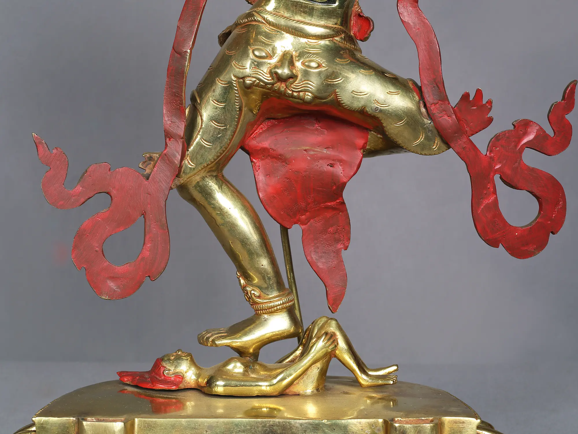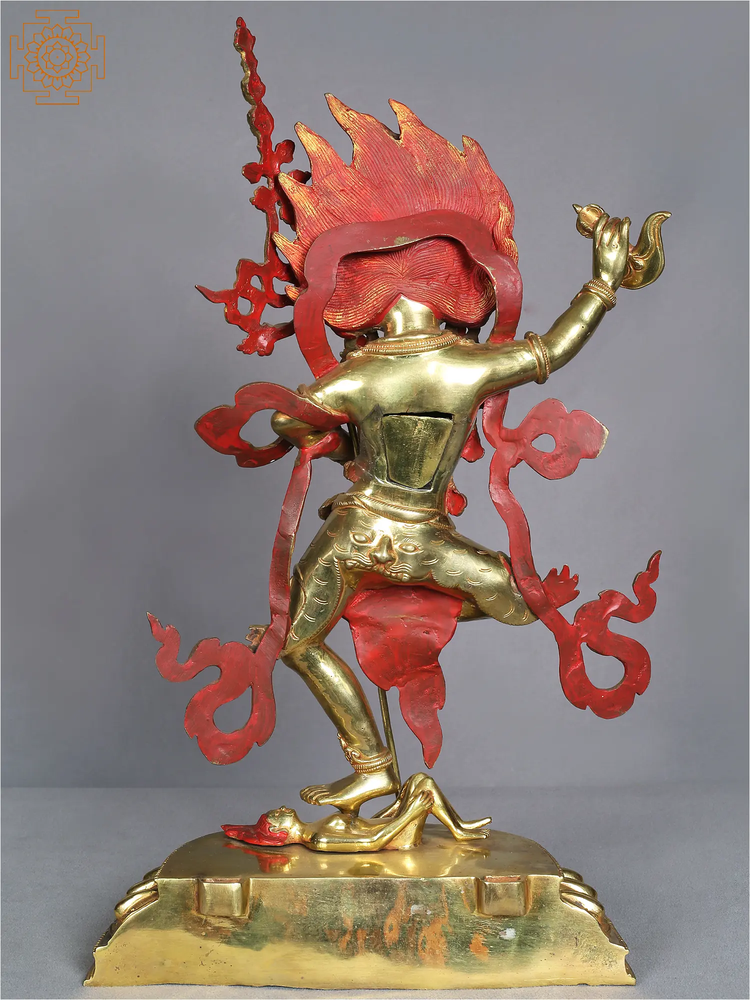 Vajrayogini- the female ascetic who holds the potent powers of Vajra (a symbol of supreme wisdom) in Buddhism is the most powerful Vajrayana goddess, whose awe-inspiring form is representative of her unimaginable potential. The aura of Vajrayogini in this gilded copper Nepalese statue is painted with flaming shades, matched by her raised hair. Frowning brows, flaring nostrils and fanged mouth of Vajrayogini instills a dynamic dramatic value to the icon. Adorned with heavenly ornaments and skulls, the Tantric goddess dances over a body, which symbolizes those who come in the path of Dhamma.
