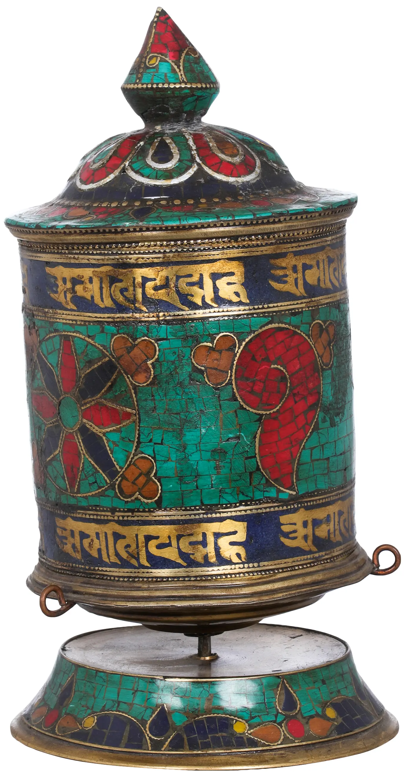 This remarkable prayer wheel is a visual masterpiece, meticulously constructed from durable brass. Its surface is adorned with intricate inlay work, featuring a captivating mosaic of vibrant stones, likely including auspicious turquoise and precious lapis lazuli, alongside striking red and orange accents. These rich colors evoke the celestial mandalas found in Tibetan art, symbolizing the universe and the enlightened mind. The golden Tibetan script, often containing the sacred mantra "Om Mani Padme Hum," graces the cylinder, a powerful invocation that resonates with centuries of devotion. The conical finial atop the wheel mirrors the same detailed inlay, crowned with a traditional stupa-like form, further enhancing its spiritual significance.