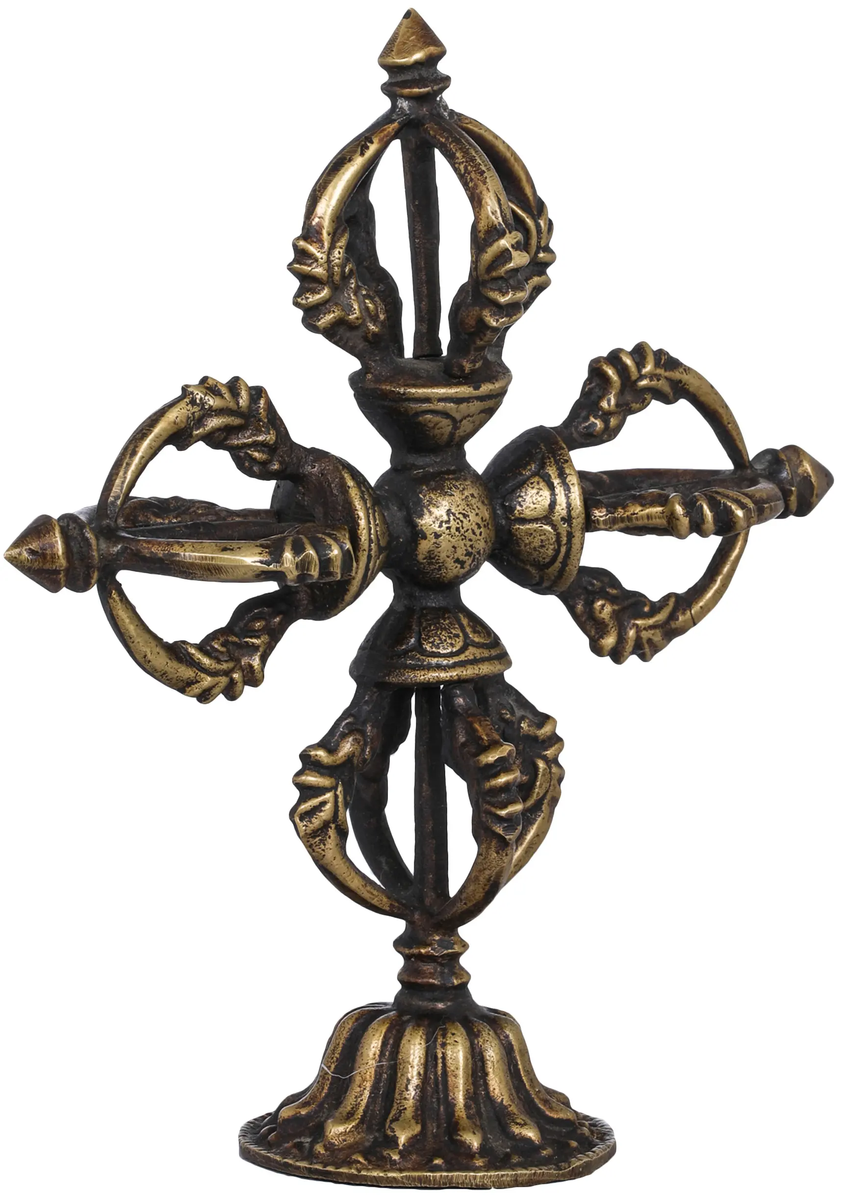 Crafted from durable brass, this statue is a testament to skilled craftsmanship. The rich, antique finish lends an air of age-old tradition and reverence to the piece. Its detailed rendering of the intricate patterns and sharp points of the Vishva-Vajra showcases the dedication of the artisan in bringing this sacred symbol to life. Mounted on a sturdy, decorative stand, it is designed to be a striking addition to any altar, meditation space, or home decor. Its compact size makes it versatile, allowing it to be placed thoughtfully on a shelf, desk, or sacred space.