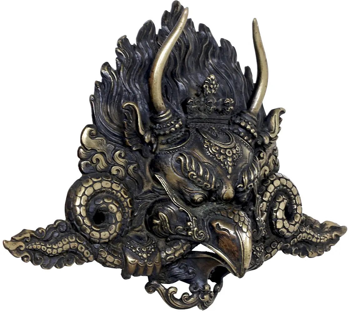 This magnificent copper mask, meticulously crafted in Nepal, brings the formidable presence of the Garuda, a celestial bird-like creature revered in Buddhist and Hindu traditions, into your space. With its striking long horns and fierce countenance, this mask is more than just a decorative object; it is a potent symbol of protection, power, and spiritual vigilance. The Garuda, often depicted as the king of birds and the sworn enemy of serpents, embodies the cosmic struggle against negativity and ignorance. It is said to be the mount of Lord Vishnu in Hinduism and plays a significant role in Mahayana Buddhism, where it is seen as a protector of Dharma.