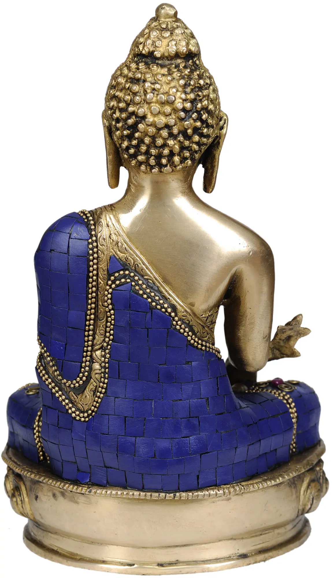 The striking blue of the lapis lazuli inlay holds significant cultural and spiritual meaning. In ancient traditions, lapis lazuli was prized for its celestial, sapphire-blue color flecked with gold, reminiscent of the night sky. It was associated with royalty, divinity, and spiritual power. In Tibetan Buddhism, the color blue is often linked to healing, wisdom, and the infinite nature of the cosmos. The integration of this precious stone into the Buddha's robes suggests a connection to these powerful attributes, imbuing the statue with an aura of healing energy and spiritual insight. The small red accents interspersed with the blue offer a counterpoint, often symbolizing compassion or the life force. ––––––––––