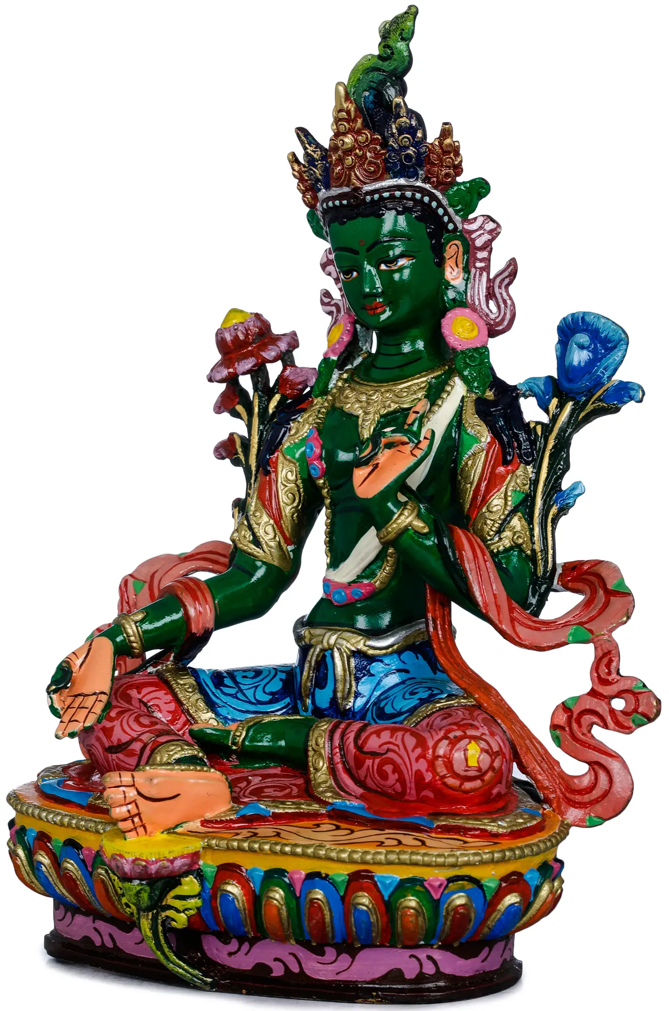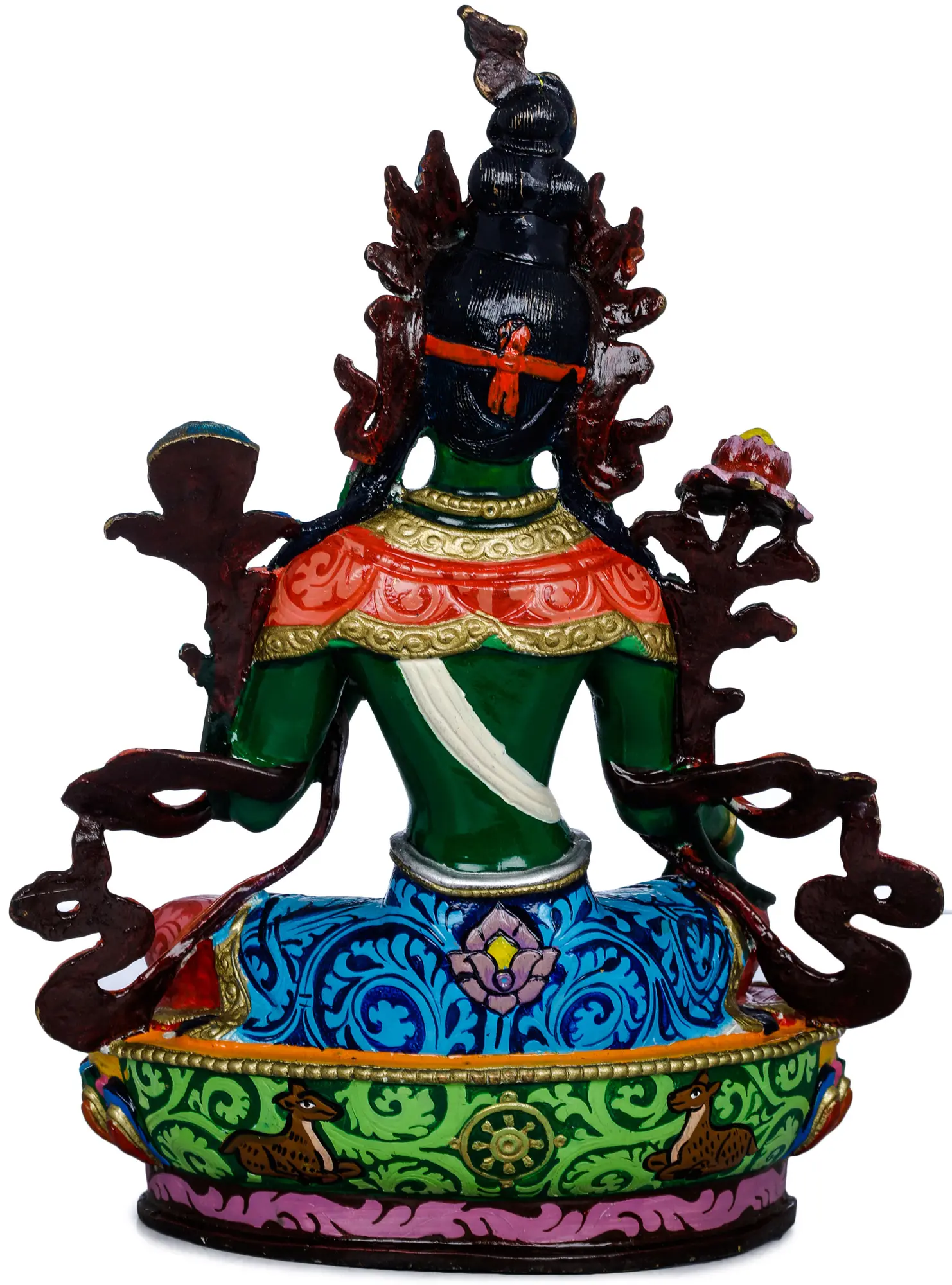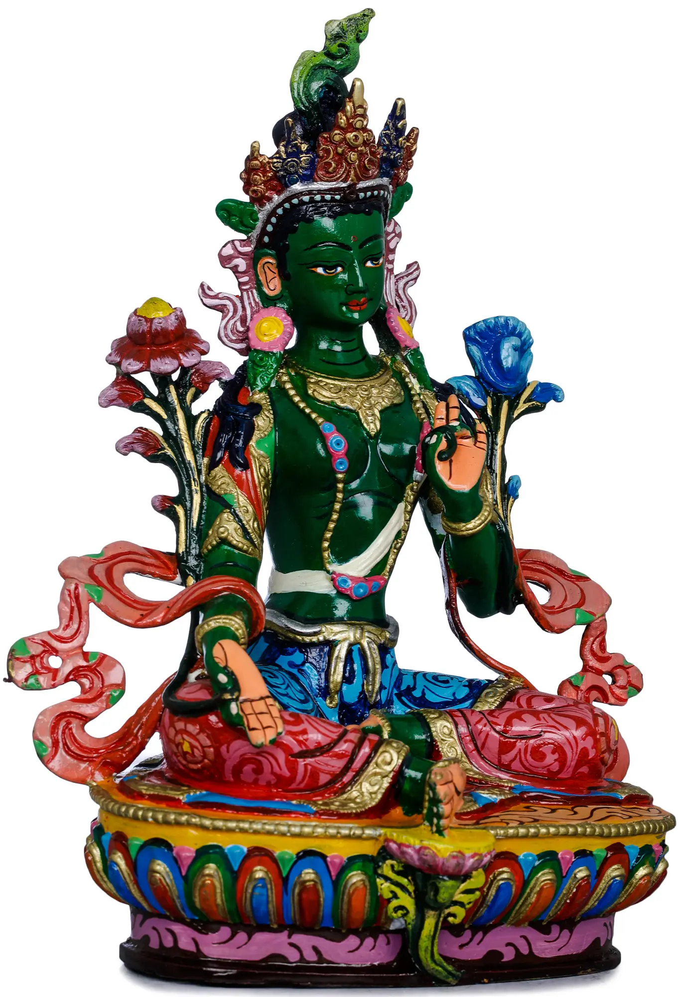 Here Green Tara is depicted as sitting on a unique colorful lotus throne; right leg extended showing her readiness to come into action and left leg folded in a meditation posture on the lotus pedestal. Left hand is in vitarka mudra forming a gesture of teaching and right hand is in varada Mudra, in a gesture of charity. Her primary cognizance, a closed blue colored lotus (utpala), appears at her left shoulder symbolizing enlightenment and a full grown pink lotus showcasing purity. She wears a richly patterned pink and blue skirt with a pink colored stole across her shoulders hanging on arms’ sides too; ornamented with a flamboyant jewel crown and two necklaces. This array is complemented by armlets, bracelets, anklets and a girdle. Her vibrant green color and youthful body symbolize her valour and activity.