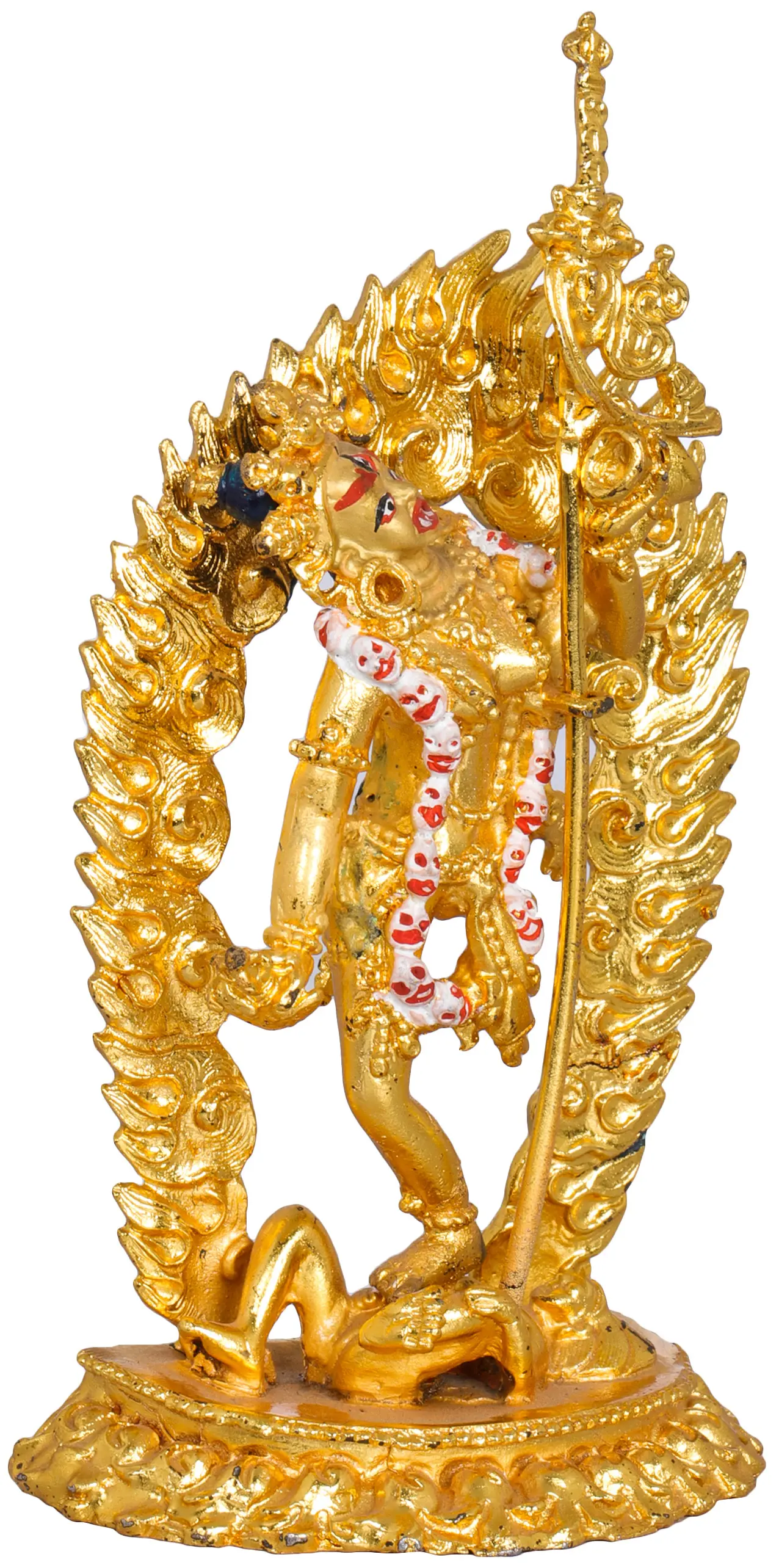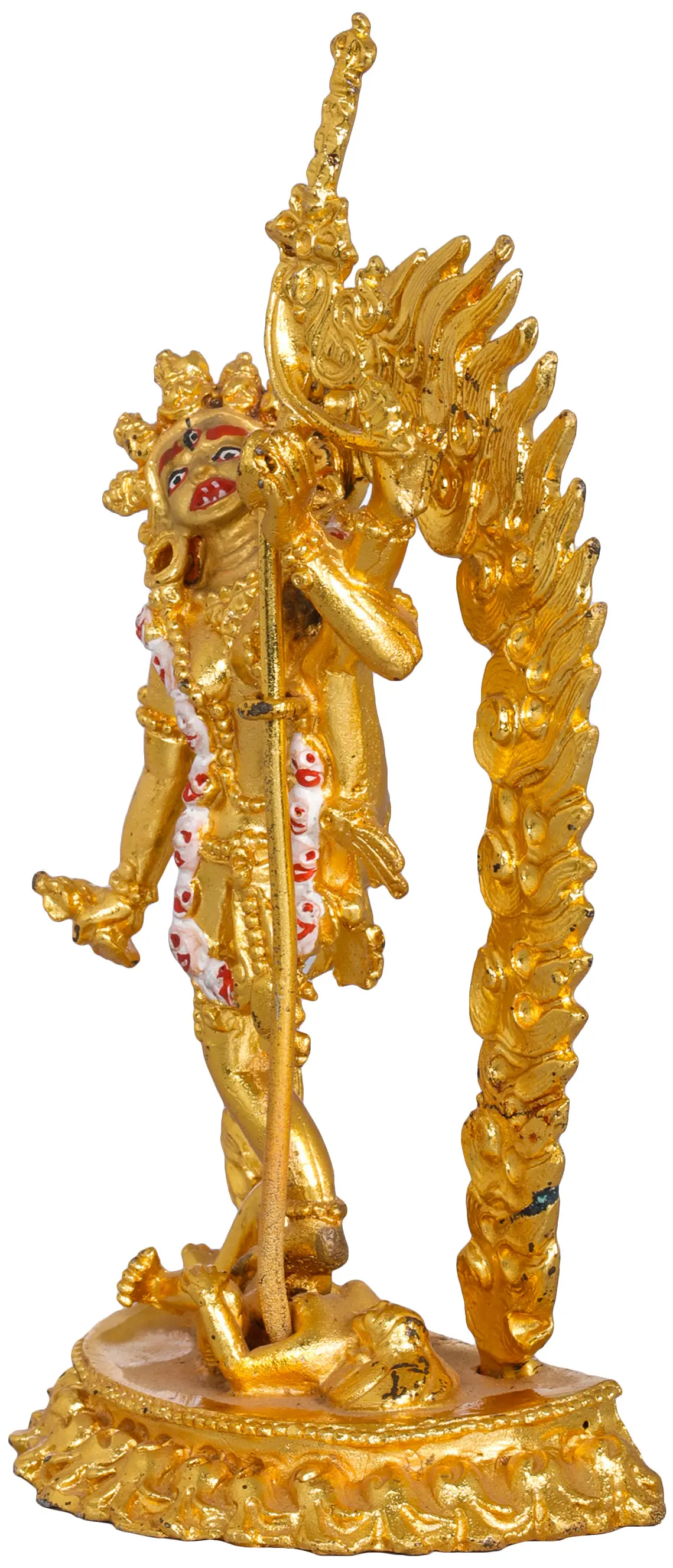 This exquisite copper statue, gilded with a radiant gold finish, captures the essence of Vajrayogini, one of the most revered goddesses in Tibetan Buddhism. Known as the "Vajra Yogi," she is a dakini, a celestial being who embodies wisdom, enlightenment, and the fierce, untamed energy of the awakened mind. Her form, dynamic and powerful, is depicted within a nimbus of flames, symbolizing her ability to burn away ignorance and suffering. Vajrayogini is often associated with the tantric practices of the Vajrayana tradition. She is seen as the epitome of female enlightened energy, capable of transforming even the most negative emotions into wisdom. In many traditions, she is the principal deity of the Chakrasamvara Tantra, a text that outlines profound methods for achieving enlightenment in a single lifetime. Her presence signifies the ultimate union of wisdom and method, bliss and emptiness.