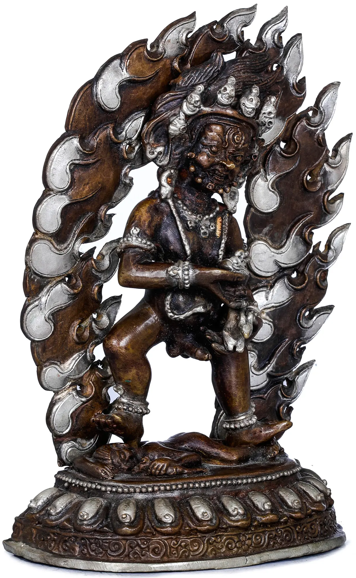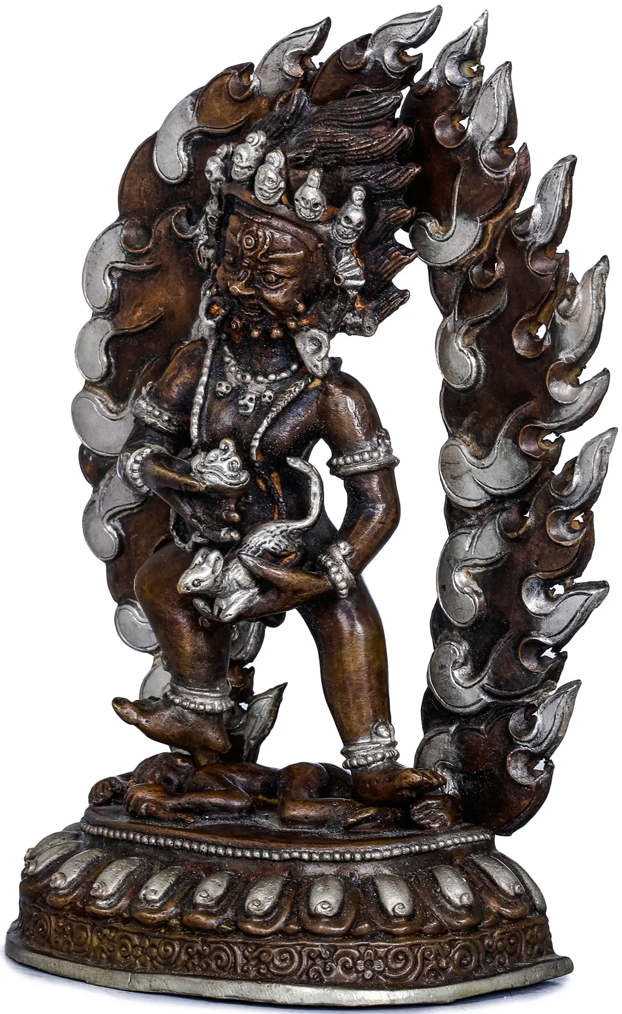 This copper statue from Nepal depicts Lord Kubera, the Hindu-Buddhist protector, and bestower of prosperity, in a ferocious and active pose, surrounded by flames of enlightenment. He controls the enemy of Dharma beneath his feet while holding his mongoose and skullcup and is adorned with priceless and ethereal jewelry. The powerful abilities of a heavenly guardian are embodied by Kubera in this form, which is enlivened by the three eyes on his face and his fierce expressions.