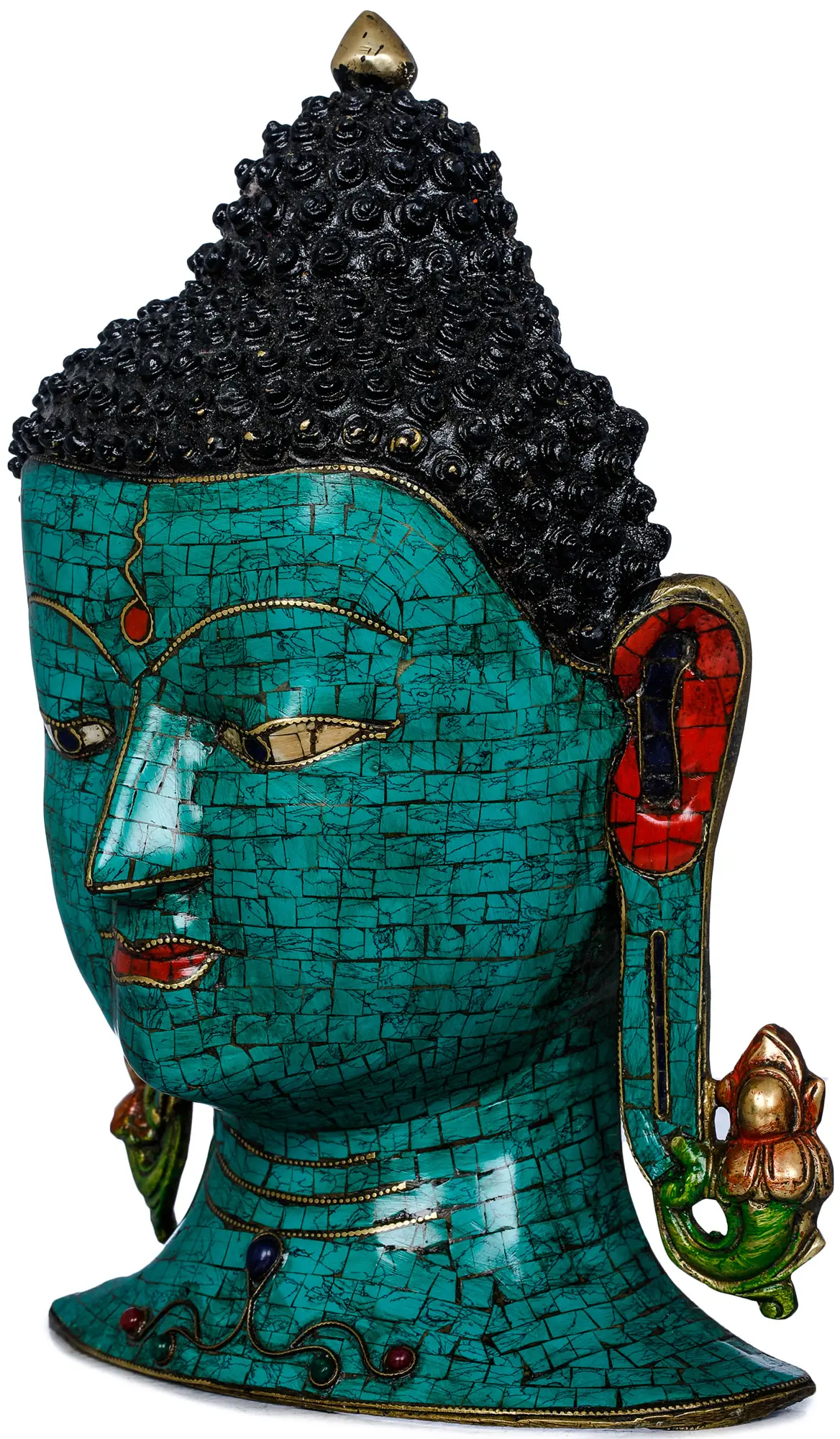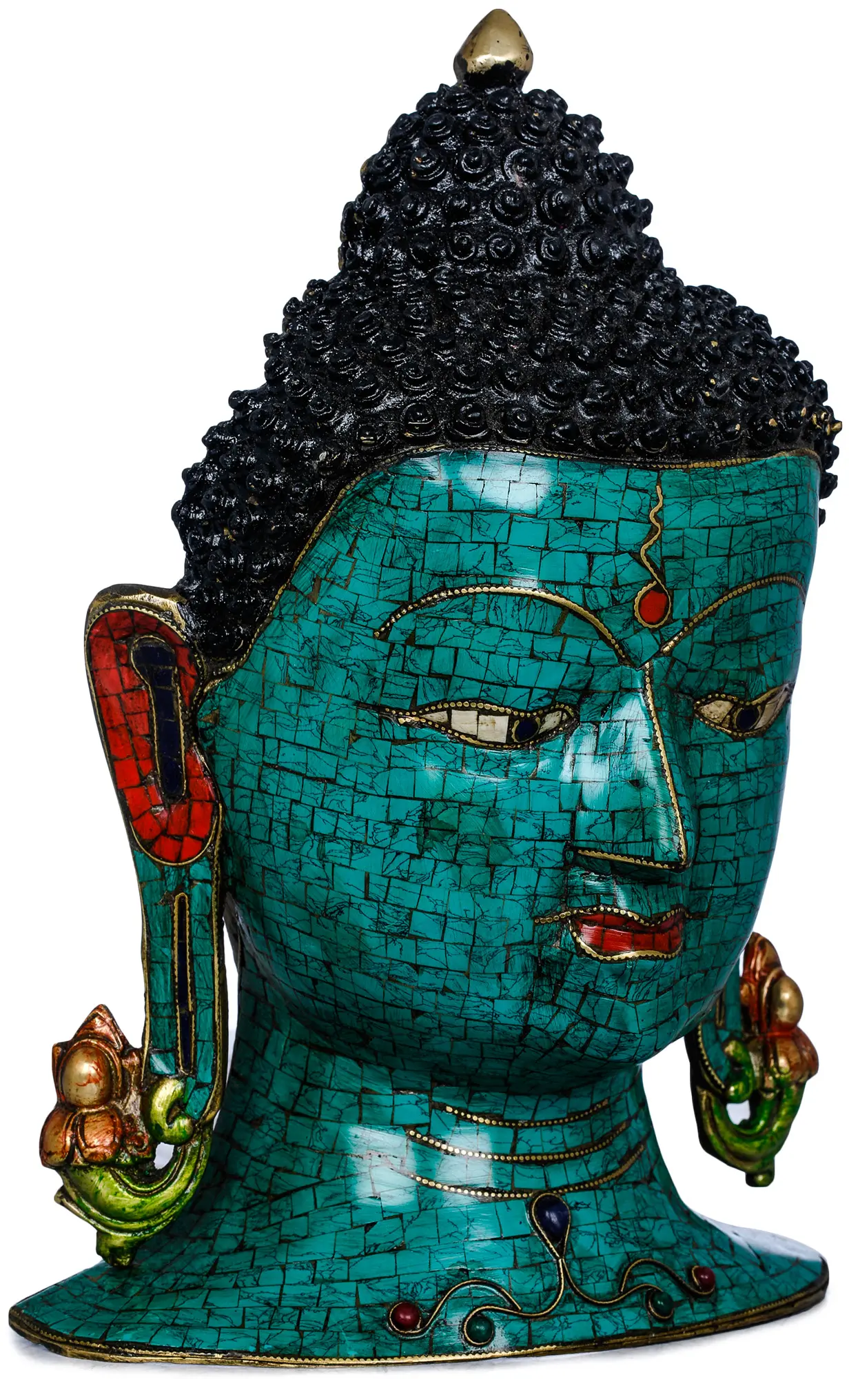 The striking teal hue that adorns the face is not merely a color, but a vibrant mosaic of hand-inlaid stones. Each tiny piece is carefully placed, creating a textured, almost breathing surface that captivates the eye. Delicate gold inlay work traces the contours of the lips, the elegant curve of the eyebrows, and the urna—the auspicious mark between Buddha's eyebrows, symbolizing his insight and cosmic vision. The deep, curly locks of hair, rendered in a rich black finish, contrast beautifully with the turquoise tones, culminating in a golden finial that crowns the serene visage. The elongated earlobes, a common attribute of Buddhas, signify detachment from worldly possessions and a deep connection to the suffering of all beings.