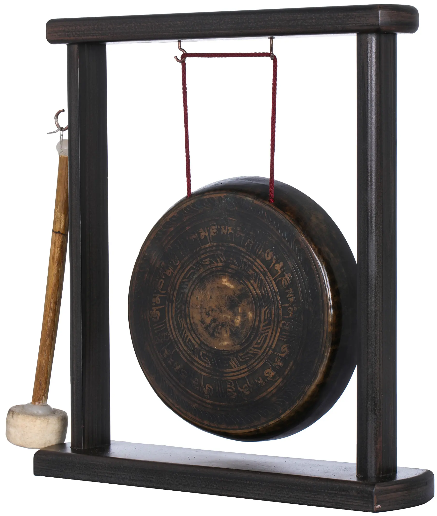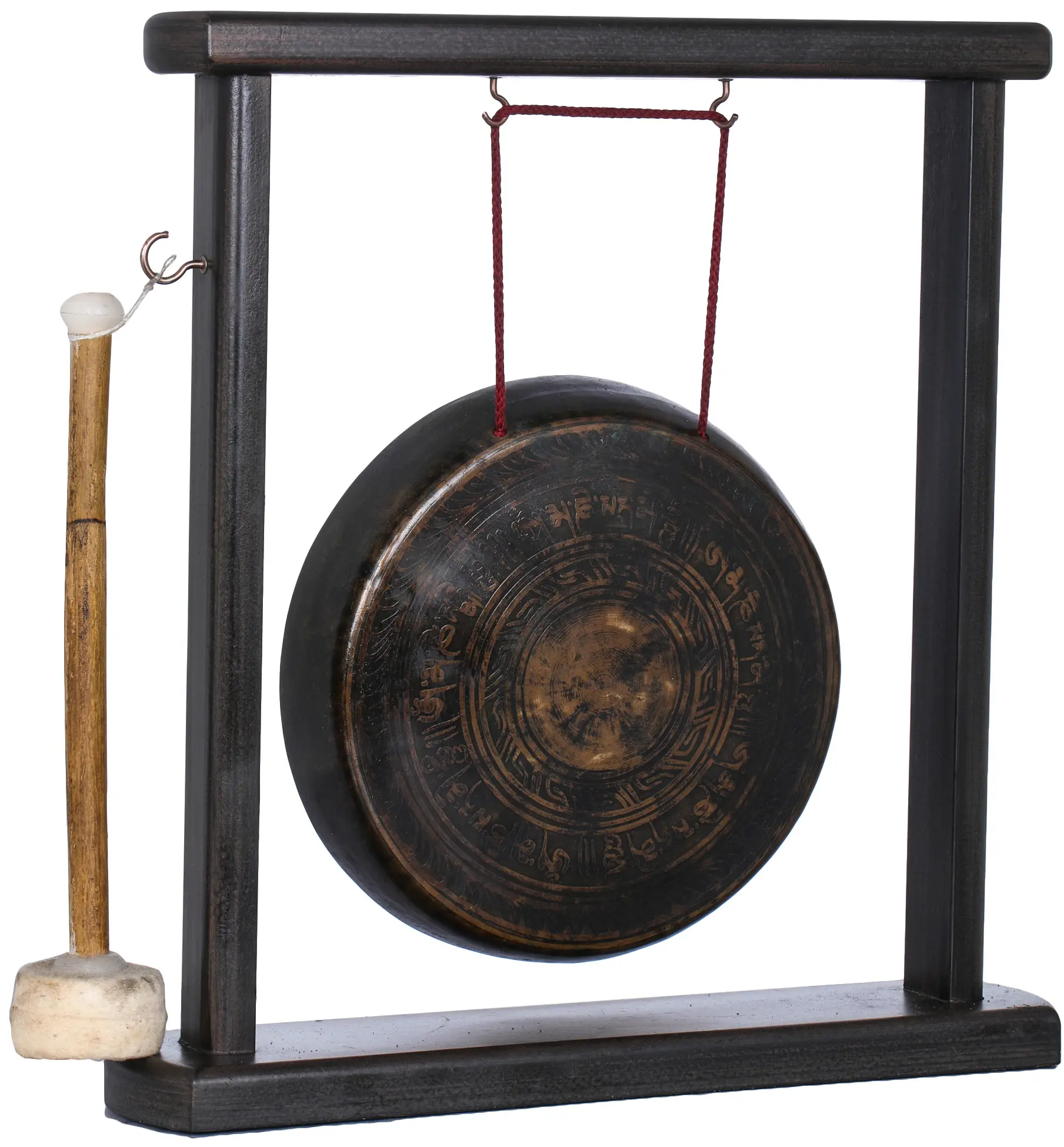 The gong itself, forged from durable bronze, offers a warm, sustained tone that deepens with each strike. The intricate circular patterns and script etched into its surface speak of its ceremonial purpose. The accompanying wooden stand, a testament to skilled craftsmanship, provides a stable and elegant display for the gong. Its dark, rich finish complements the metallic sheen of the bronze, creating a harmonious aesthetic that fits seamlessly into any space dedicated to mindfulness or spiritual practice. The mallet, designed with a padded head, ensures a clear and full resonance when struck. This gong is more than an artifact; it is an invitation to cultivate inner peace. Whether used in a meditation practice, for gentle awakenings, or simply as a beautiful and meaningful decorative piece, its presence evokes a sense of sacredness and calm. It serves as a reminder of the timeless pursuit of enlightenment and the power of sound to transform our inner world. Bring a piece of this ancient spiritual heritage into your home and experience its profound, calming influence.
