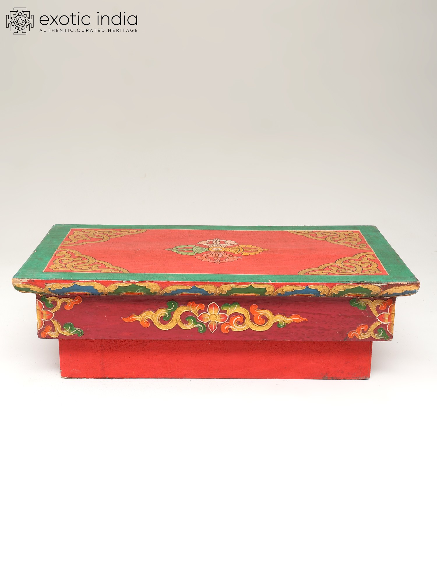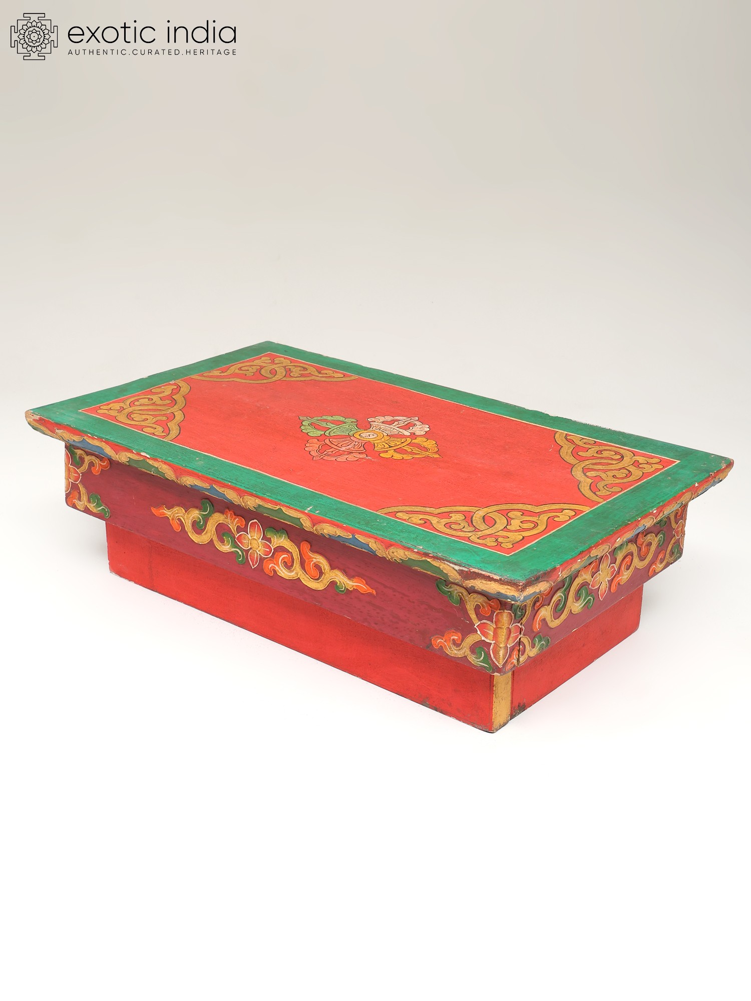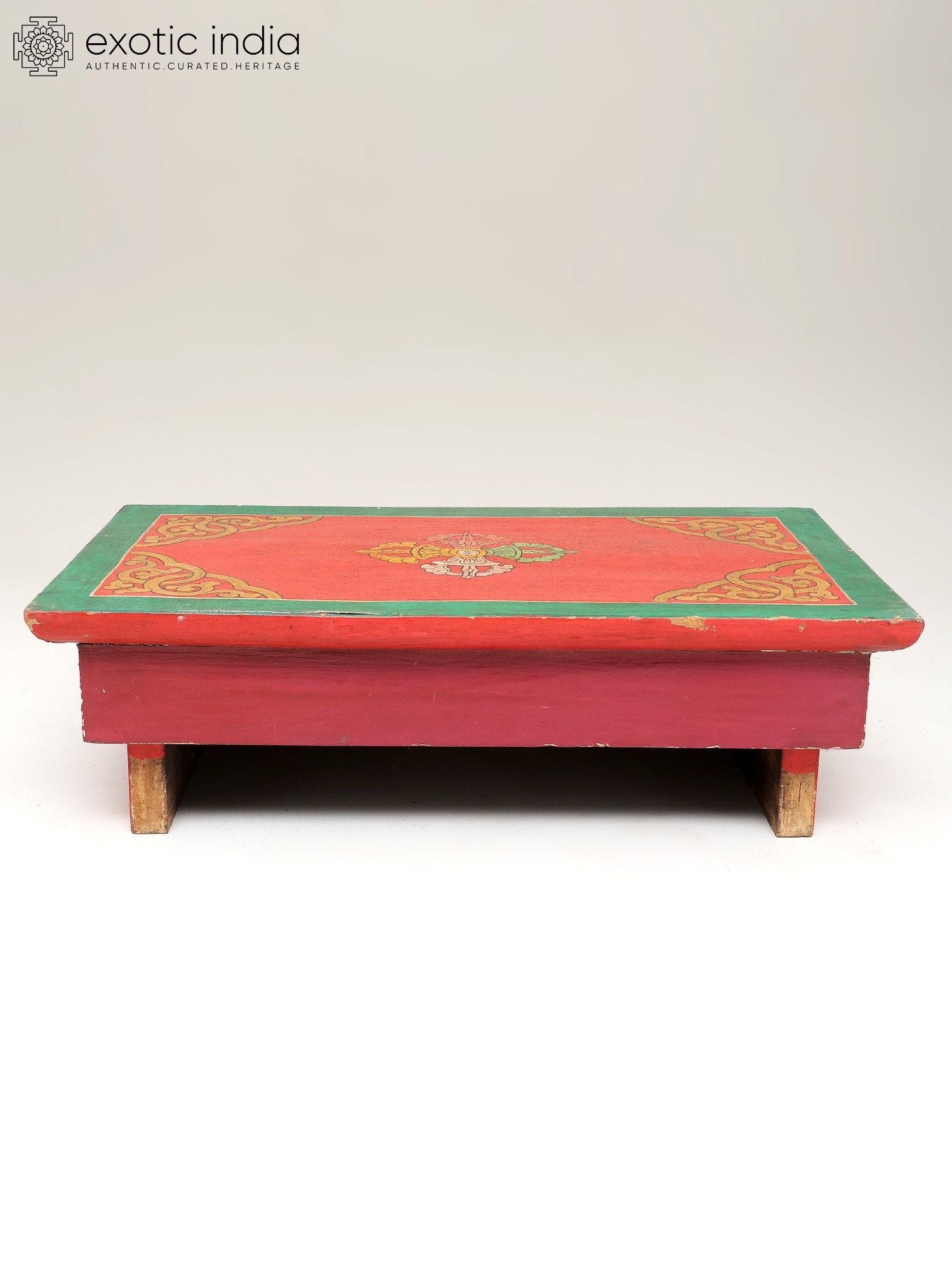 This meticulously crafted Tibetan Buddhist ritual desk, hailing from the heart of Nepal, is more than just a piece of furniture; it's a portal to a rich spiritual heritage. Its vibrant hues and intricate designs tell stories of devotion and tradition, reflecting centuries of Buddhist practice in the Himalayas. The desk's compact size (4.5 x 16.0 x 9.5 inches) makes it perfect for personal altars or smaller spaces, allowing you to create a sacred focus for your meditation and prayers. Constructed from durable wood, it embodies the timeless quality and enduring strength associated with the spiritual practices it serves. The rich red base, accented by the striking green and gold detailing, evokes the energy of fire and earth—elements fundamental in Buddhist cosmology.