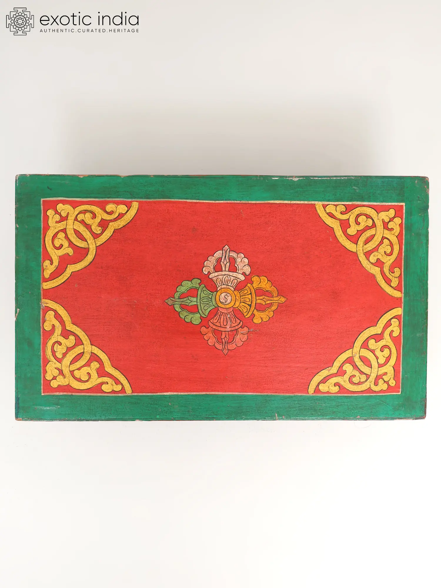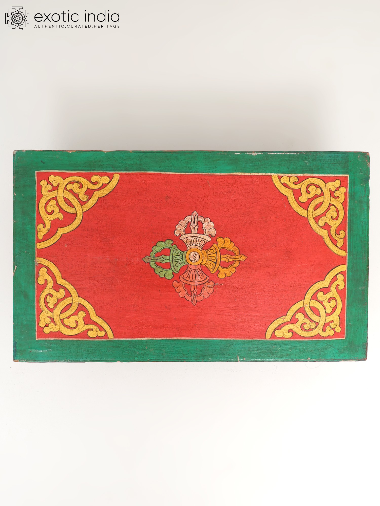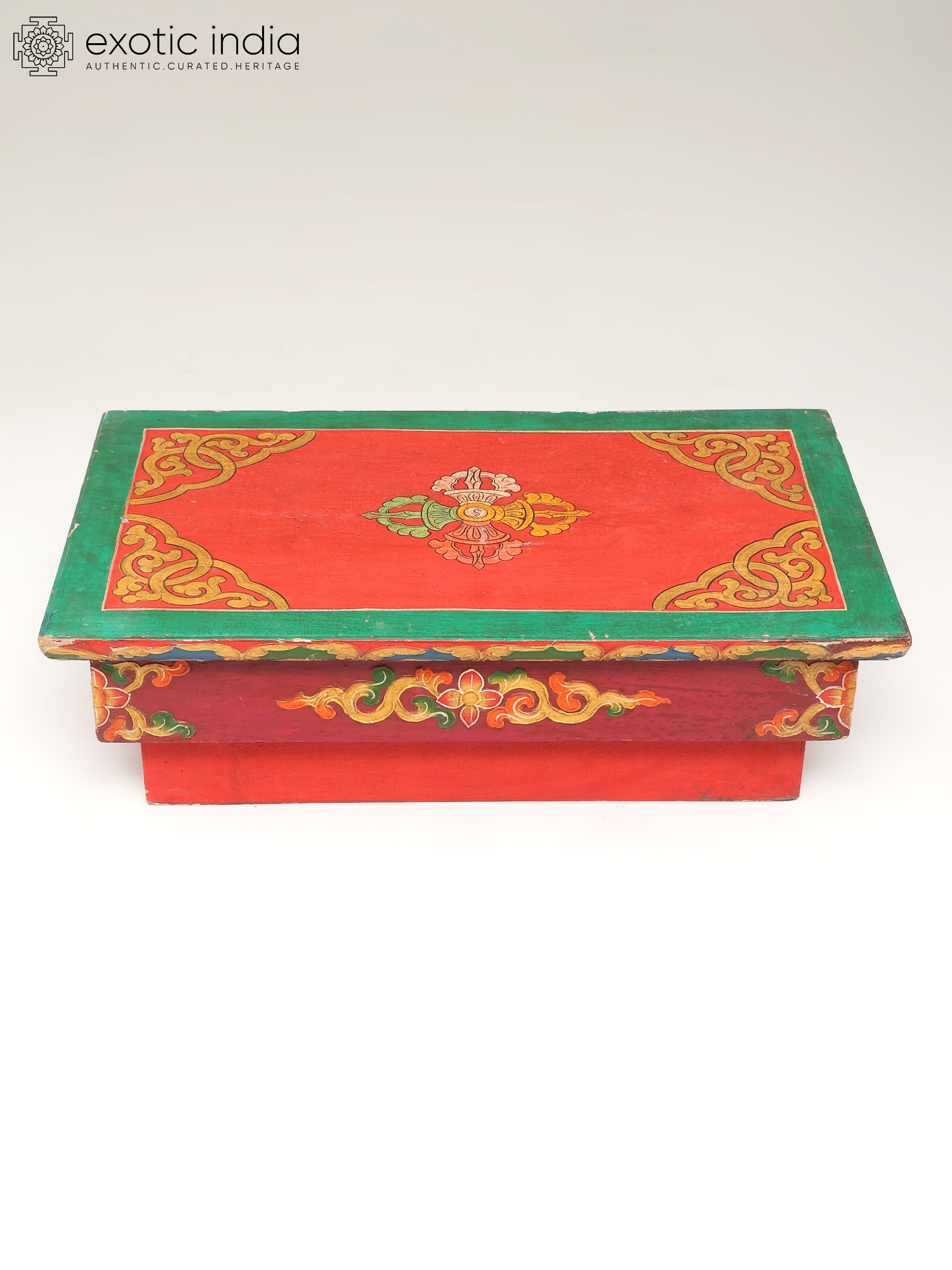 This meticulously crafted Tibetan Buddhist ritual desk, hailing from the heart of Nepal, is more than just a piece of furniture; it's a portal to a rich spiritual heritage. Its vibrant hues and intricate designs tell stories of devotion and tradition, reflecting centuries of Buddhist practice in the Himalayas. The desk's compact size (4.5 x 16.0 x 9.5 inches) makes it perfect for personal altars or smaller spaces, allowing you to create a sacred focus for your meditation and prayers. Constructed from durable wood, it embodies the timeless quality and enduring strength associated with the spiritual practices it serves. The rich red base, accented by the striking green and gold detailing, evokes the energy of fire and earth—elements fundamental in Buddhist cosmology.