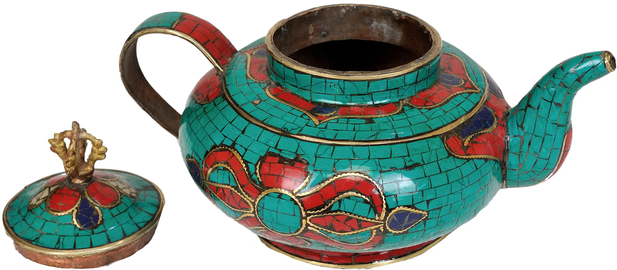 This exquisite ritual kettle, crafted from a union of brass and copper, is more than just an artifact; it is a conduit for spiritual devotion. Adorned with a vibrant mosaic of inlaid stones, it captures the essence of Tibetan Buddhist tradition. The intricate patterns, a symphony of turquoise, red, and deep blue hues, are reminiscent of mandalas and sacred geometry, inviting contemplation and inner peace. The golden accents, delicately tracing the inlaid stones, evoke the radiant light of enlightenment.