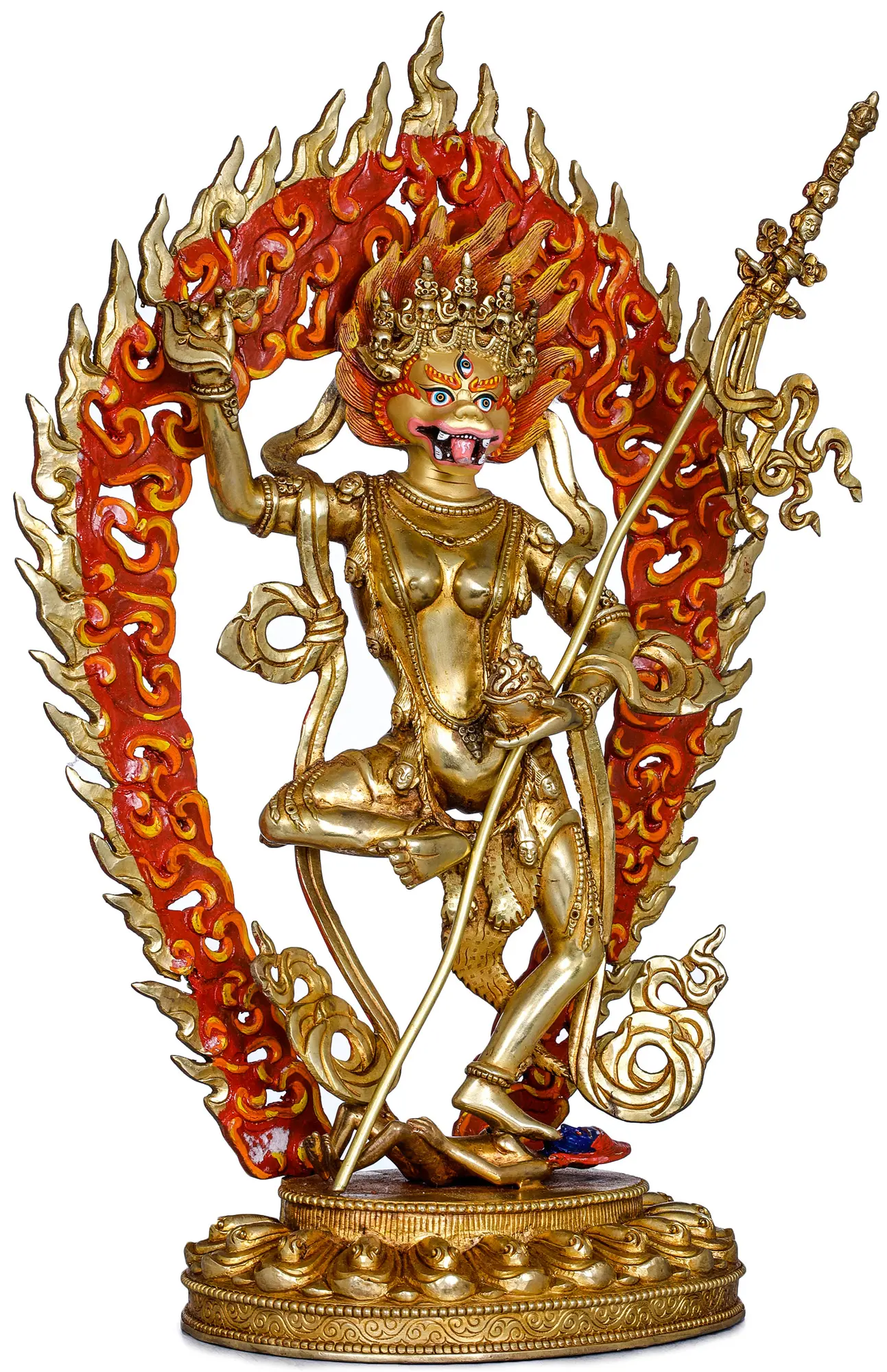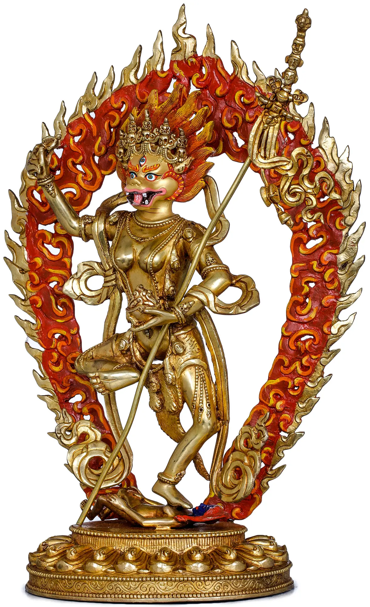 Now comes the most important part of Nepalese art which is gold gilding. This is done by the traditional fire gilding method. A mixture of mercury and 18K gold is applied on the surface of the statue and heat is applied using a flame torch. The result is that mercury evaporates along with impurities, leaving a pure 24K gold finish.