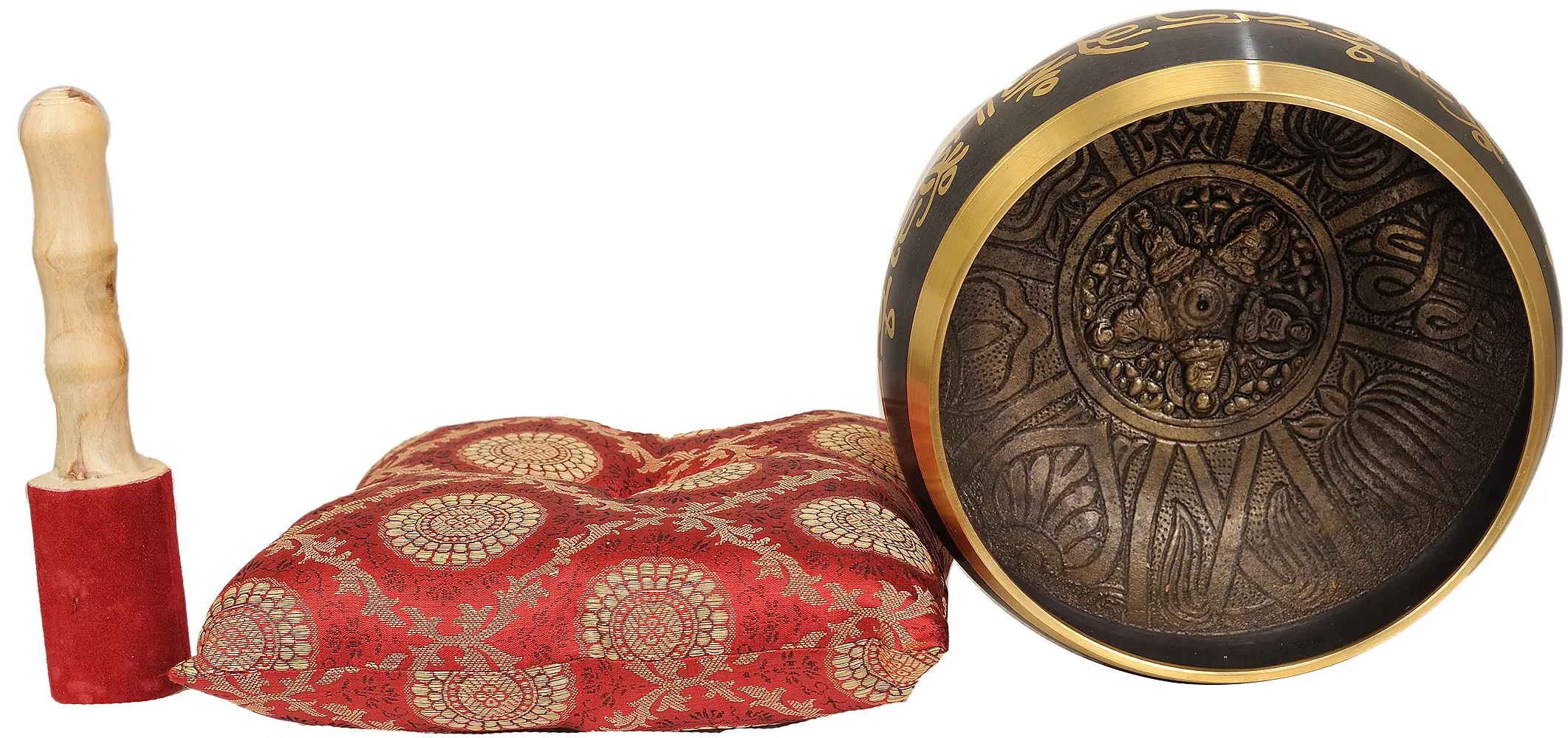 Tibetan Buddhist Singing Bowl with the Figures of Buddha Inside and Mantras Outside (with Cushion)