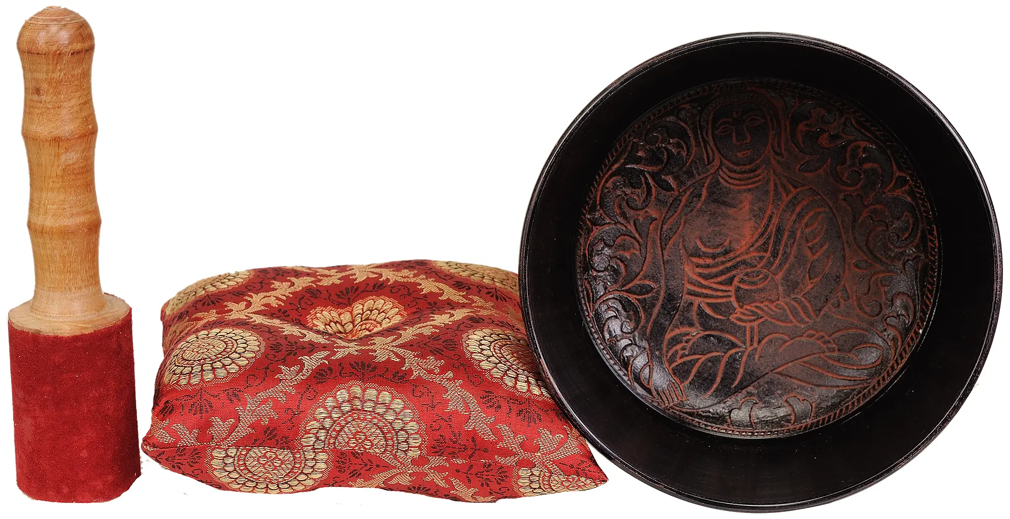 Tibetan Buddhist Singing Bowl with the Figures of Buddha Inside and Mantras Outside (with Cushion)