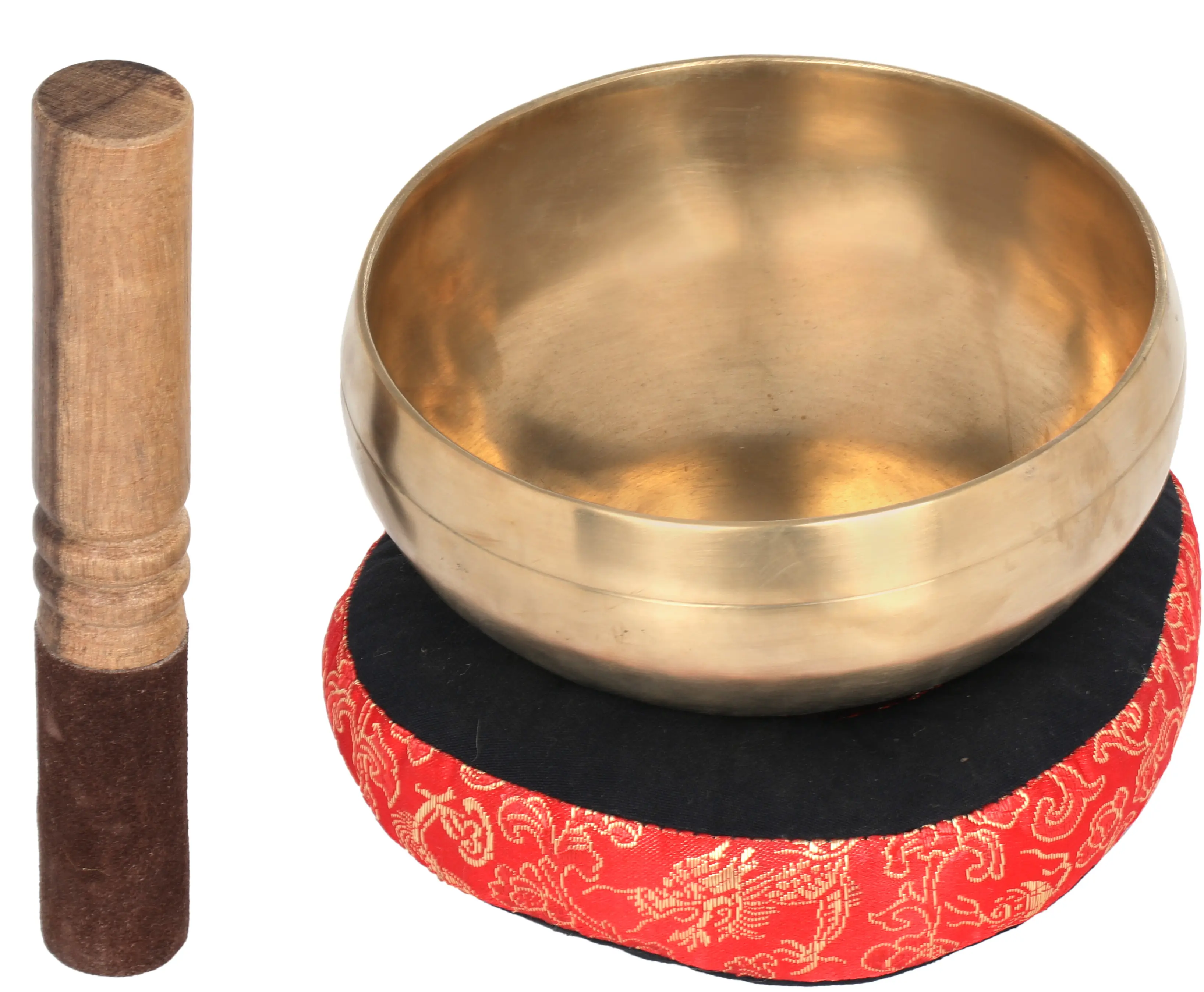 The act of striking and circling the rim of the bowl with its accompanying wooden mallet is a meditative ritual in itself. The gentle vibration that emanates can be felt not only through the hands but also perceived by the entire being. In Buddhist teachings, sound is considered a powerful tool for transformation. The vibrations generated by these bowls are believed to harmonize the body's energy centers, or chakras, promoting physical and emotional well-being. It is said that the ancient Siddhas, or enlightened beings, used these bowls to amplify their meditative states and to purify their surroundings. This singing bowl comes complete with a beautifully crafted wooden striker, designed for optimal resonance, and a traditional cloth cushion. The cushion, adorned with intricate red and gold patterns, not only provides a stable and elegant base for the bowl but also adds a touch of auspicious beauty to any space. The vibrant colors and detailed motifs on the cushion are reminiscent of the rich artistic heritage of Tibet, often symbolizing prosperity, good fortune, and spiritual awakening. Whether used in formal meditation, yoga practice, sound healing sessions, or simply as a decorative object to bring a sense of calm and serenity into your home, this singing bowl serves as a constant reminder of the power of presence and the beauty of mindful living.