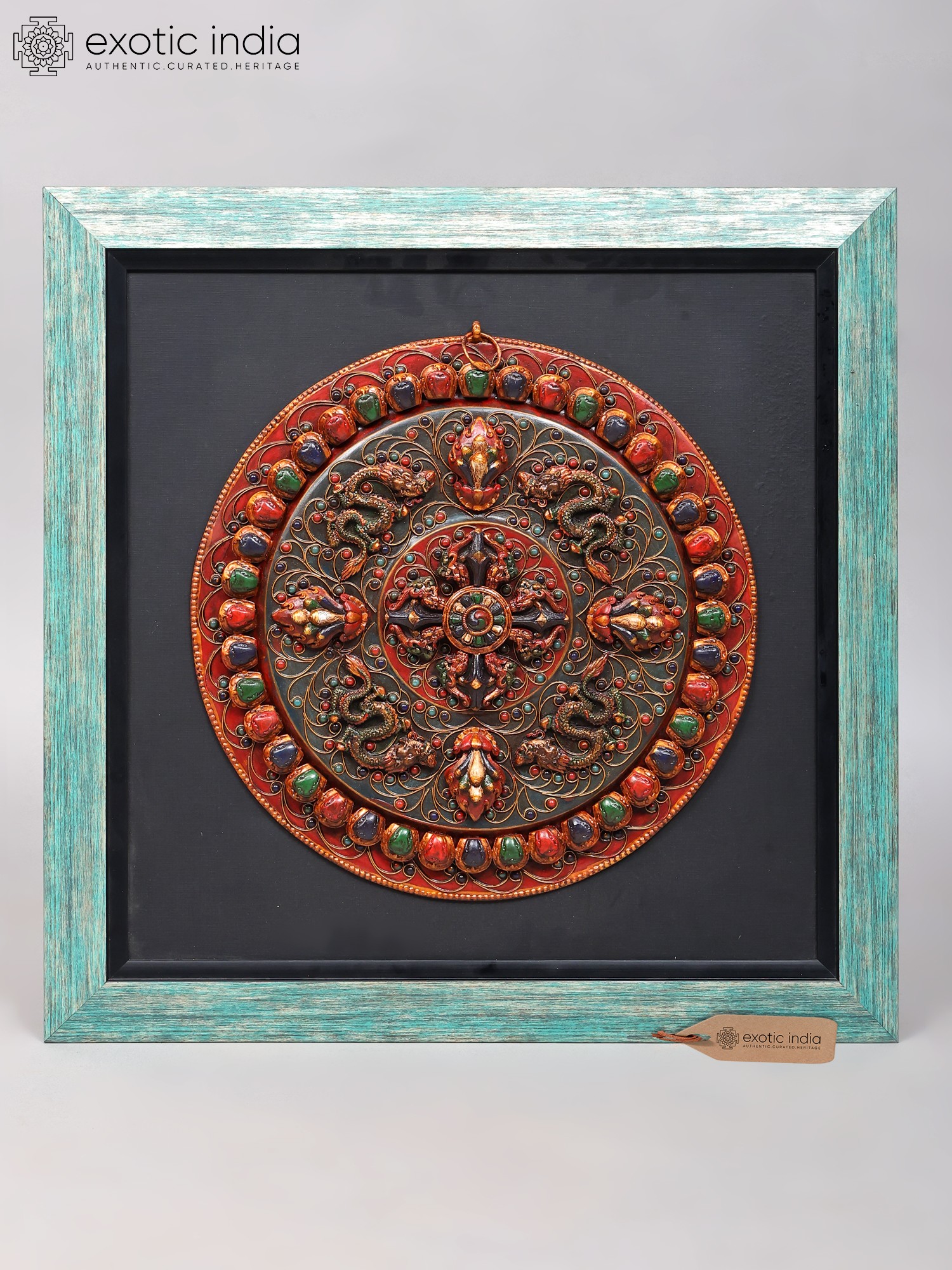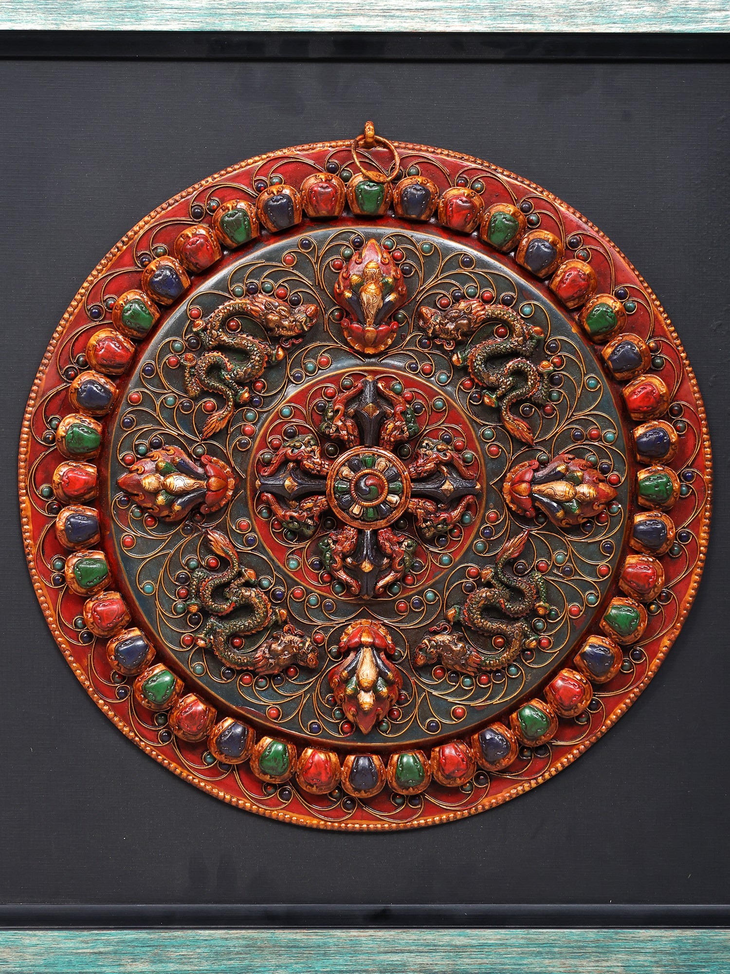 Tibetan Dragon Mandala Wall Art - 24" Wood Frame with Copper Accents