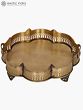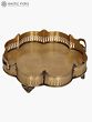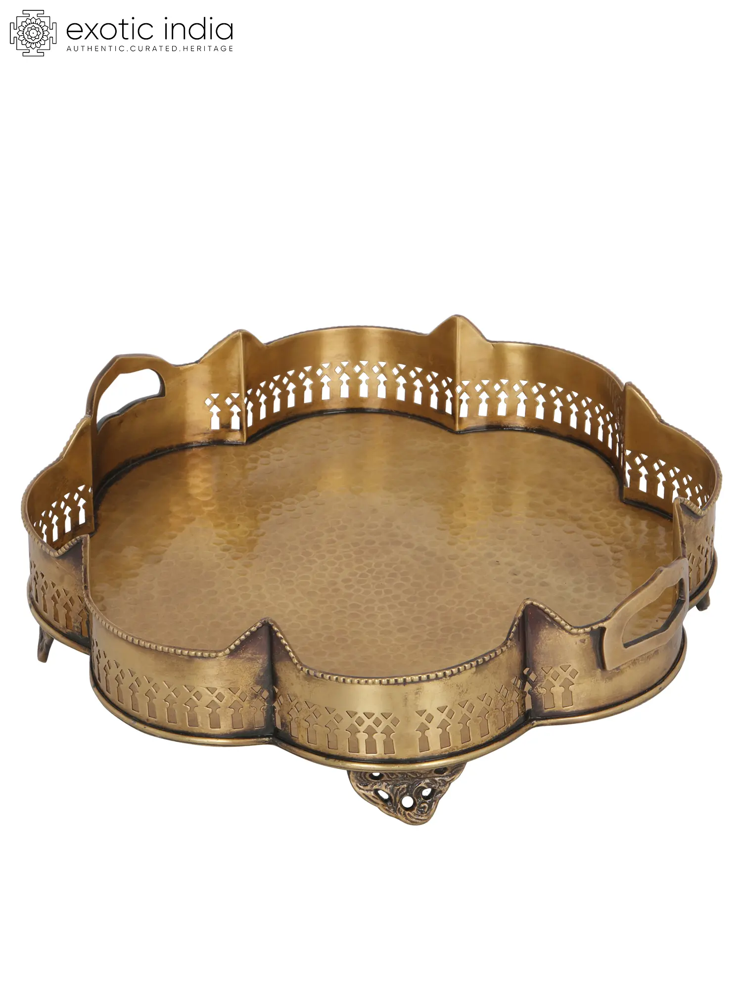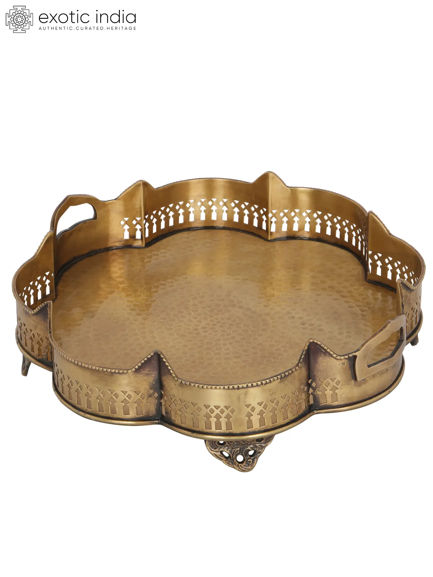 Crafted from high-quality brass, this tray showcases the time-honored technique of metal hammering. The surface of the tray is adorned with a delicate, all-over pattern of hammered dimples, creating a subtle play of light and shadow that lends depth and character to the piece. This textured finish not only adds visual appeal but also speaks to the meticulous handiwork involved in its creation. The raised border features an openwork design, reminiscent of traditional filigree, allowing for a glimpse of whatever rests beneath, further enhancing its elegant appeal. The sturdy, ornate feet elevate the tray, adding a touch of regal sophistication.