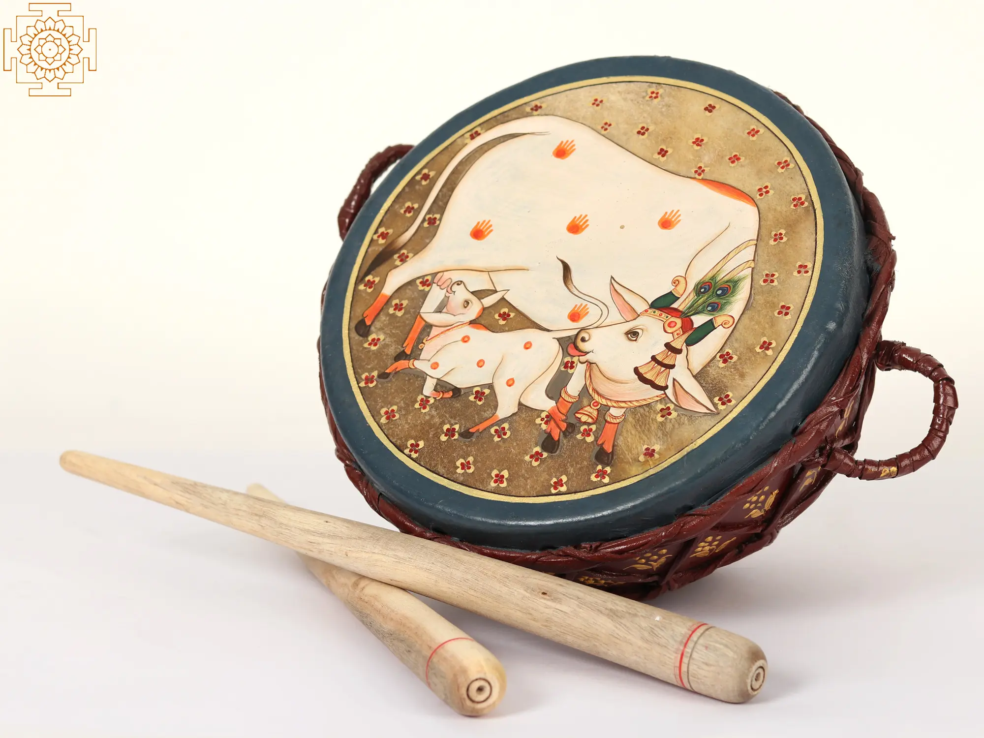 This traditional drum is made of wood and has a cloth top painted with the Pichhwai cow. Kamdhenu is thought to be the Pichhwai cow. The image of a cow with the holy handprints of Srinathji Maharaj (Krishna) in Pichhwai style painting is considered lucky. The cow on the drum is wearing fortunate peacock feathers, a symbol of Krishna, and is feeding a calf. This home decor piece is beautifully crafted to fill your heart with feelings of love and affection, as the cow is Lord Krishna's favourite animal.